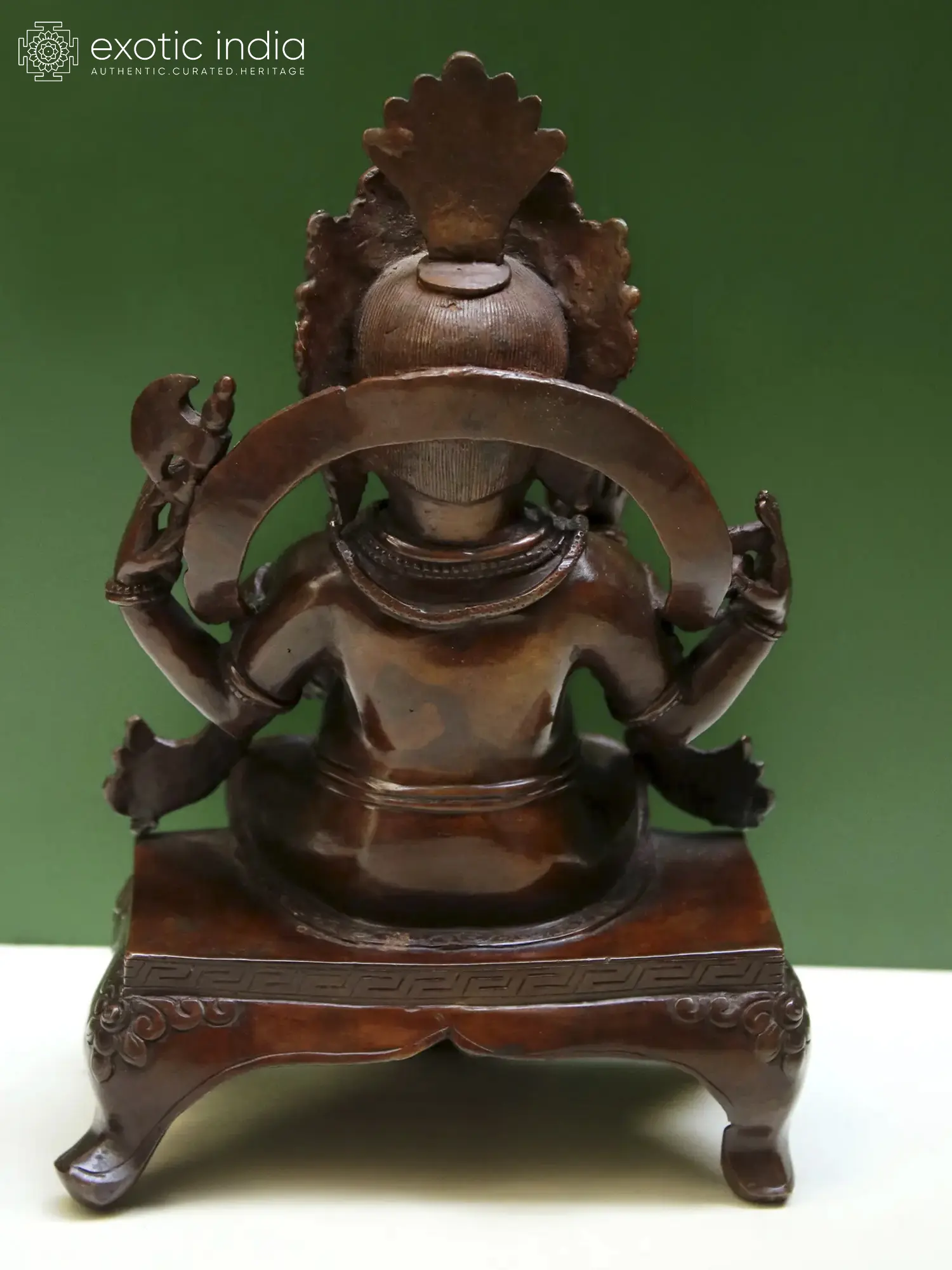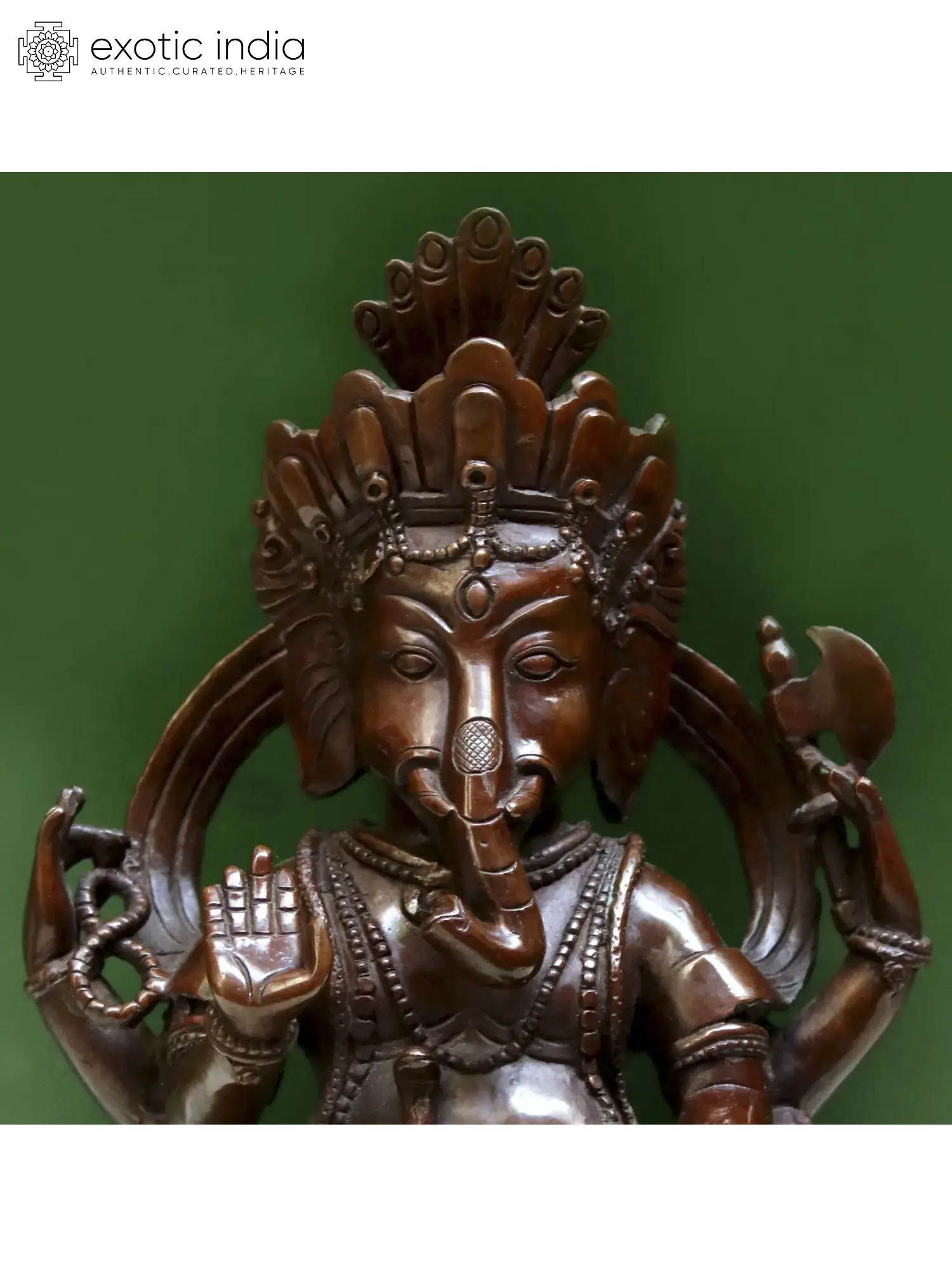Ganesha’s ornate crown is a traditional Nepalese headgear of deities. A third eye adorning his forehead is also a prominent element in Nepalese sculptures of Ganesha, which emphasize his potent energies as a knower of occult and auspicious knowledge.