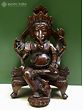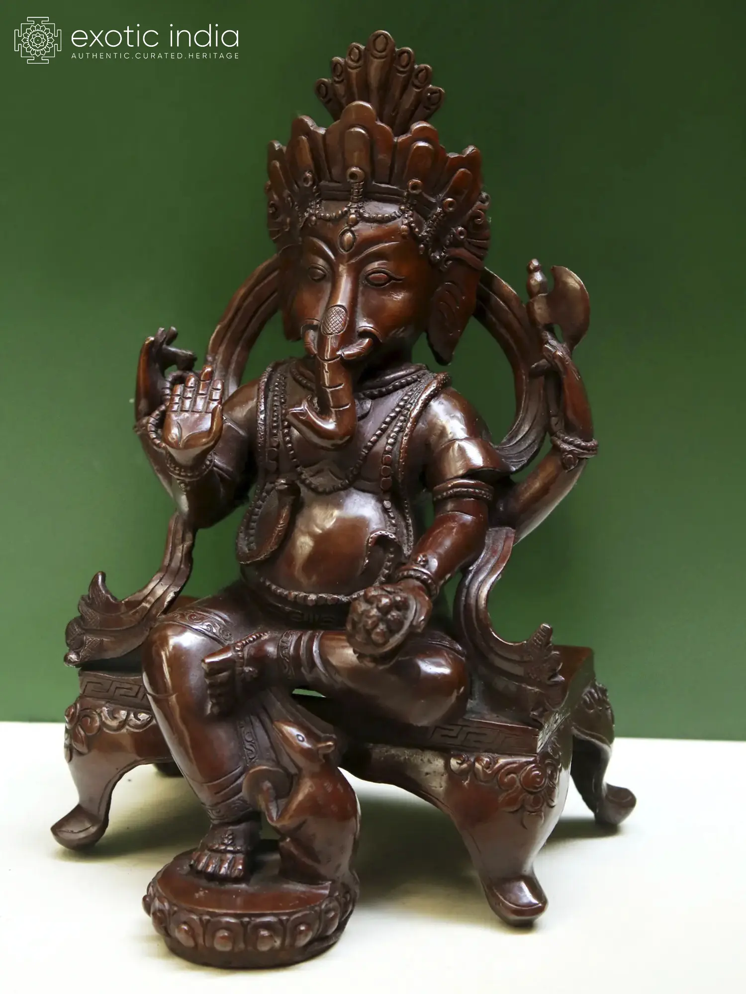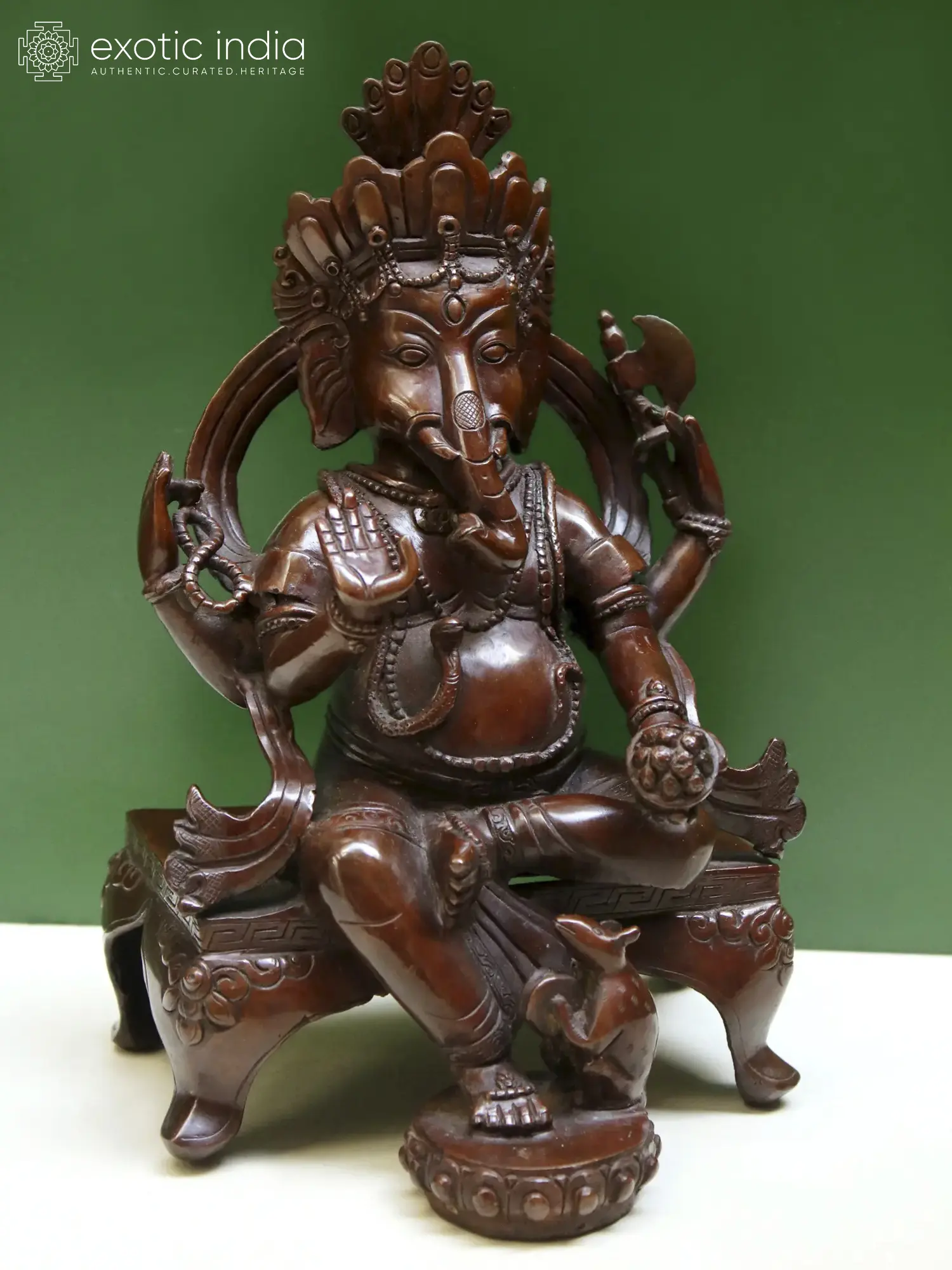 Ganesha in Nepalese Hinduism is revered as the protector of crops and auspiciousness of homes and as a cosmic guardian who eternally looks after his devotees. As an evocation of the powers of Ganesha, this copper statute from Nepal presents the elephant-headed Hindu god in a unique iconography that blends the traditional Indian attributes with the idiom of Nepal Valley. Ganesha sits on a royal throne, beautifully adorned, in his Chaturbhuja or four-armed form, carrying his characteristic attributes- Modak and ax, along with a rosary in his secondary right hand.