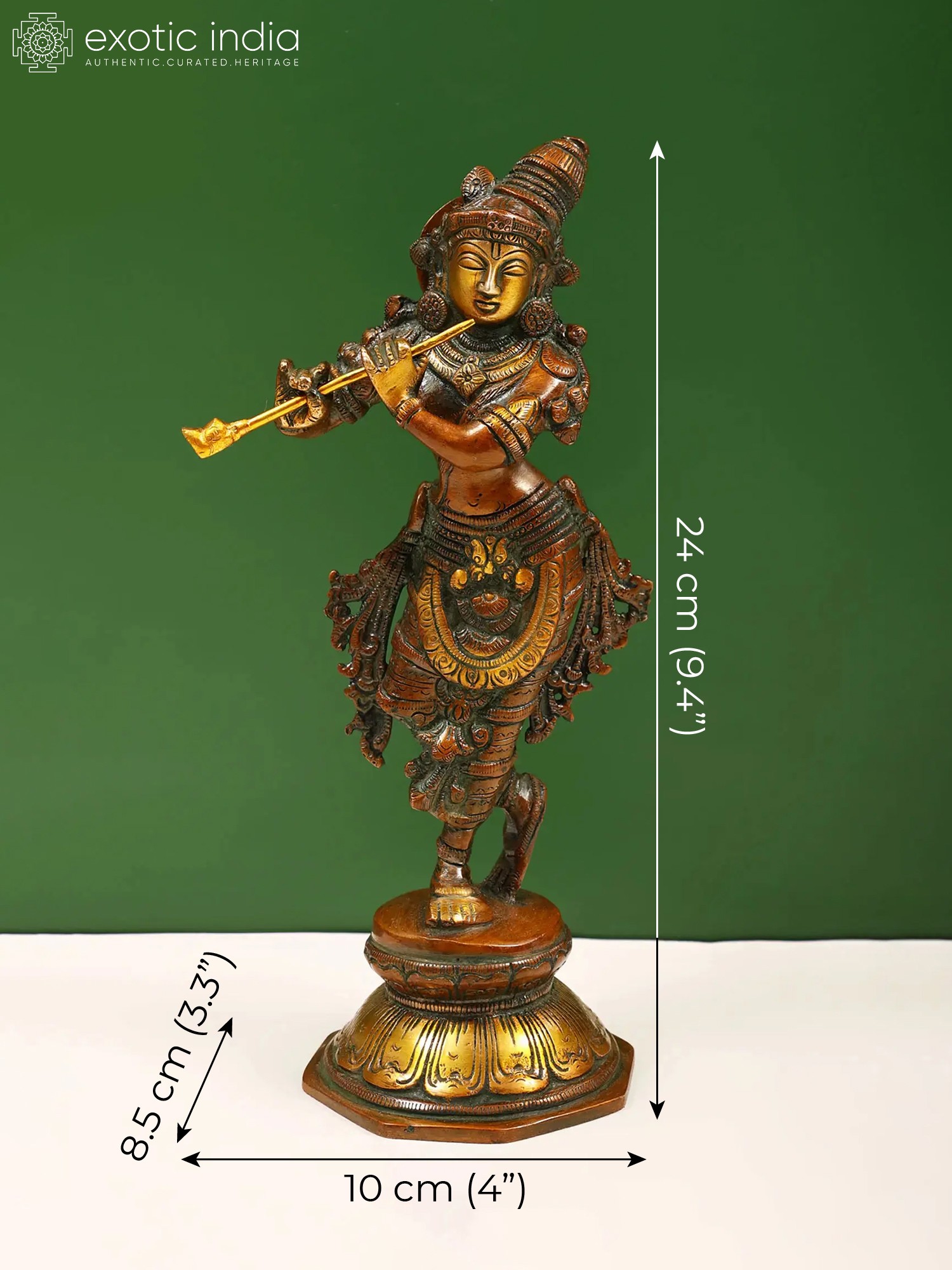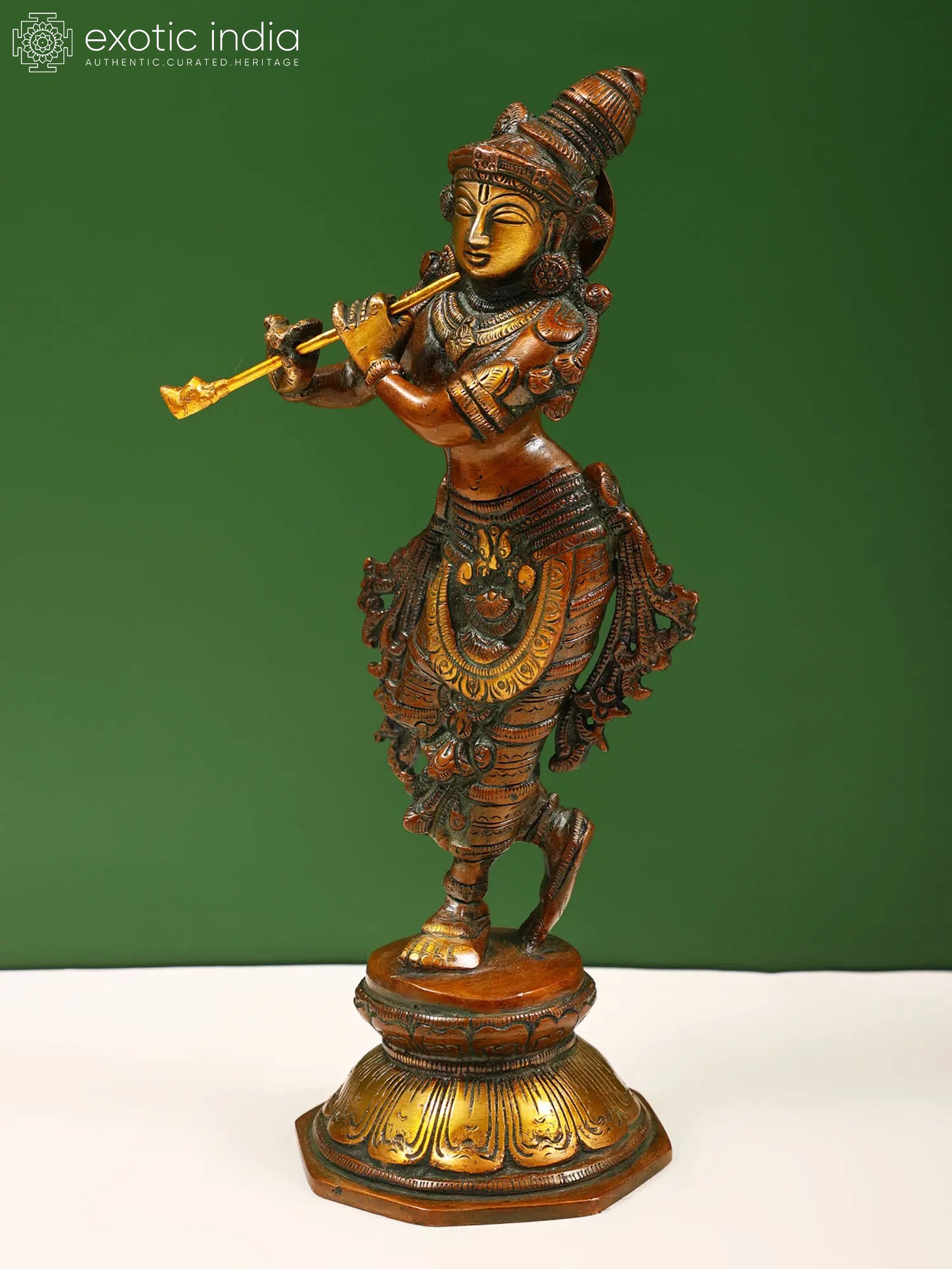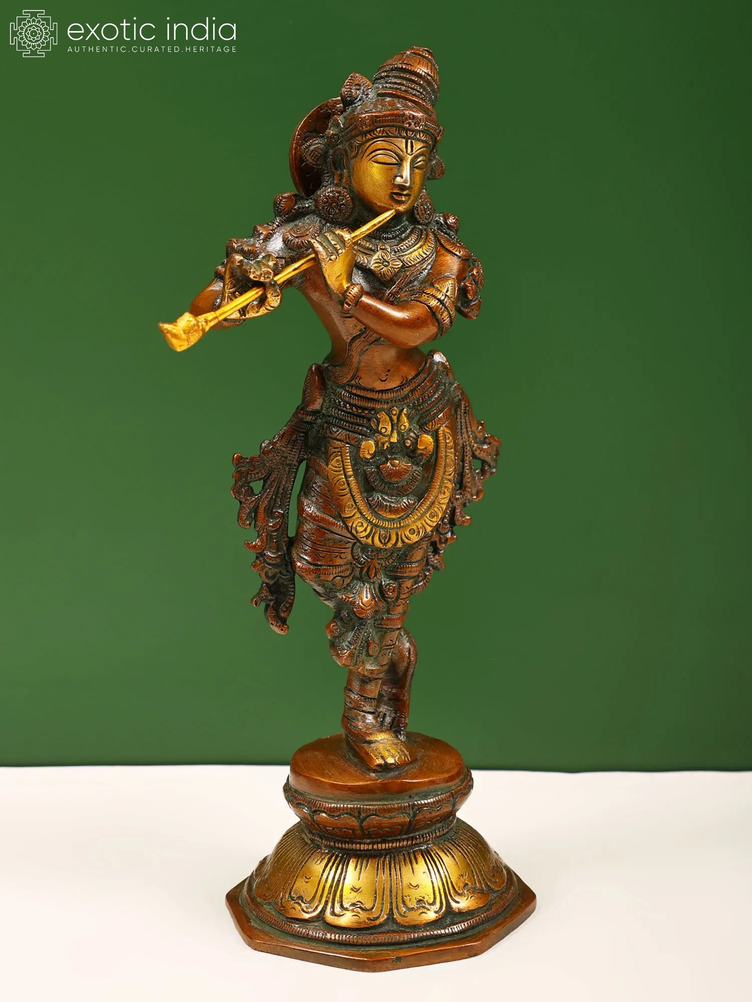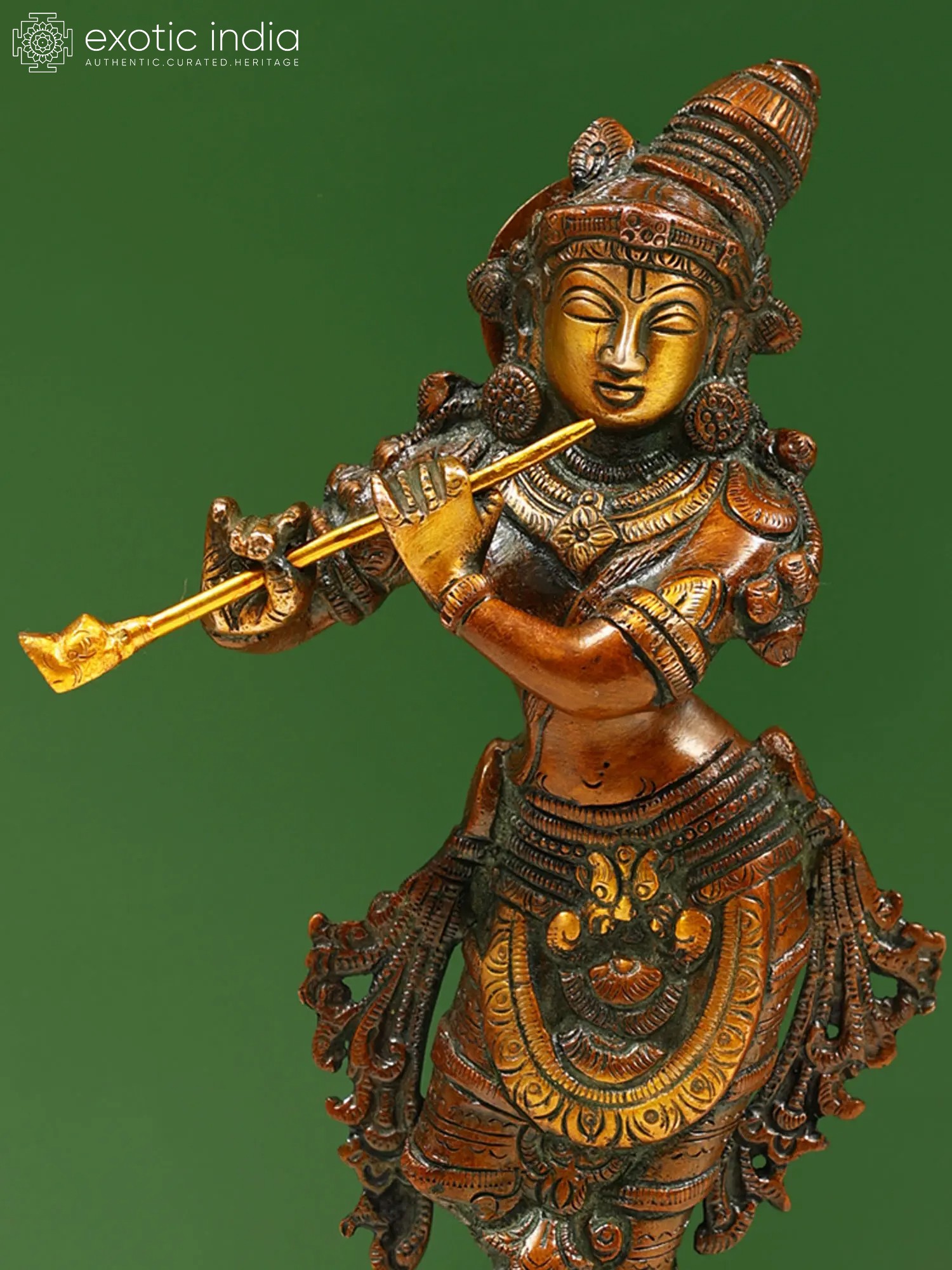 The Lord in this sculpture is shown like a silent ocean filled with ecstasy and tranquility. His dark complexion appears just like a fresh dark cloud carrying a huge amount of mercy within it to be showered upon the surrendered souls. His moonlike face contains eyes resembling the lotus petals and all the gopis are allured by the soft and gentle smile on His face. He places His divine flute Venu on to His sweet lips and plays upon it, and the sound of which nourishes the hearts of His devotees.