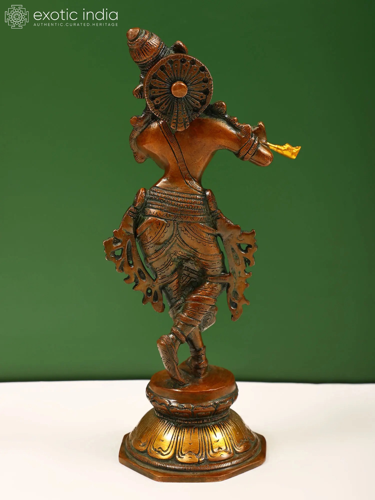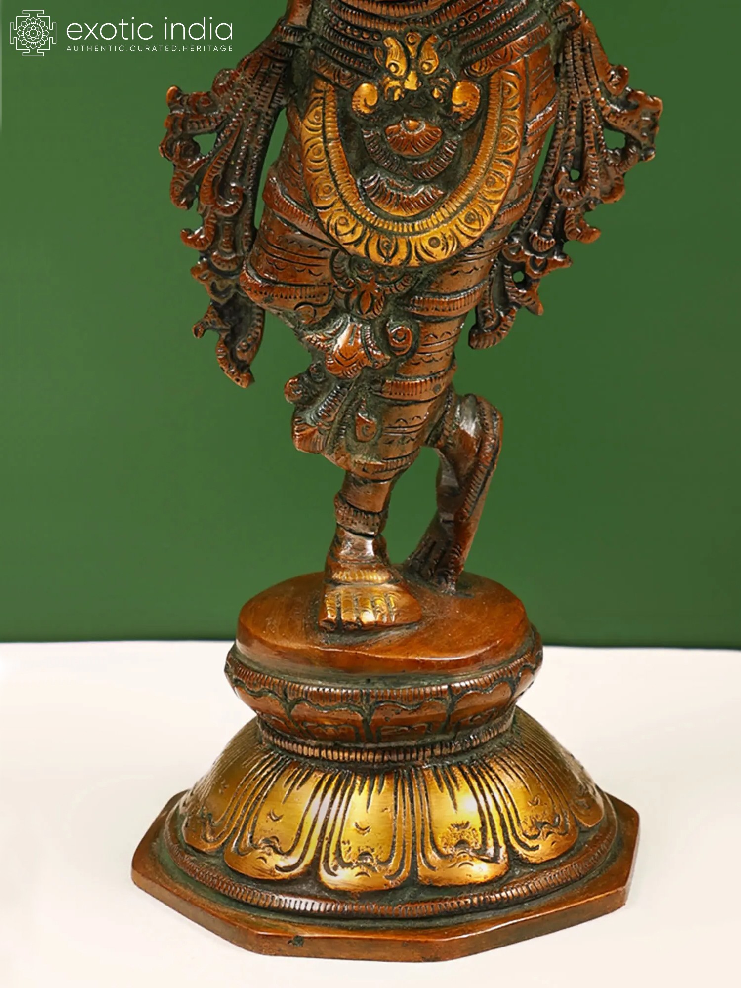 Here stands the Supreme Lord Krishna on a small upturned lotus pedestal in His most attractive three-fold bending form (tribhanga). Krishna is the source of all pleasure and also the cause of all causes. What to speak of His beautiful bodily features and wonderful activities in the land of Vraja that stole the hearts of all the inhabitants of Vrindavan. Although He is the Supreme Personality of Godhead, He appeared like an ordinary boy and all the damsels and cowherd boys loved to play with Him.