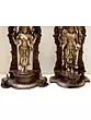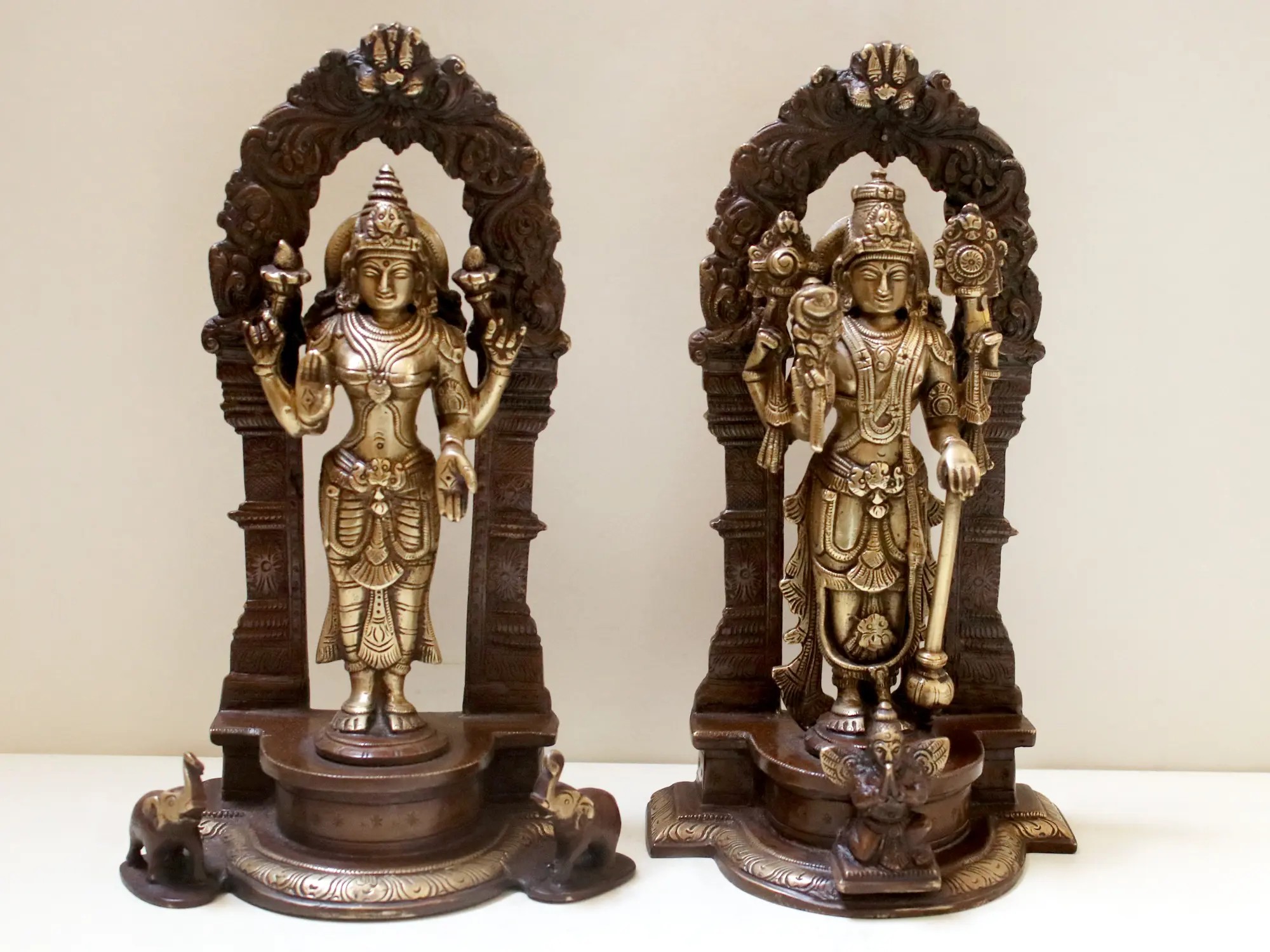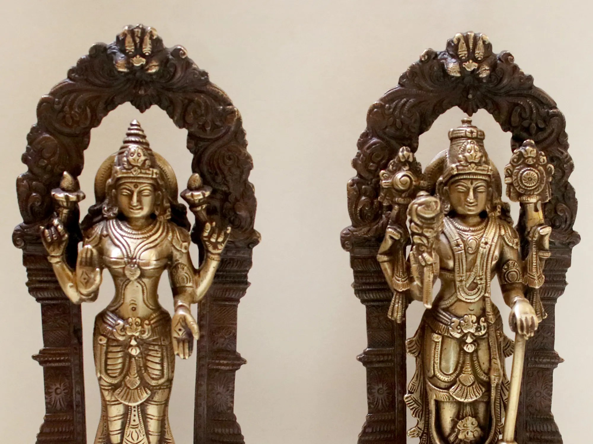 This exquisite brass statue captures the divine union of Lord Vishnu and Goddess Lakshmi, presented within a magnificently sculpted floral aureole. Crafted with exceptional skill in India, this piece is more than just an idol; it is a testament to ancient artistry and spiritual devotion. The lustrous brass, meticulously polished, emanates a warm, inviting glow, reminiscent of the divine radiance of the deities themselves. Each detail, from the intricate carvings on the ornate pillars to the serene expressions on the faces of Vishnu and Lakshmi, speaks of a profound understanding of their divine roles and symbolism. Vishnu, the preserver of the universe, is depicted in his majestic form, holding his divine attributes, ready to uphold cosmic order. His presence signifies protection, stability, and the cyclical nature of existence. Lakshmi, the goddess of wealth, fortune, and prosperity, stands beside him, bestowing her blessings. Their eternal partnership is a powerful symbol of balance, abundance, and the harmonious coexistence of spiritual and material well-being. In Hindu mythology, Lakshmi emerged from the churning of the cosmic ocean (Samudra Manthan), signifying her association with all that is auspicious and valuable. It is believed that worshipping Vishnu and Lakshmi together brings not only material prosperity but also spiritual fulfillment and peace.