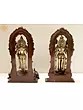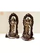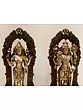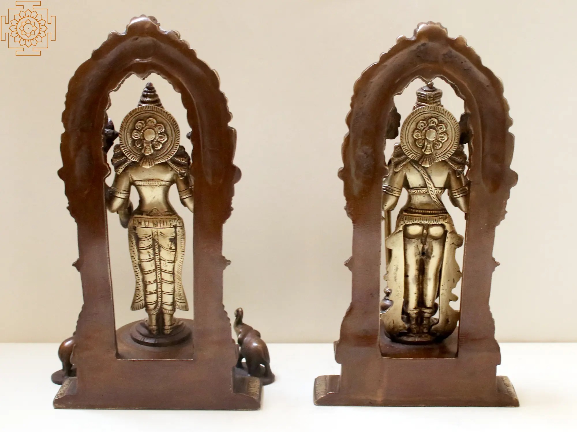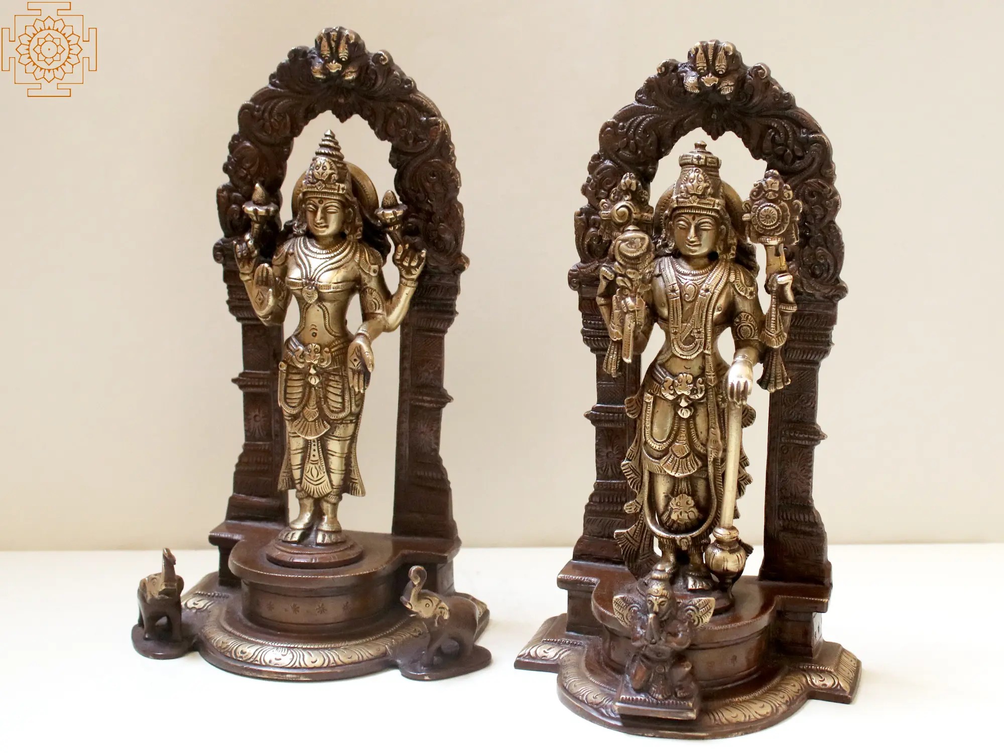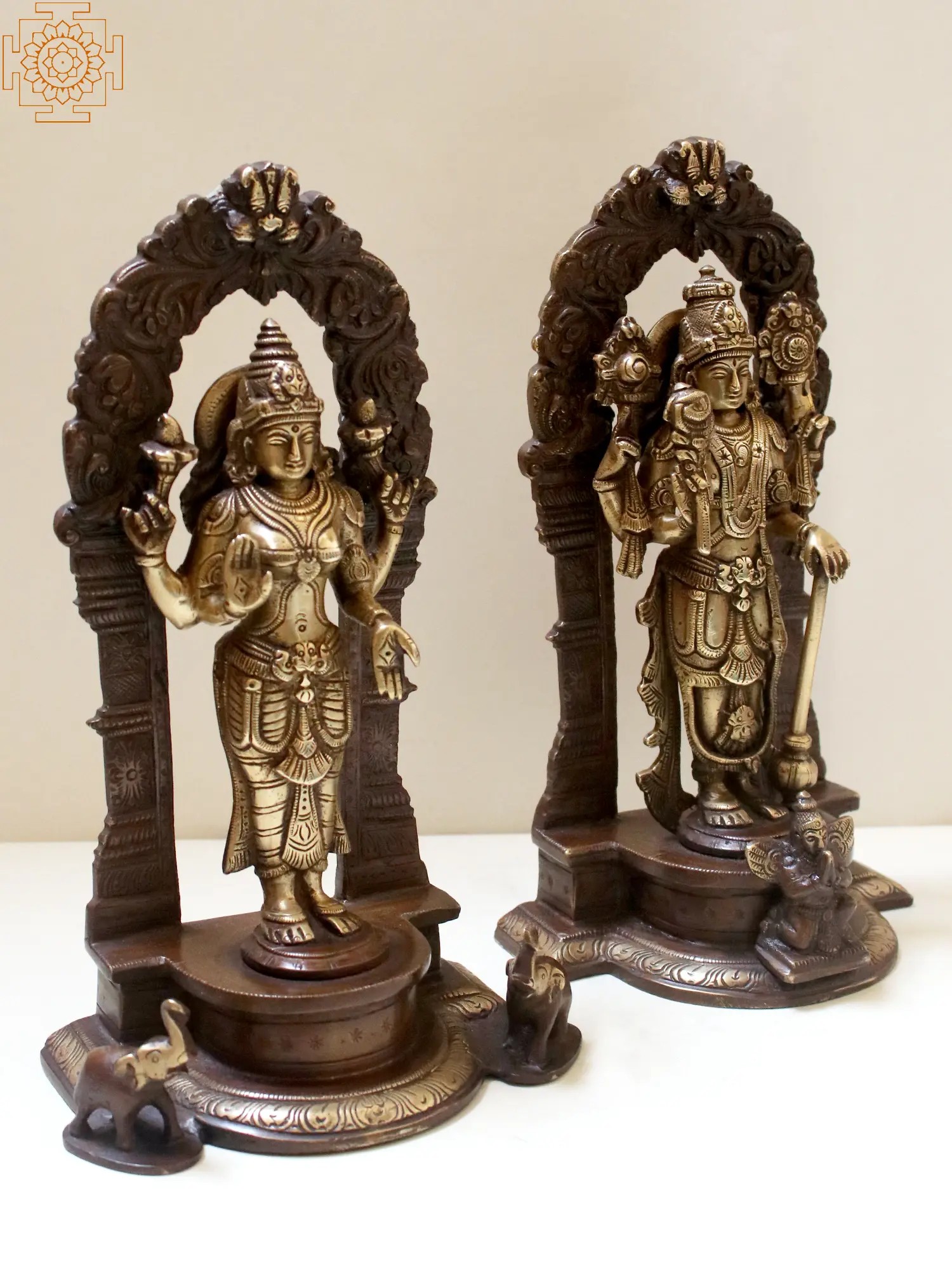 Immerse yourself in the divine aura of this handcrafted brass ensemble of Lord Vishnu and Lakshmi Ji. Originating from the skilled artisans of India, this set depicts the deities in resplendent detail, each adorned with symbols intrinsic to their mythos. Lord Vishnu, the preserver of the universe, stands with his consort Lakshmi, the goddess of wealth and prosperity, both under an ornate floral aureole signifying their celestial abode.