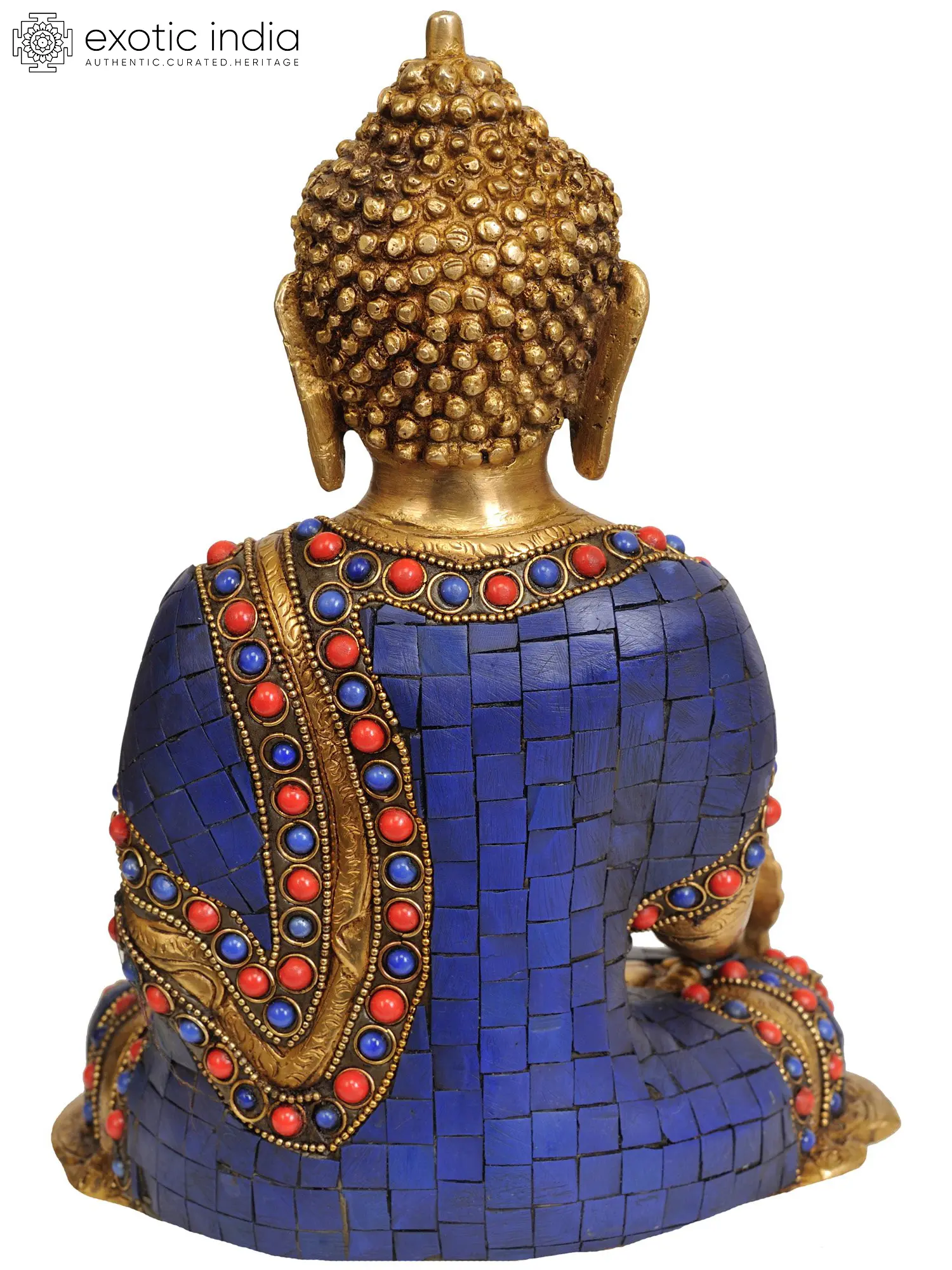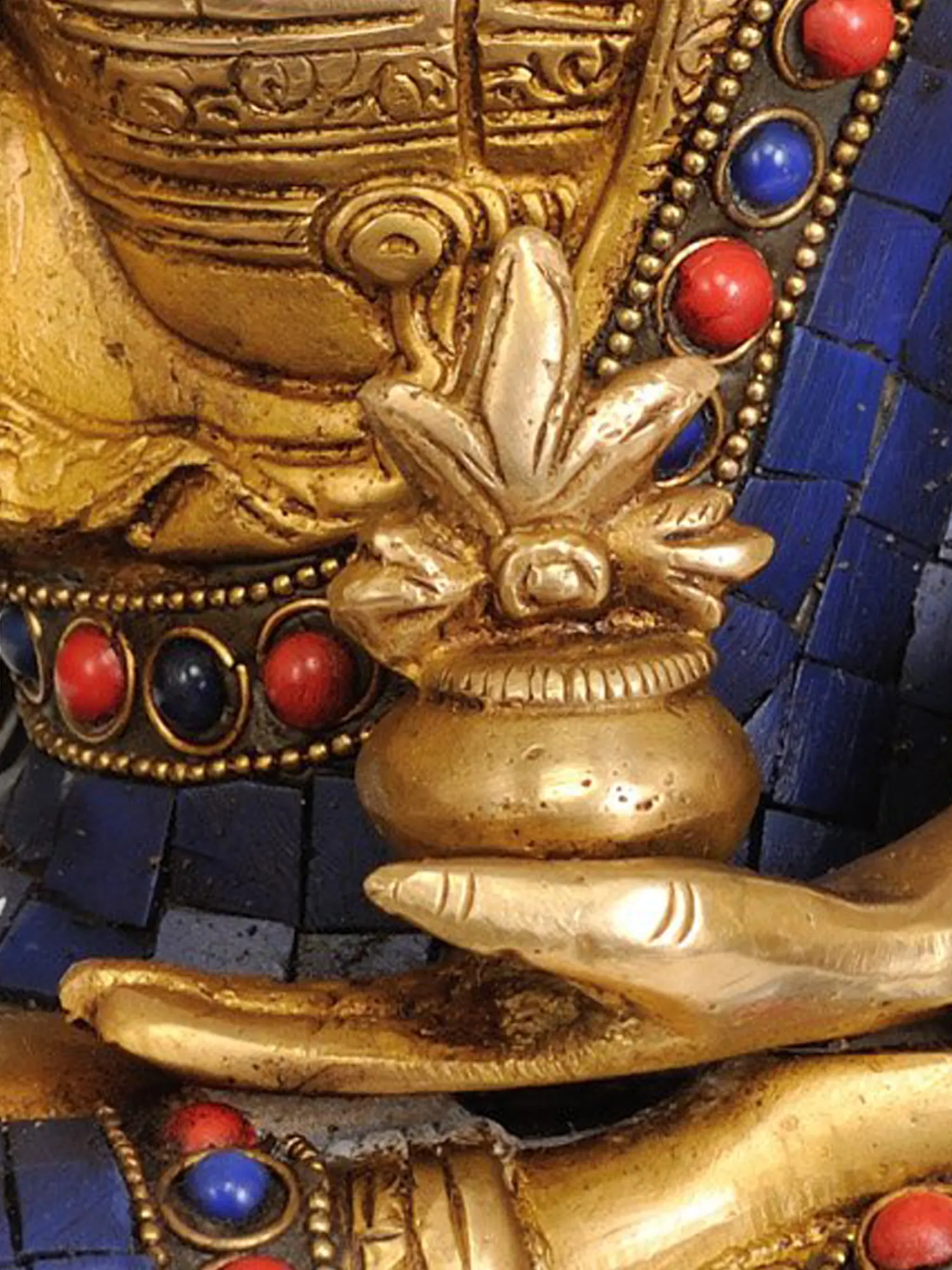 Crafted from high-quality brass, this statue showcases the meticulous skill of Indian artisans. The warm, lustrous sheen of the brass embodies the purity and enlightenment of the Medicine Buddha. The intricate detailing, from the serene expression on his face to the delicate folds of his robes, speaks to a deep understanding of Buddhist iconography. The robes themselves are adorned with a captivating inlay of vibrant blue and red stones, bordered by intricate golden patterns. The blue stones, often representing lapis lazuli, evoke the boundless sky and the vastness of consciousness, while the red stones, akin to coral, symbolize life force and vitality. This combination further enhances the spiritual and aesthetic appeal of the deity. The posture of the Medicine Buddha in this representation is significant. He is shown seated in a meditative pose, often the lotus position, with his right hand resting on his knee, palm facing outward in the gesture of boon-granting (varada mudra), or sometimes extended towards the earth. His left hand typically rests in his lap, holding an alms bowl filled with the nectar of immortality, or the medicinal plant Arura. This statue, with its peaceful countenance and the symbolic gesture of healing, serves as a powerful reminder of the inherent potential for well-being and spiritual liberation that resides within us all.