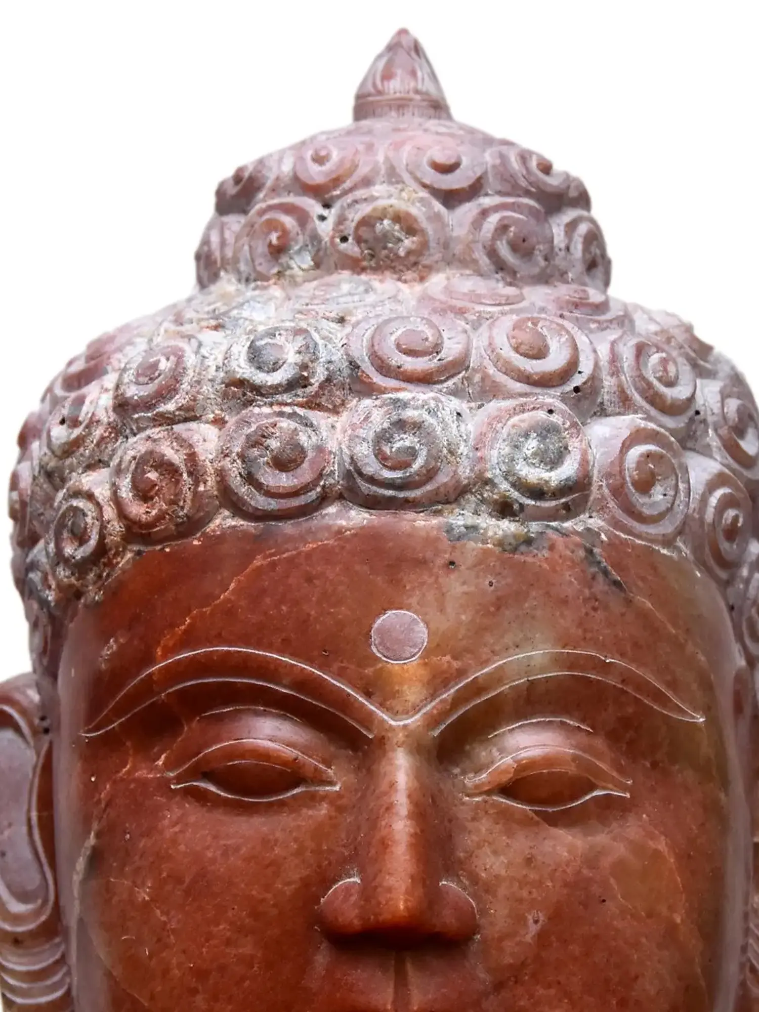 This exquisite representation of the meditating Gautama Buddha is carved from rich red stone, a material that lends a grounding and vibrant energy to the sculpture. The Buddha's face is sculpted with profound tranquility, his eyes gently closed, embodying a deep state of inner peace and enlightenment. The curls of his hair, meticulously rendered, lead up to the ushnisha, the cranial protuberance symbolizing his great wisdom and spiritual attainment. A subtle urna, a dot between the eyebrows, further signifies his awakened consciousness. The serene expression is both captivating and inspiring, inviting the viewer to pause and reflect.