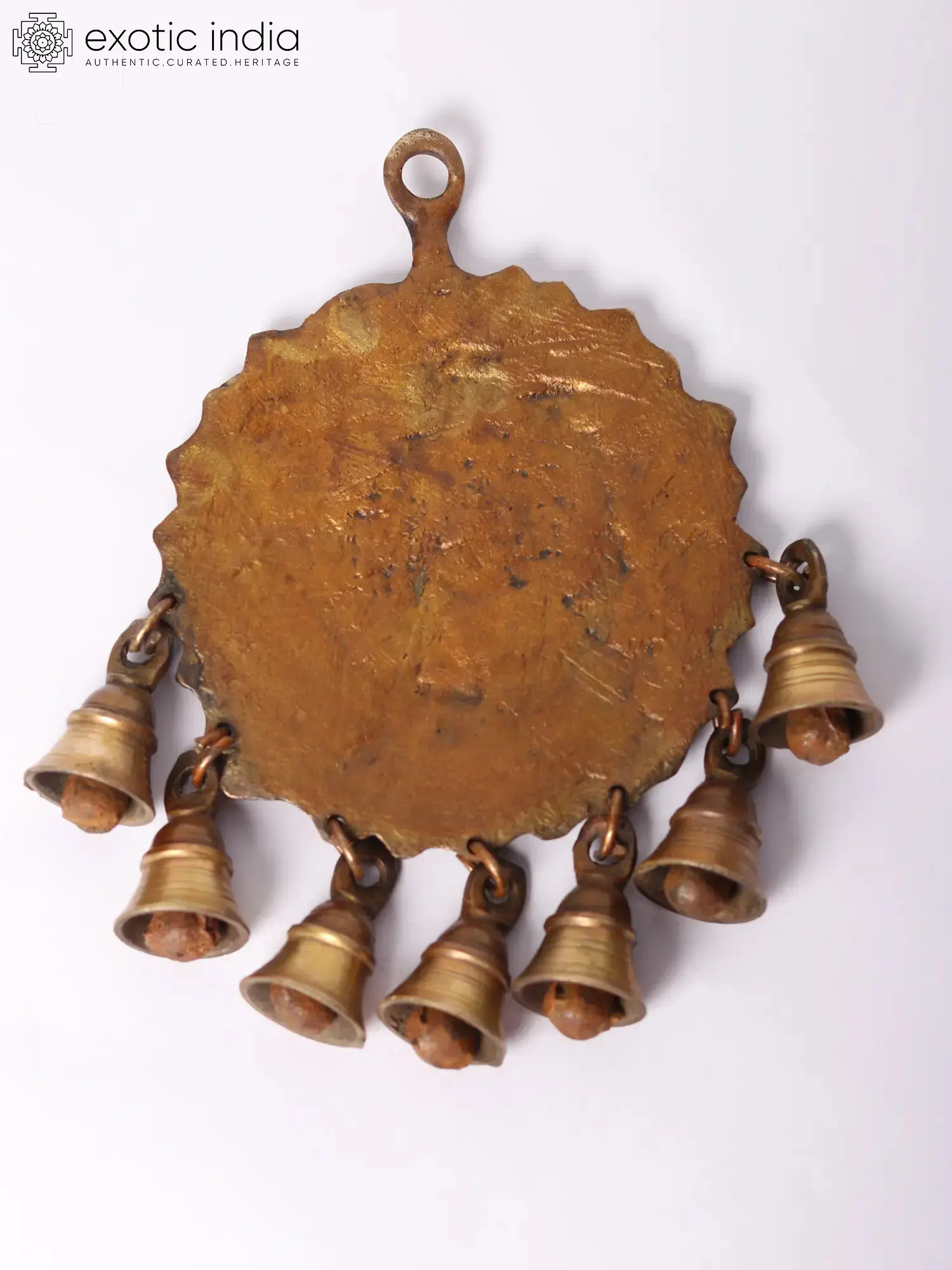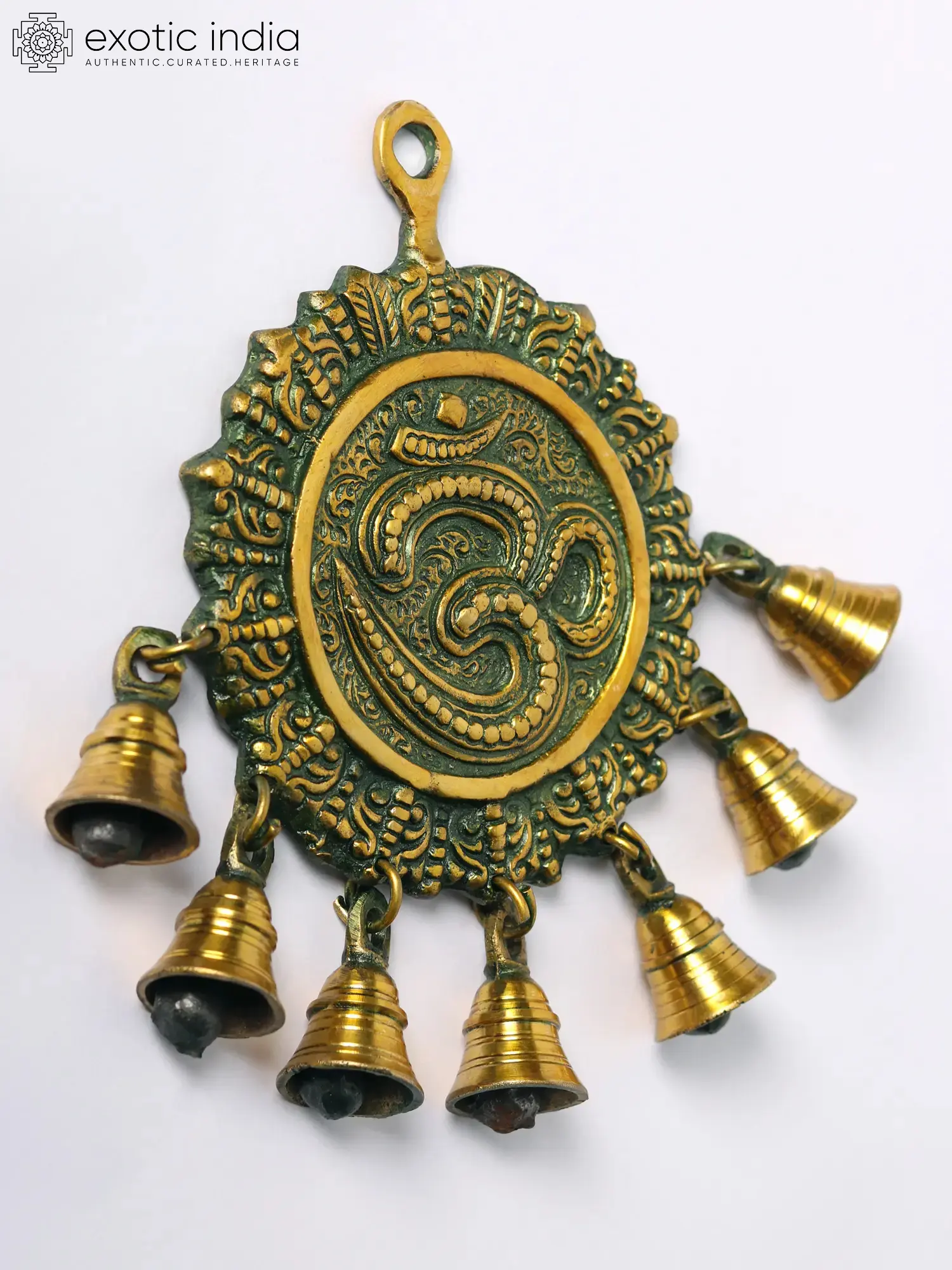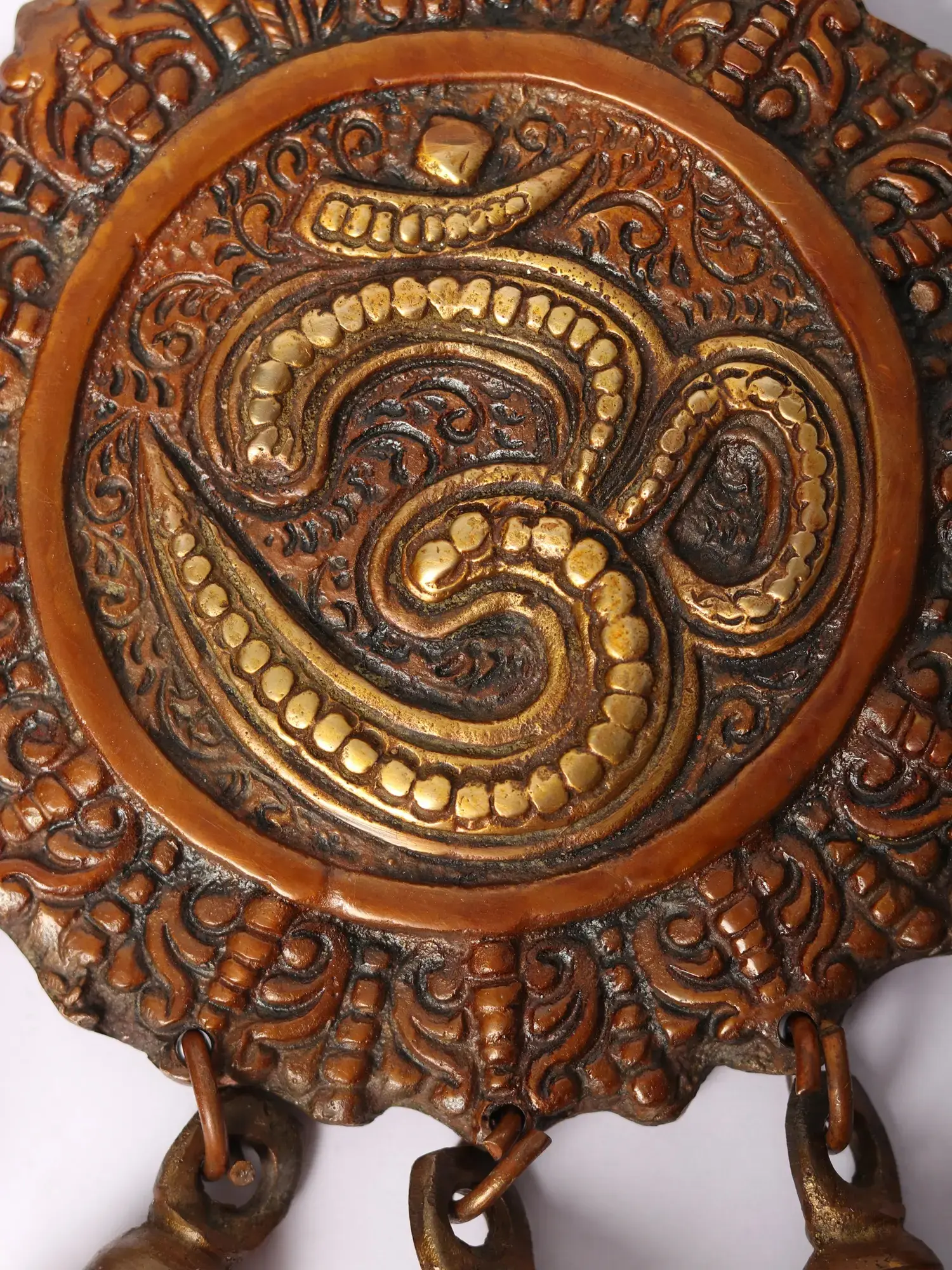 This brass wall hanging OM (AUM) exudes peace and charm. It is created like a bloomed flower surrounding a central Om symbol made with brass-colored dots for extraordinary divine beauty. The wall-hanging base is adorned by six bell-like objects, which produce a pleasant melody when tinkle. On the exterior, it would look wooden but be brass, combining beauty and strength. This wall hanging is not just an eye-catching addition to your space but also has spiritual connotations. It is, therefore, a perfect addition to the decor and oneself as it can be used for both decoration and introspection.