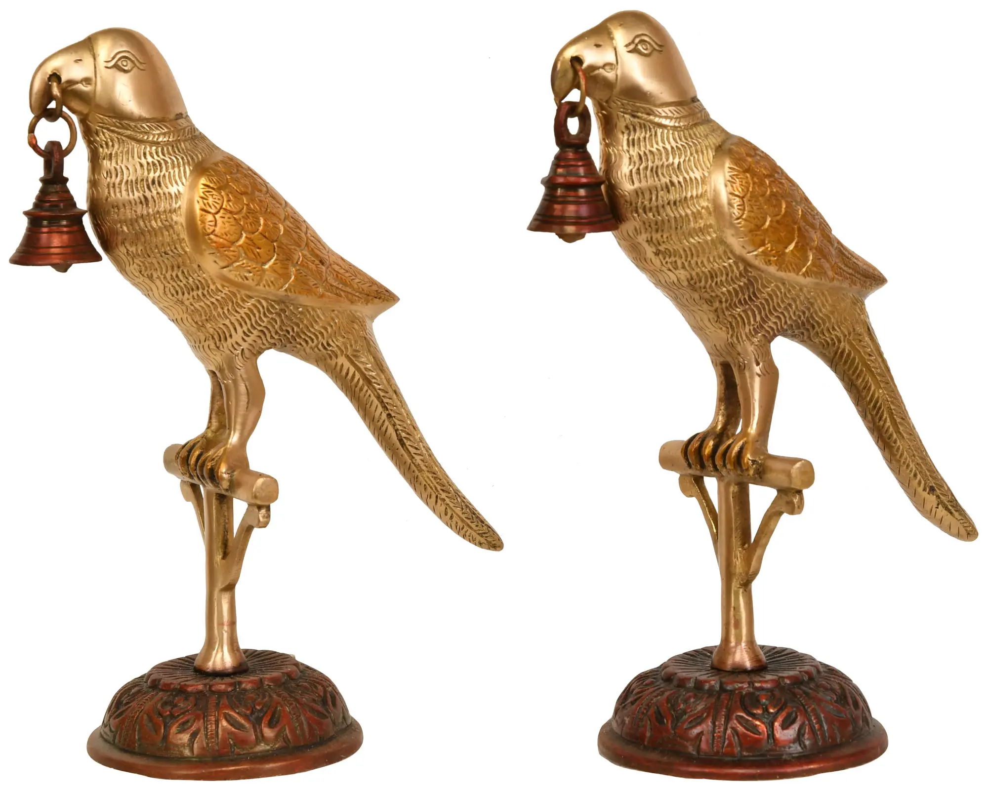 This pair of parrots in brass is a fine example of using a brown lacquer finish to enhance the look of a sculpture. The pair consists of two identical Parrots sitting on a stand and biting a bell. The parrot, or Sukah, is considered sacred in Hindu tradition and symbolizes prosperity. This set is both a stunning work of art and a holy object which carries deep symbolism.