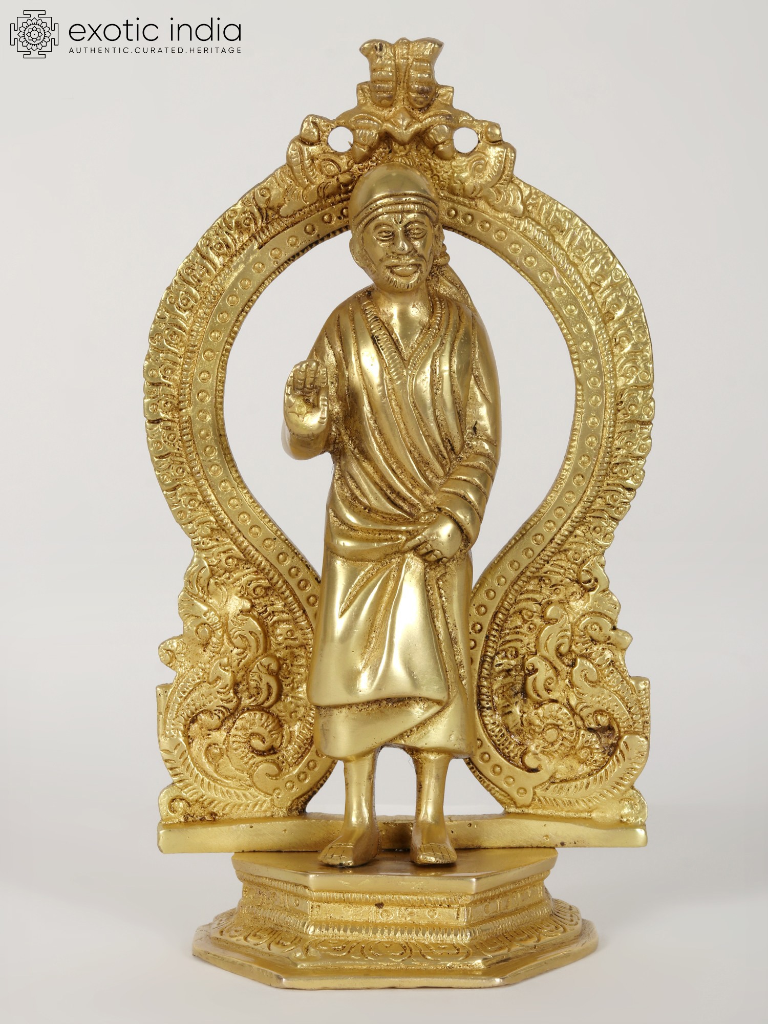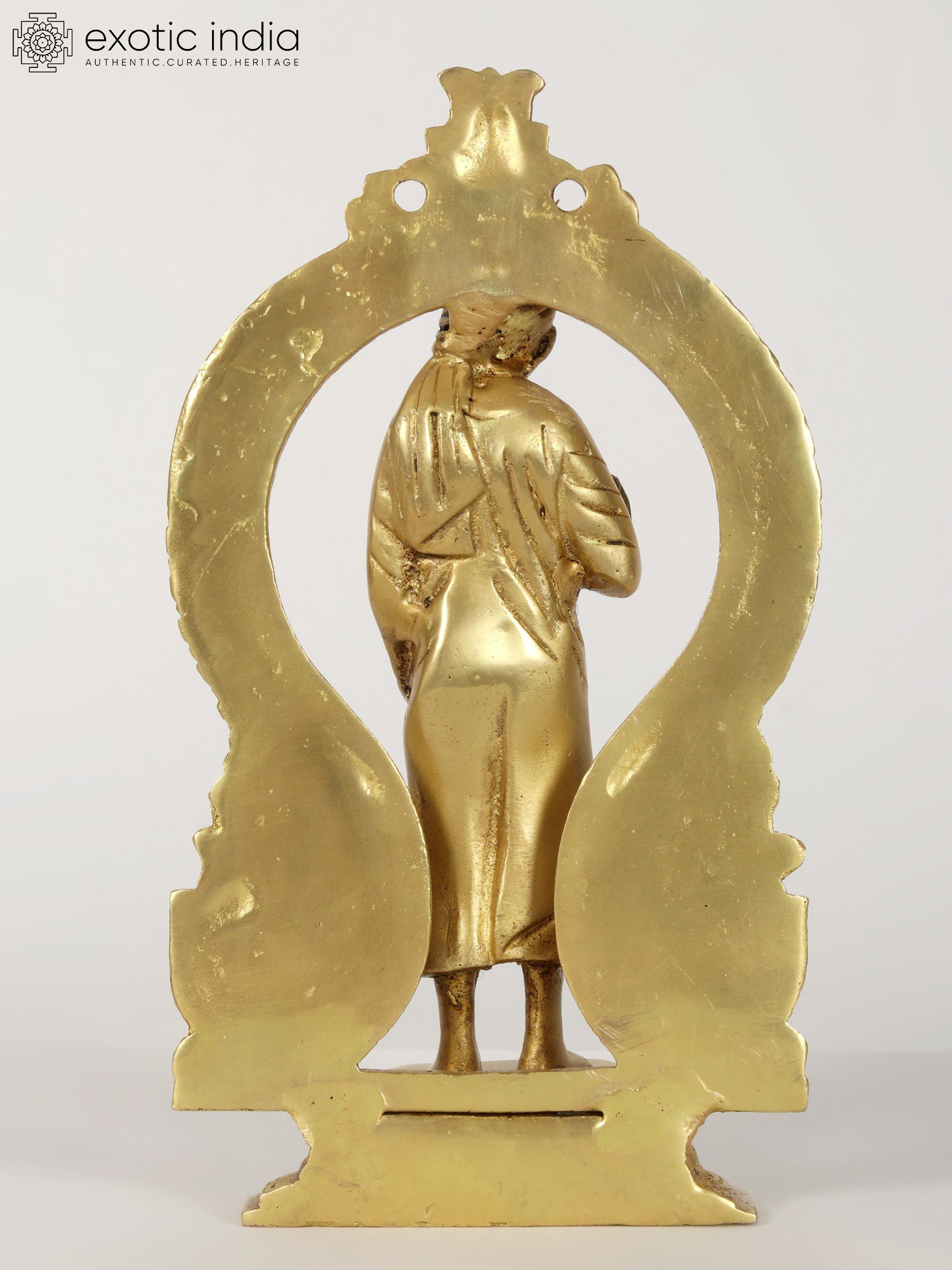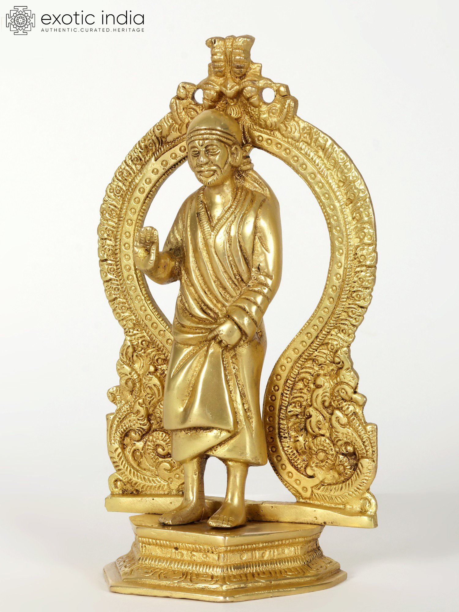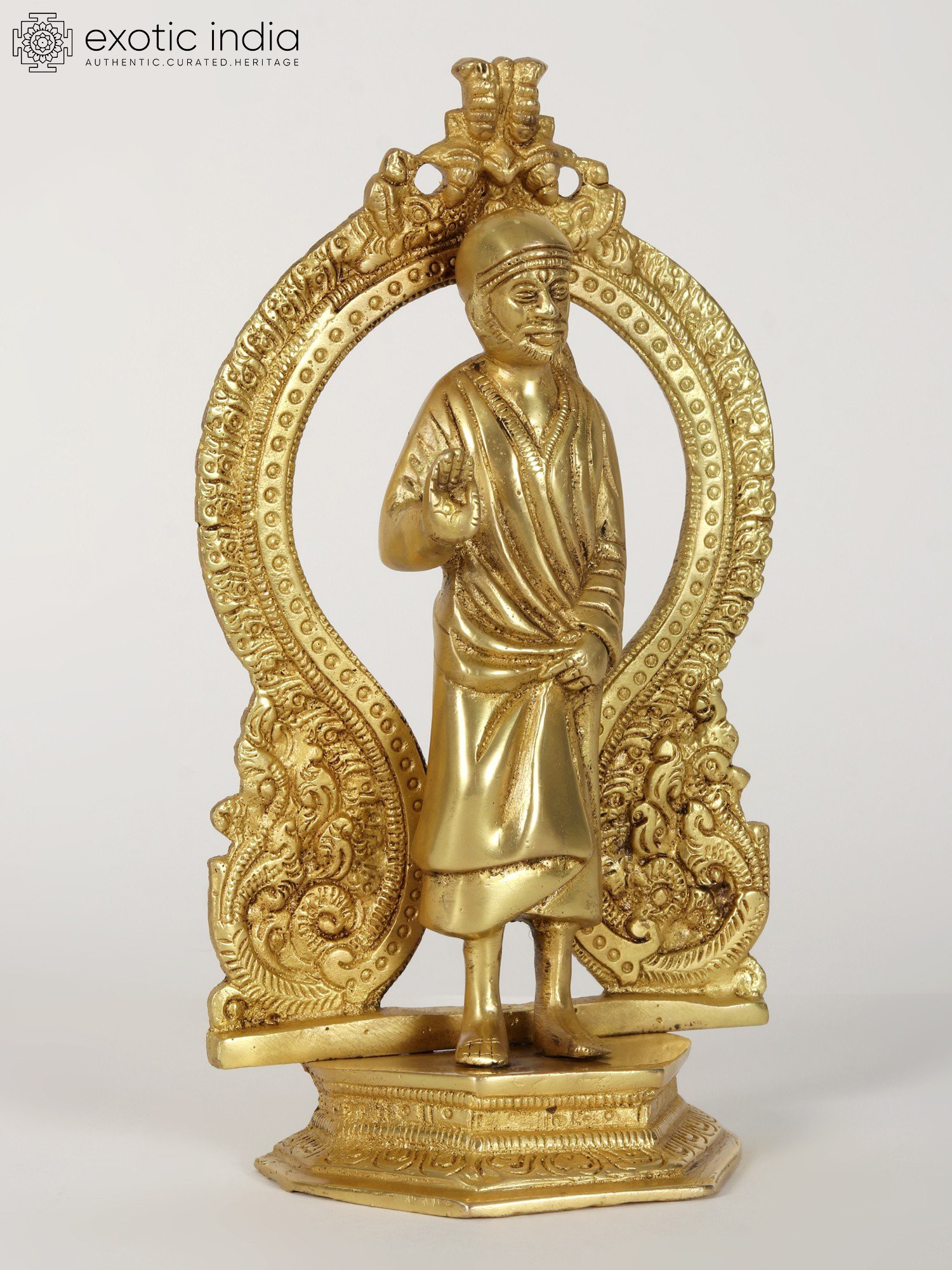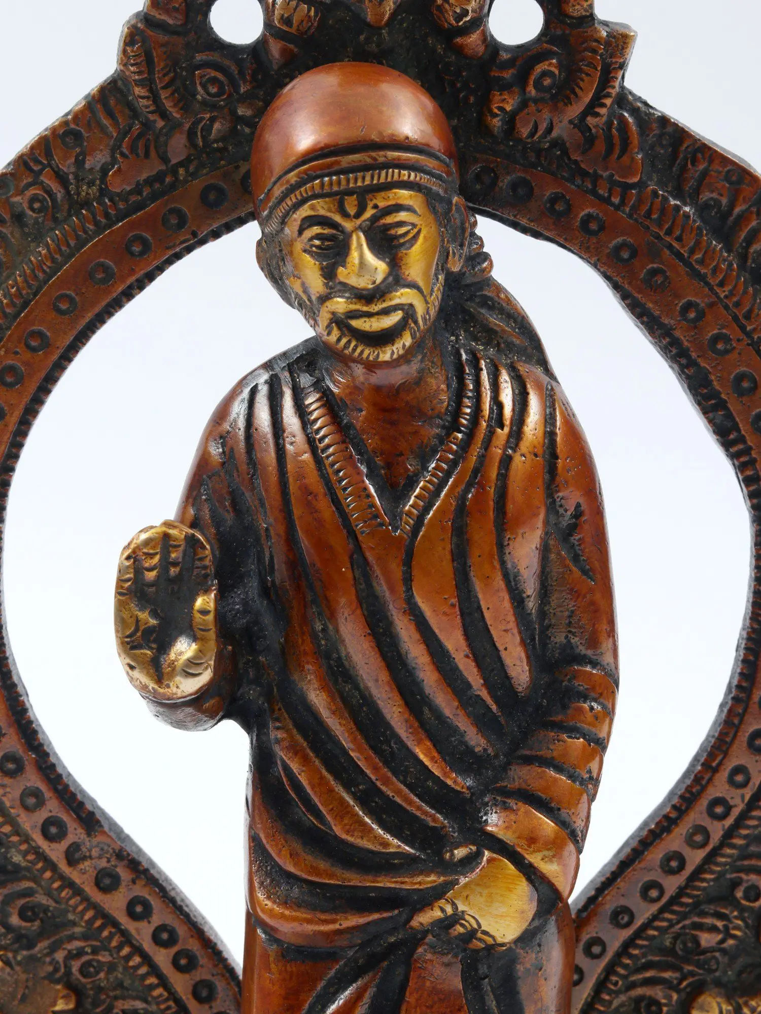 This brass statue provokes numerous emotions with its unusual blend of Sai Baba's standing visage and the Kirtimukha seat behind it. When combined with a Kirtimukha, Sai Baba, a symbol of forgiveness and humanity, represents the triumph of abstention over evil thoughts. This statue depicts Sai Baba in his characteristic position of thanking his disciples, radiating tranquillity and generosity. It was created with the finest precision and workmanship. This statue, made of high-quality brass with a matt finish brown brightness, serves as a reminder of self-control and generosity.