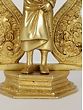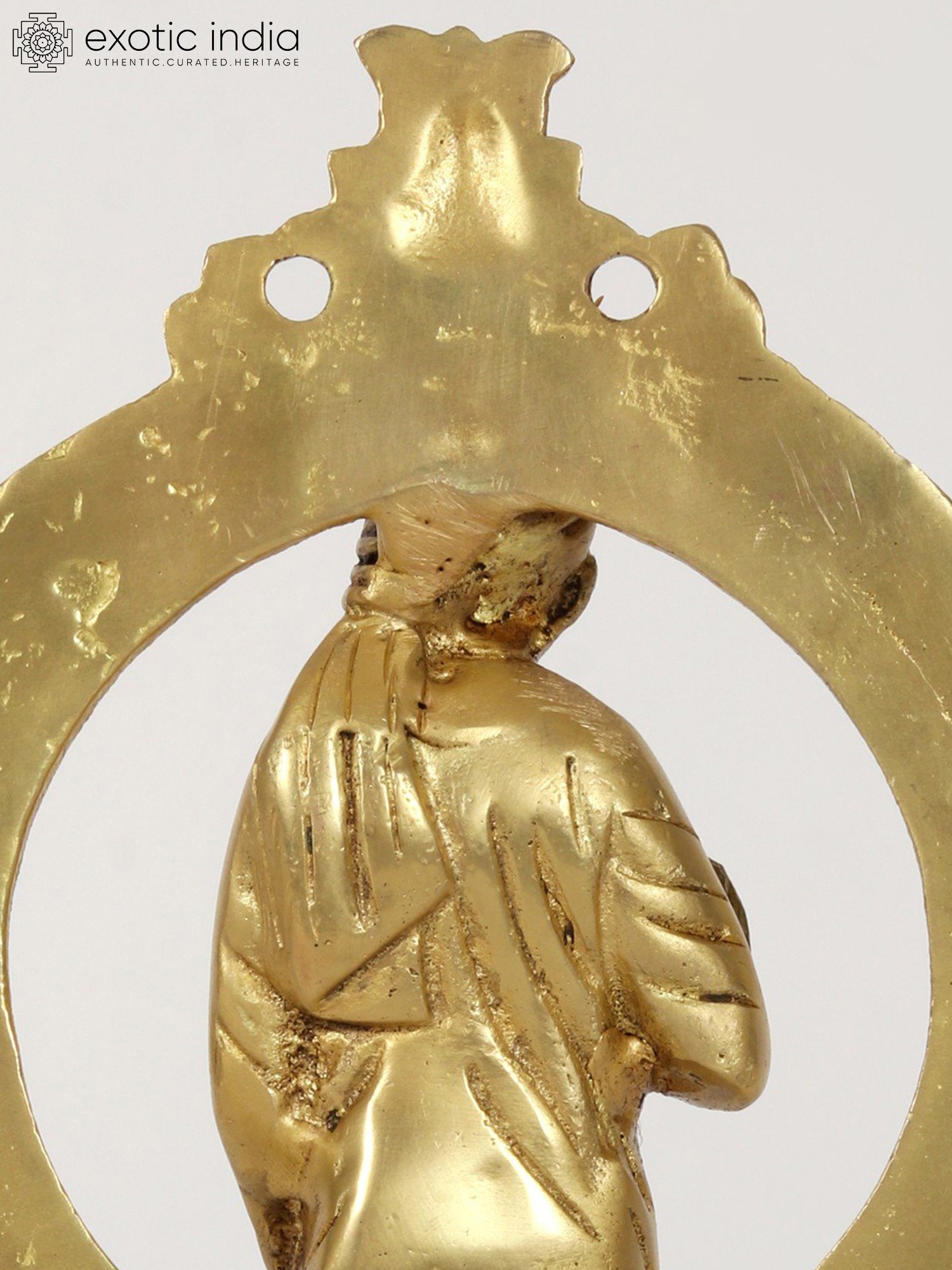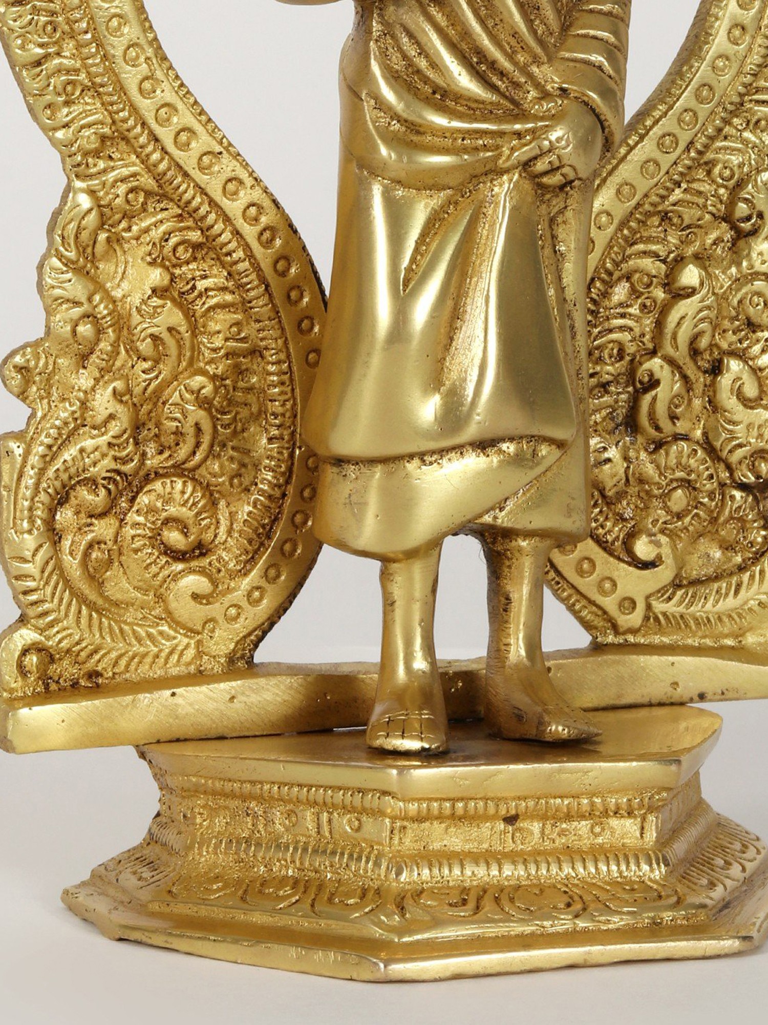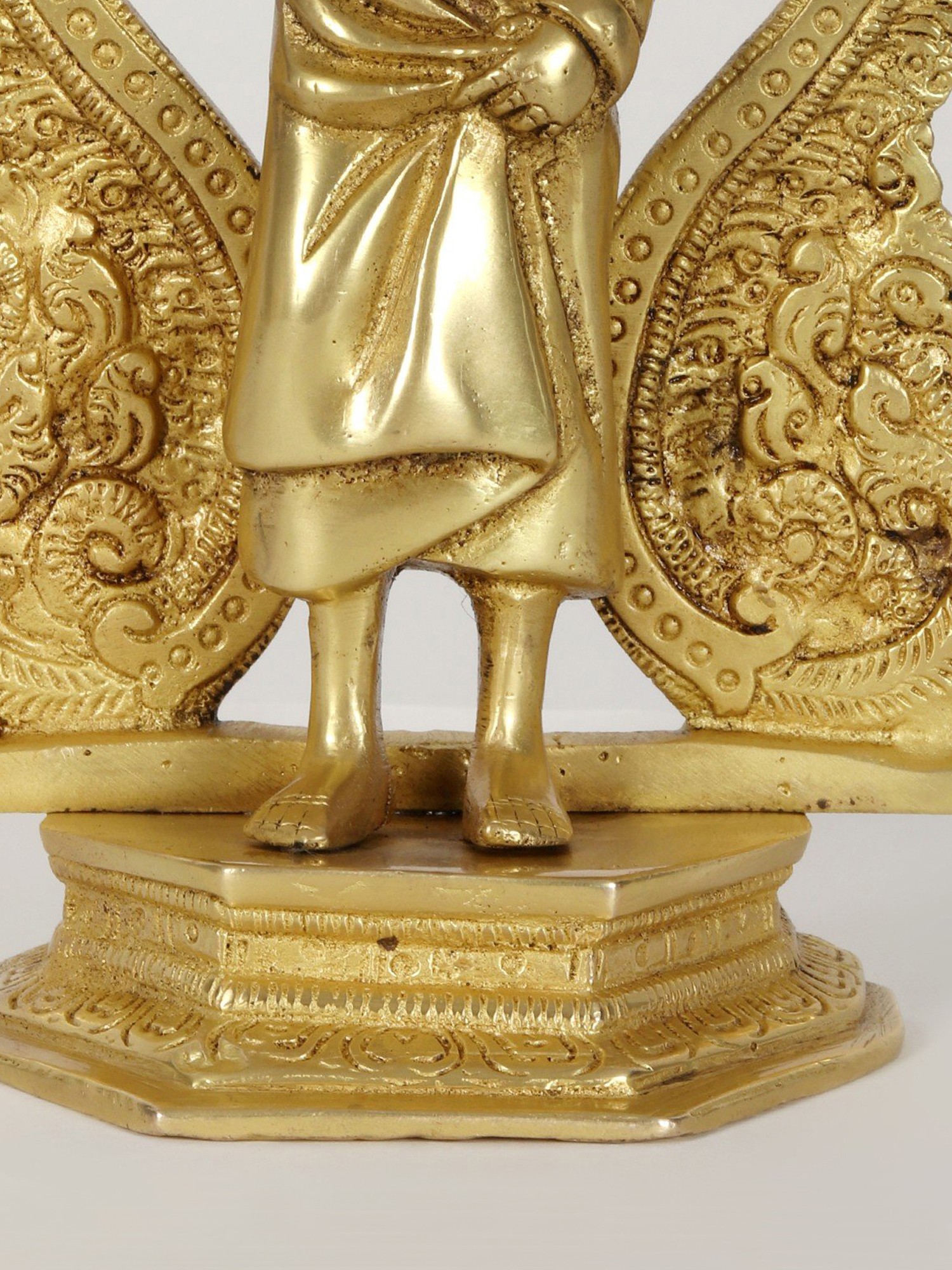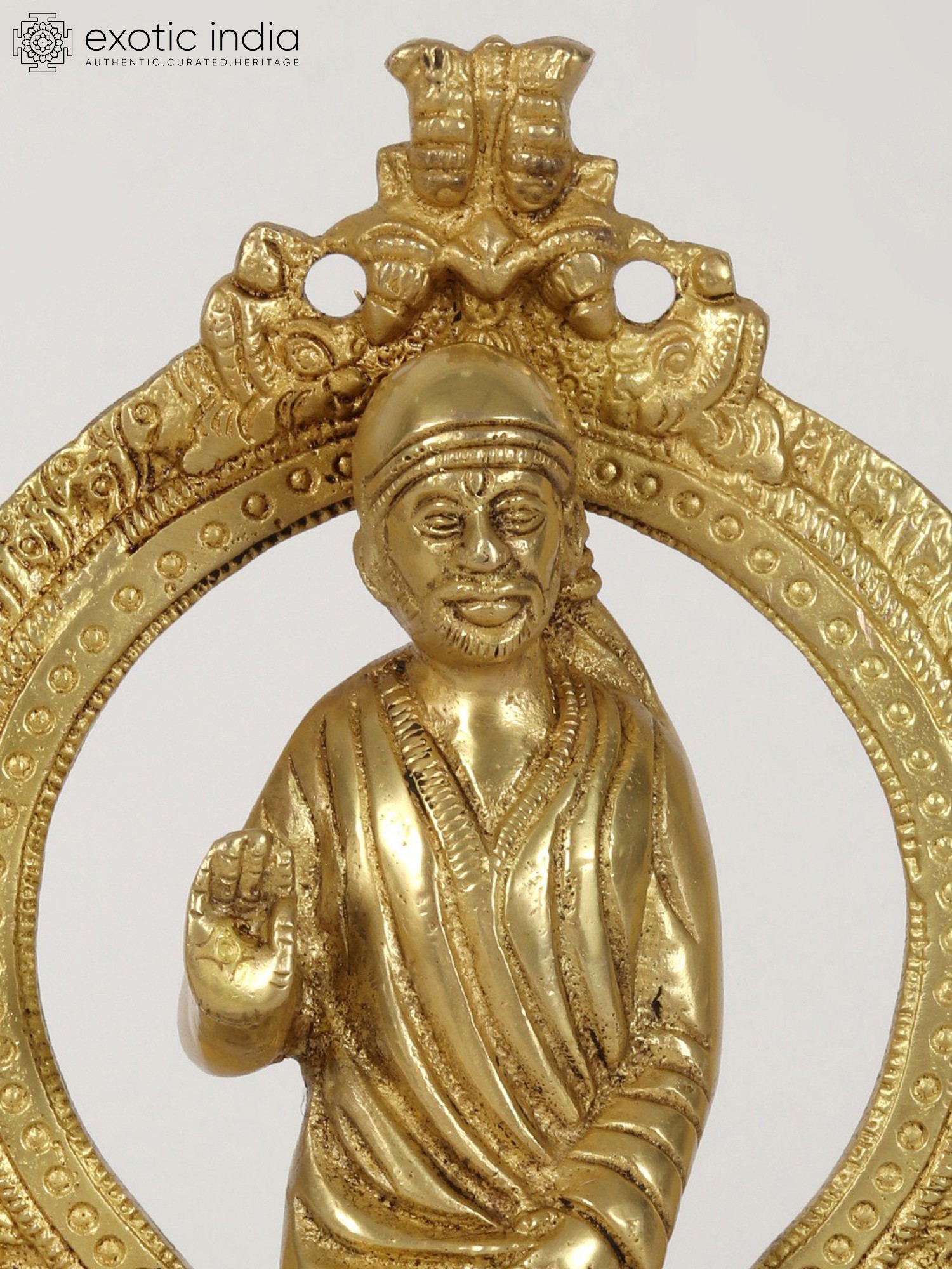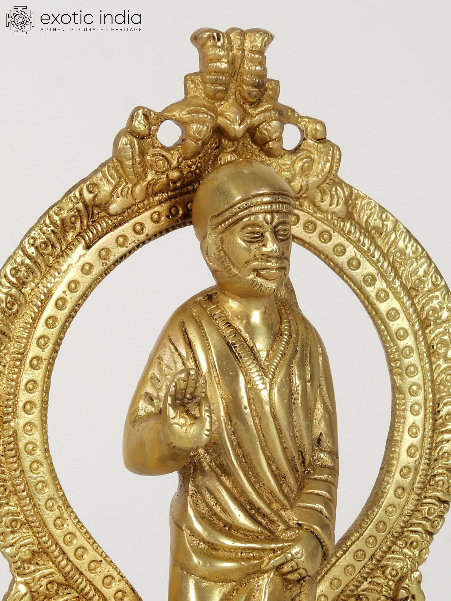 This brass statue provokes numerous emotions with its unusual blend of Sai Baba's standing visage and the Kirtimukha seat behind it. When combined with a Kirtimukha, Sai Baba, a symbol of forgiveness and humanity, represents the triumph of abstention over evil thoughts. This statue depicts Sai Baba in his characteristic position of thanking his disciples, radiating tranquillity and generosity. It was created with the finest precision and workmanship. This statue, made of high-quality brass with a matt finish brown brightness, serves as a reminder of self-control and generosity.