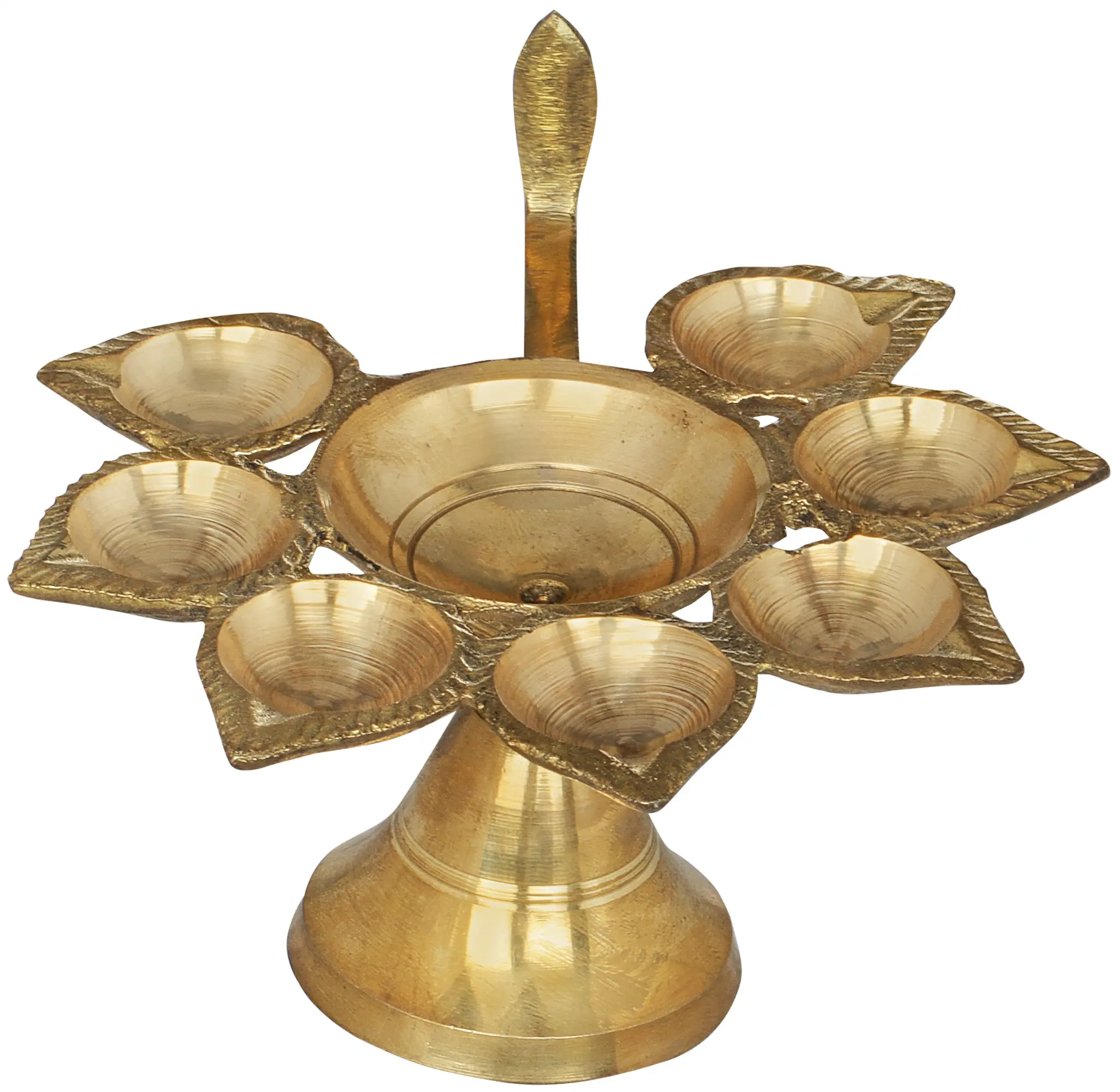 The "Seven Wicks Aarti Lamp in Brass" is an exquisite embodiment of sacred rituals and artistic craftsmanship. Handmade in India, this lamp features seven delicately designed holders for oil lamps, symbolizing spiritual illumination. Crafted with precision from brass, it marries traditional reverence with skilled artistry. The lamp's radiance evokes a sense of devotion, casting a warm glow during ceremonial Aarti rituals. Its intricate detailing and cultural significance harmonize, creating a tangible connection to India's spiritual heritage. This masterpiece not only lights up spaces but also kindles a deeper connection to tradition, making it a timeless representation of faith and culture.
