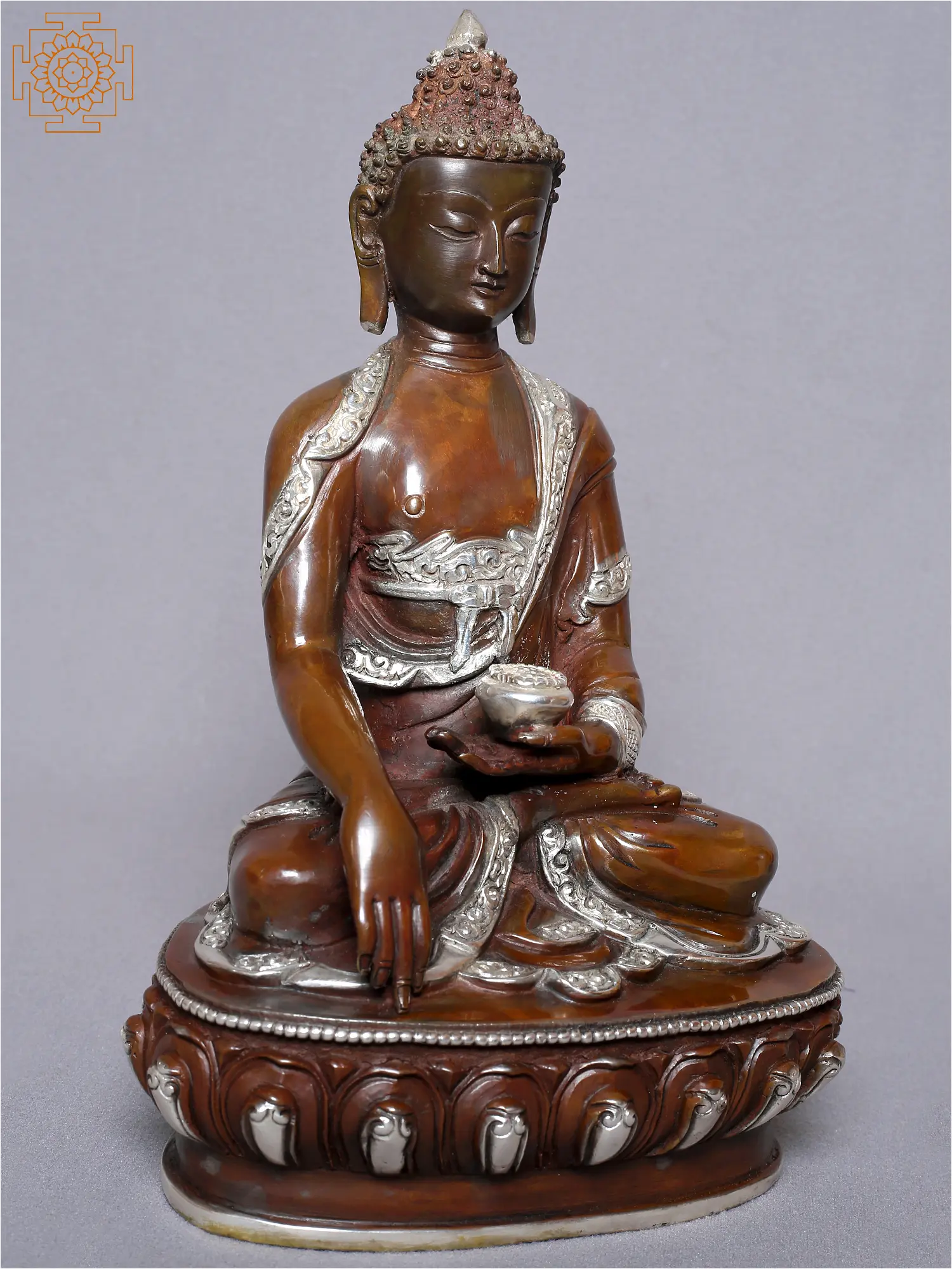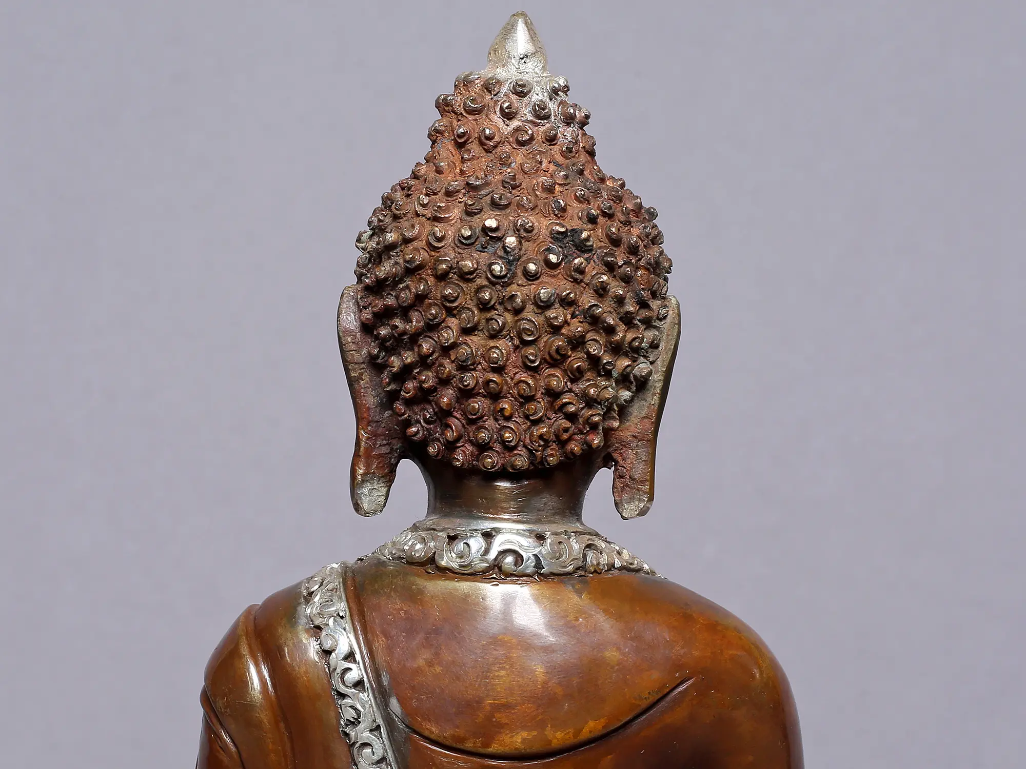 A perfect delineation of the characteristic features of the Buddha- his curled hair, Ushnisha or cranial protuberance, and meditative countenance bring a celestial beauty to the statue. With a lovely polish of the metal and contrasting silver and copper hues, this Nepalese statue is a classic artwork of immense religious significance, a representation of the profound wisdom of the Buddha.