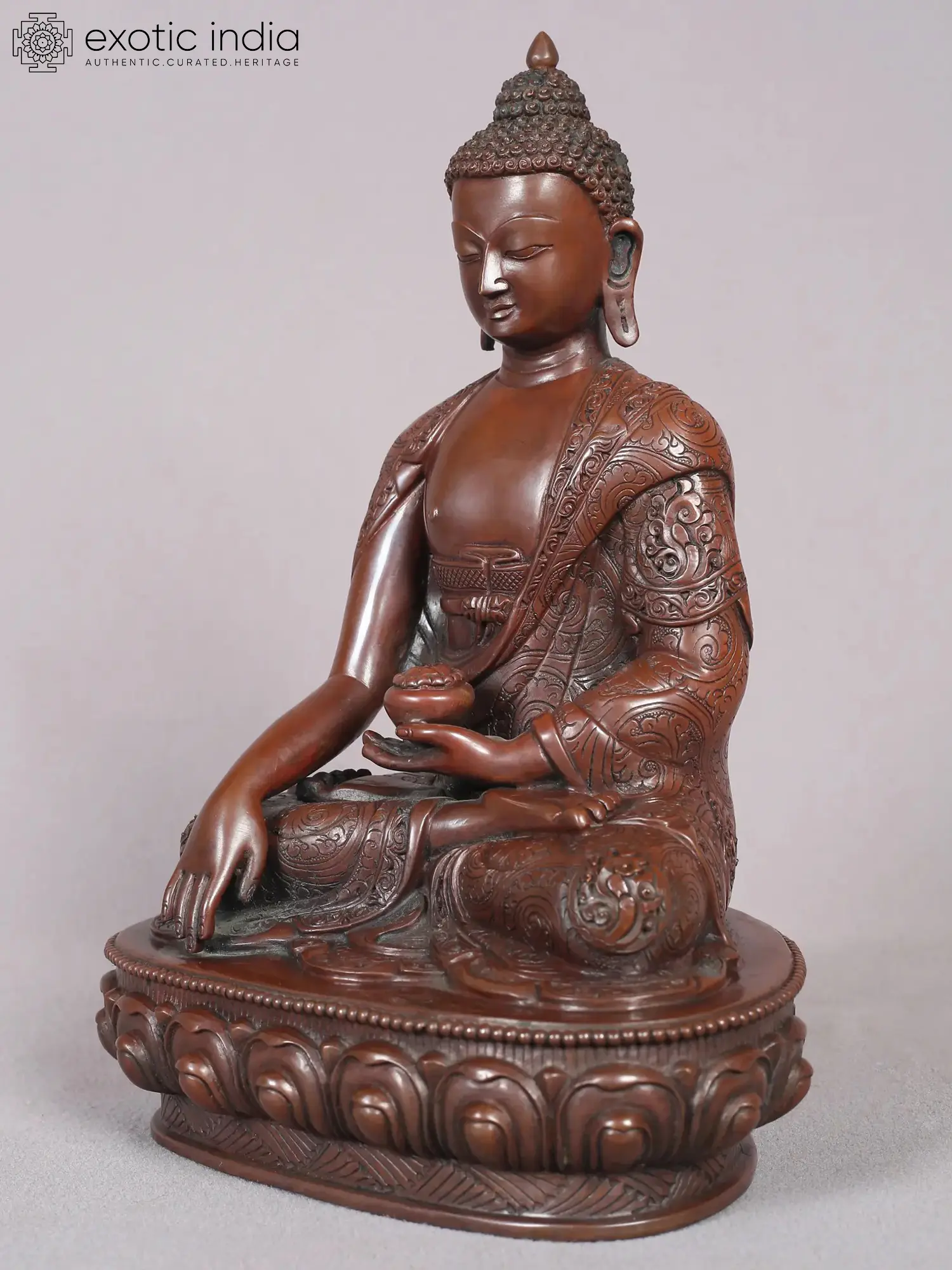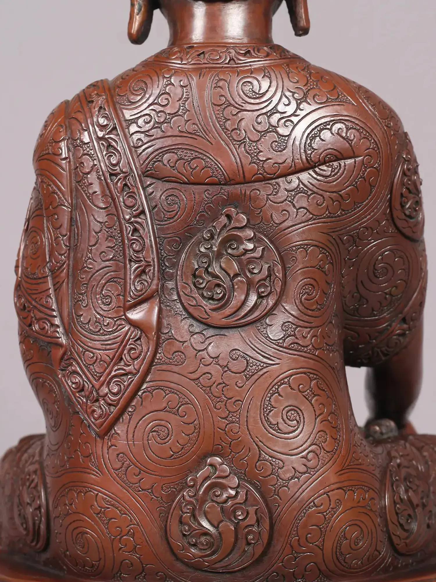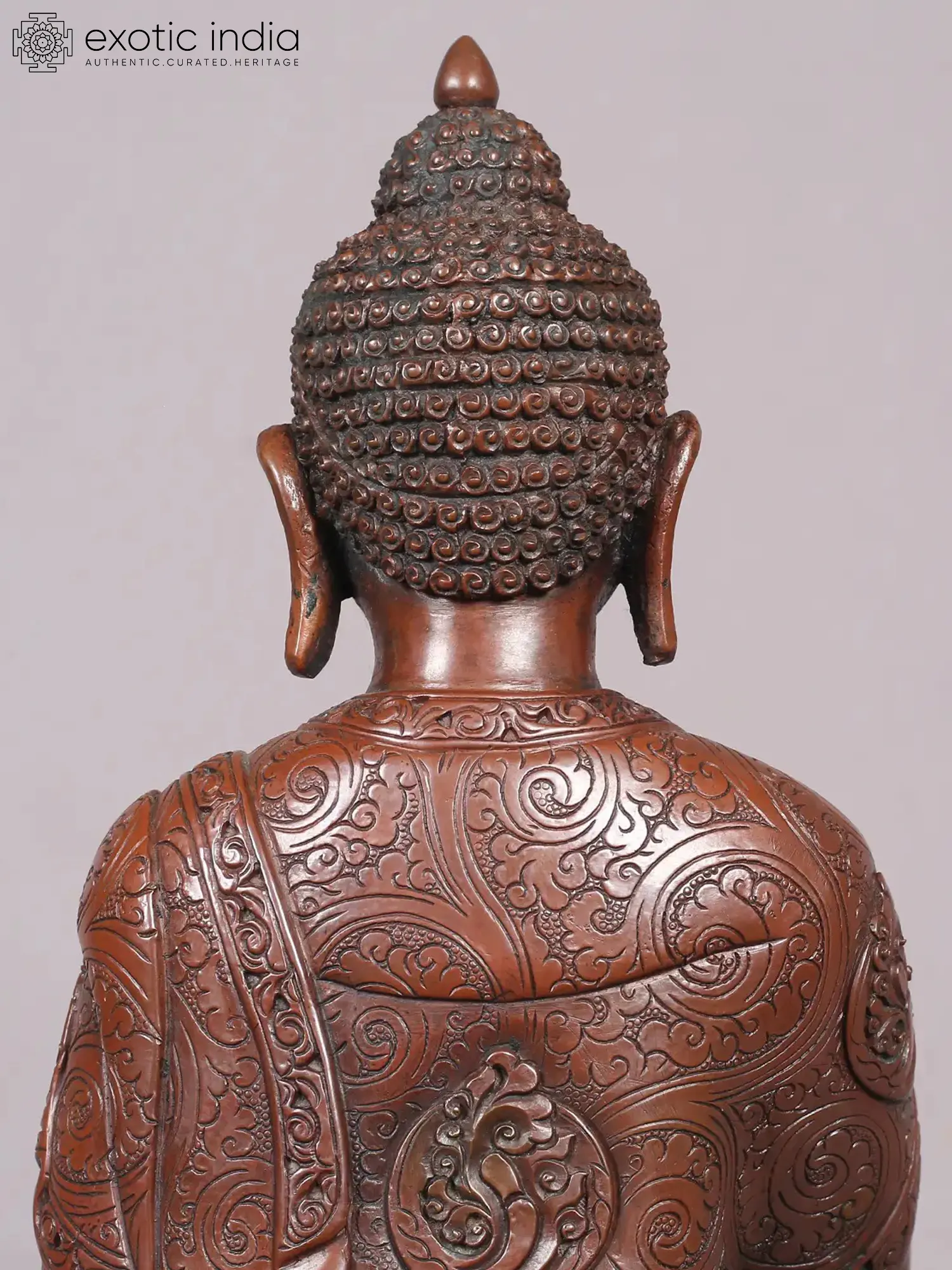 The revered Lord Shakyamuni Buddha is elegantly captured in a posture that exudes both serene calmness and a profound spiritual connection. Poised in the Dhyana Asana, or Meditative Pose, atop a double lotus pedestal, he sits with legs crossed in a manner that evokes a sense of timeless contemplation. His left hand gracefully takes the form of the Bhumisparsha mudra, known as the earth-touching gesture. This symbolic gesture signifies not only his triumph over the allure of worldly temptations but also his unwavering connection to the very core of the Earth. Crafted from copper, this statue of Shakyamuni Buddha is adorned with intricate artwork that adorns his robe, gently enveloping his form. These artful depictions narrate the stories of his life, encapsulating the very essence of his teachings and the profound tenets of Buddhism itself.