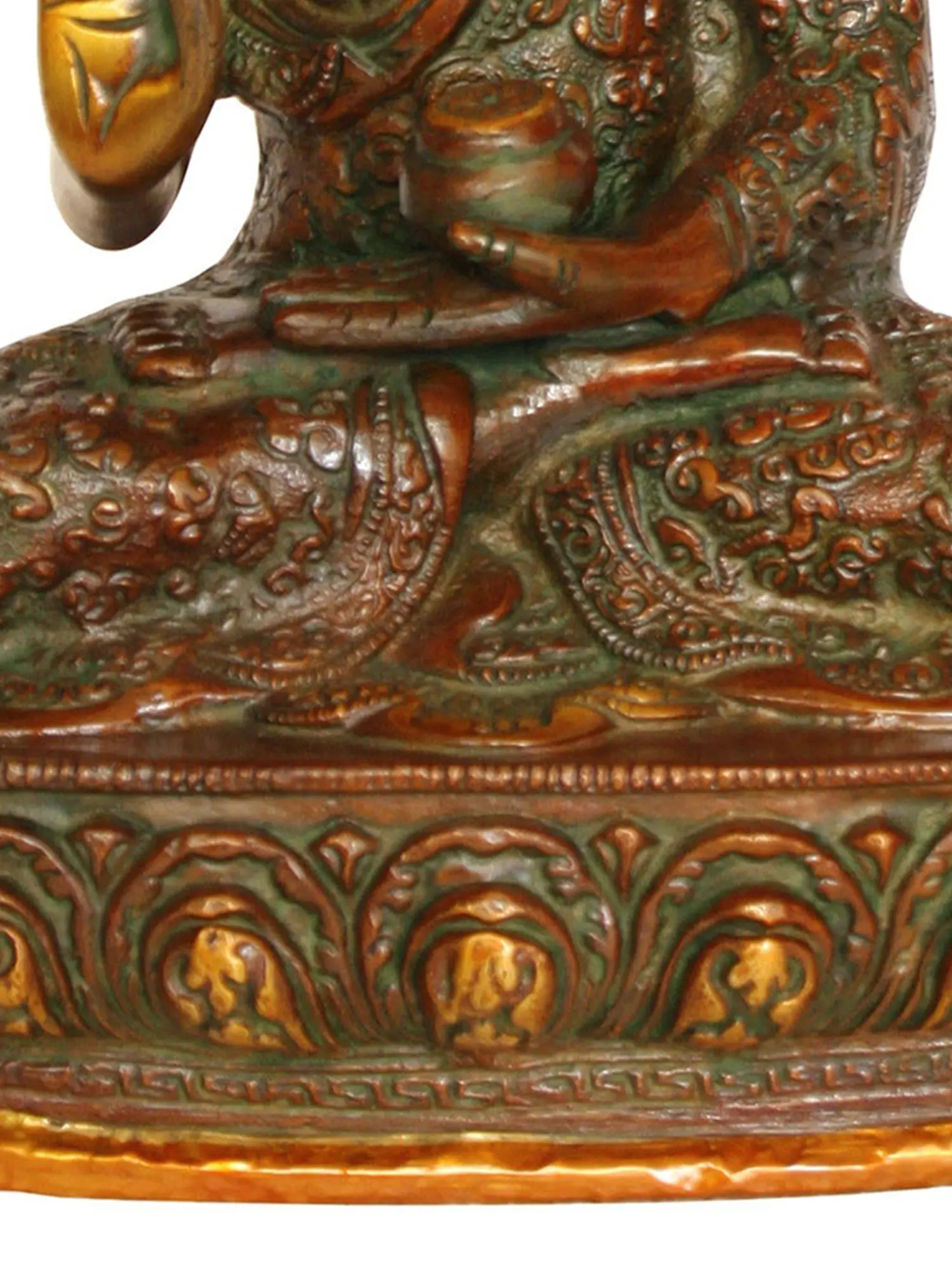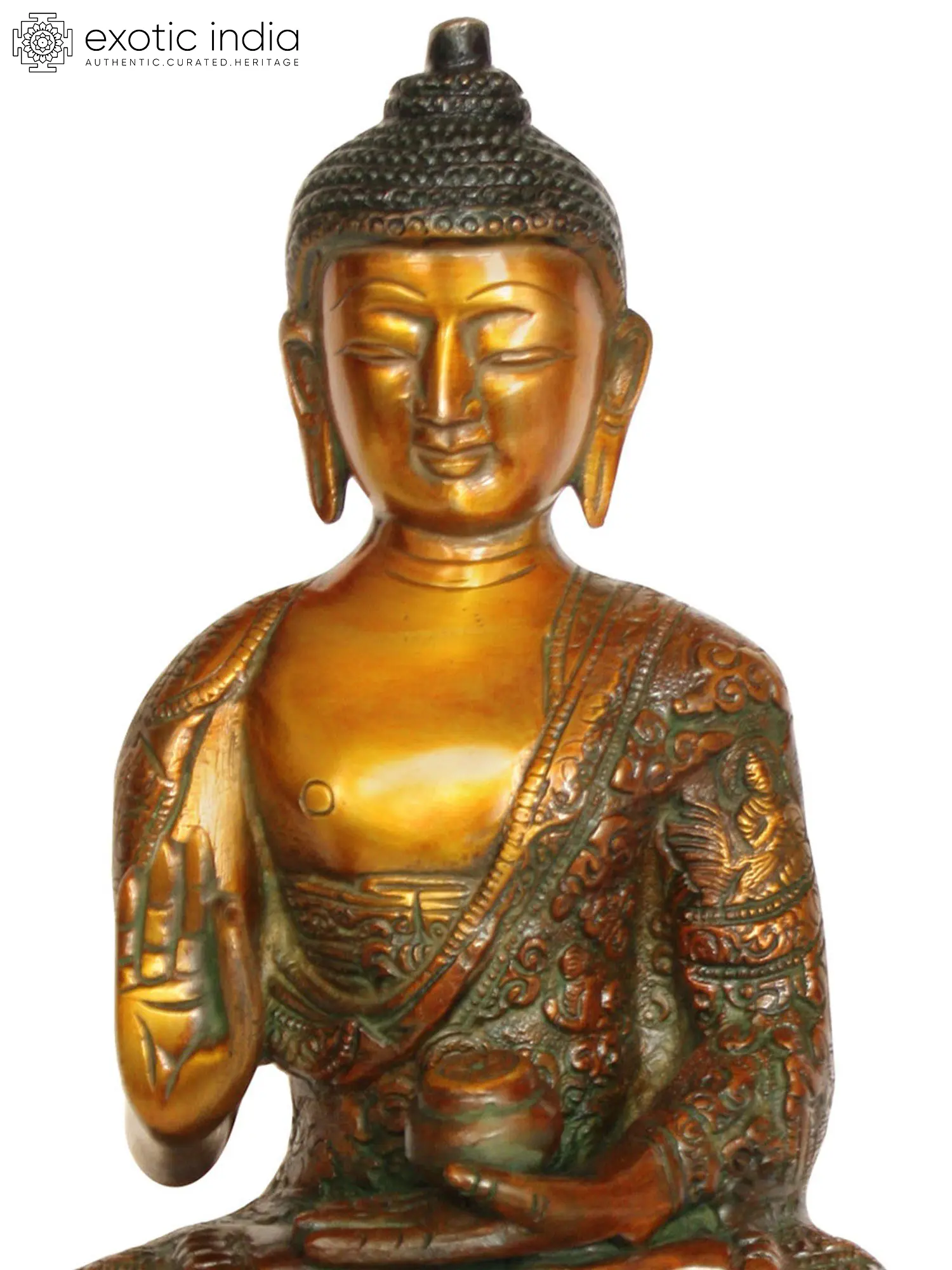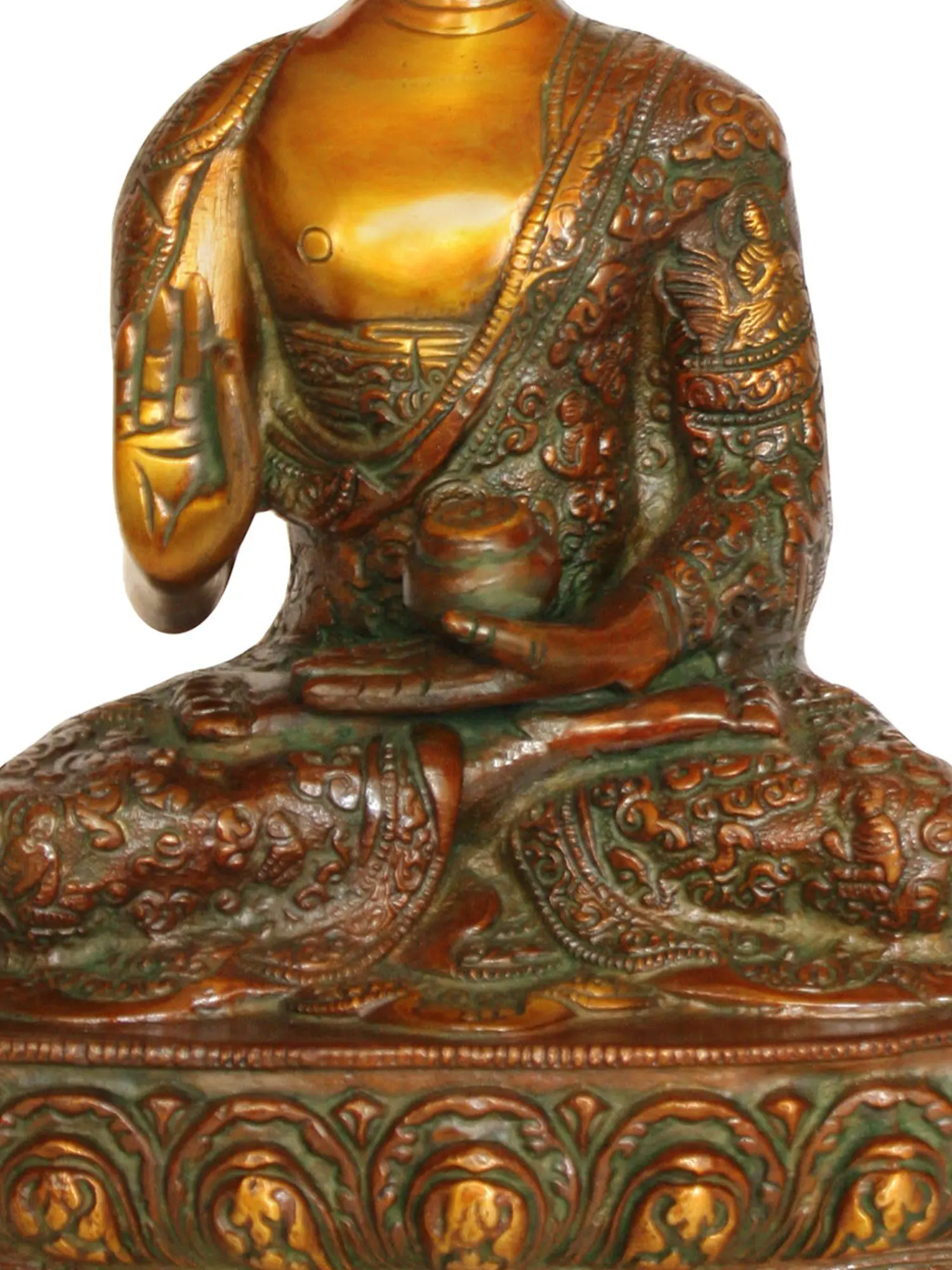 Encounter the serene presence of the Buddha, depicted in a classic pose of Dharma preaching. This striking brass sculpture captures the essence of Siddhartha Gautama, the historical Buddha who achieved enlightenment and shared his wisdom with the world. Seated in the lotus position, padmasana, the figure radiates calm and profound understanding. His right hand is raised in the Vitarka Mudra, the gesture of teaching and intellectual discussion, inviting contemplation and the pursuit of knowledge. In his left hand, he holds a begging bowl. The face is serene, with gently downcast eyes that suggest both inward reflection and compassion for all beings. The elongated earlobes are a symbolic representation of his renunciation of princely life and its associated ornaments. The Ushnisha, the cranial protuberance at the top of his head, signifies his heightened spiritual awareness and attainment.