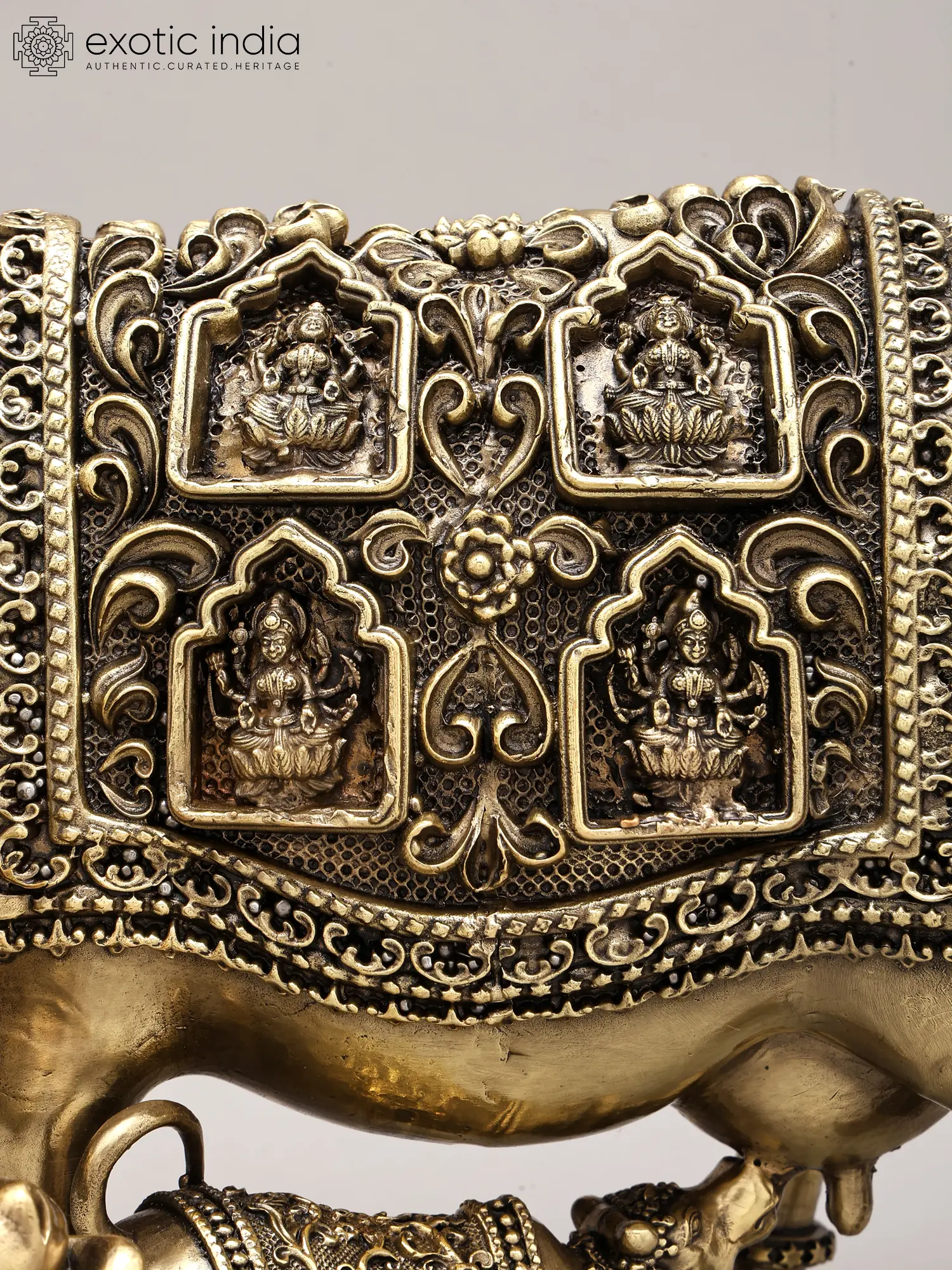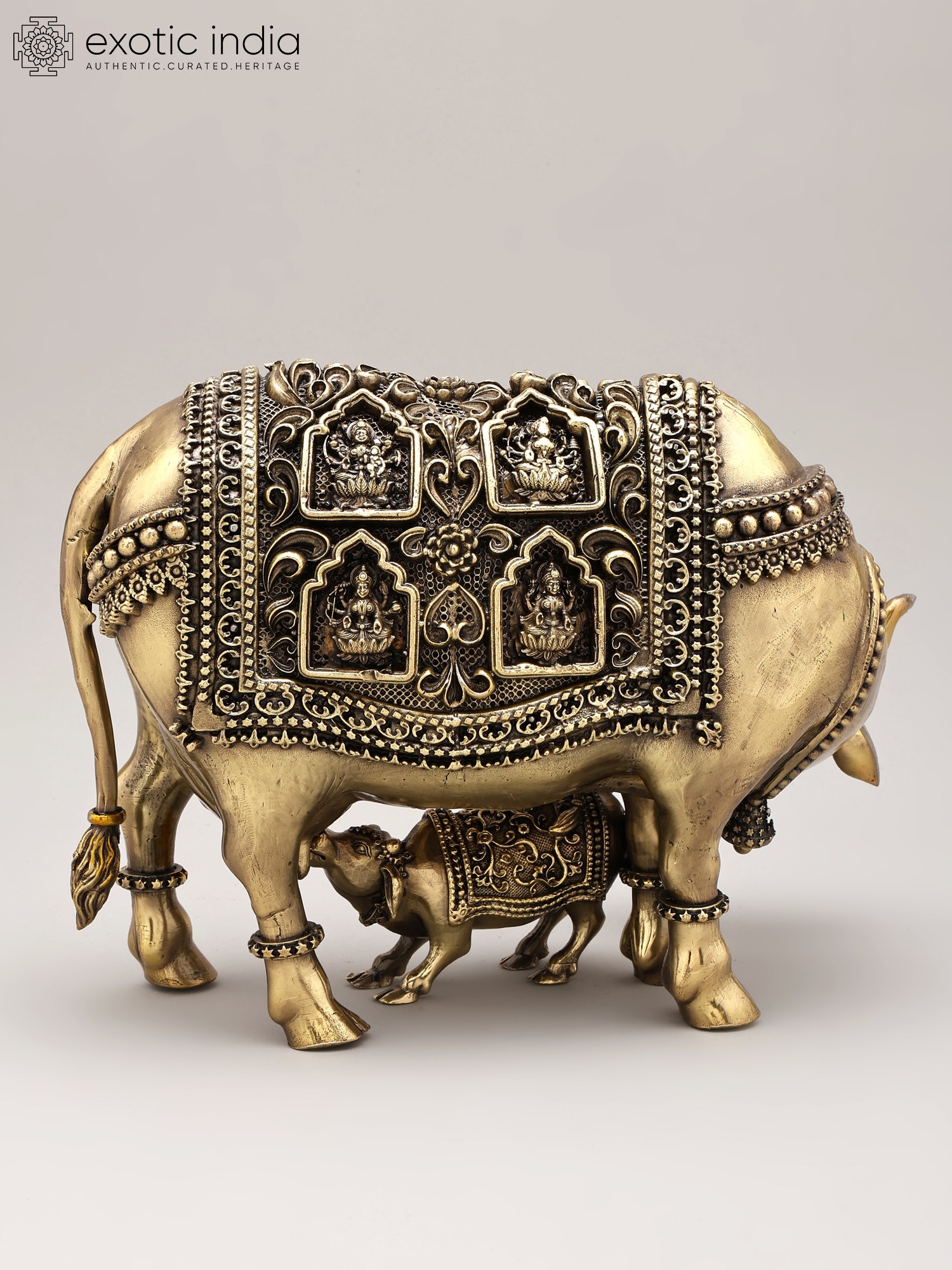 Adorning the cow's back is a beautifully intricate blanket, a testament to the artisan's precision. This decorative element is further enriched by a series of finely detailed panels, each depicting one of the Ashtalakshmi, the eight divine forms of Goddess Lakshmi, the deity of wealth, fortune, and prosperity. The gentle posture of the cow and the calf's tender embrace create a harmonious composition that radiates a serene aura. The overall dimensions, approximately 7 inches in length, 9.5 inches in height, and 5 inches in width, allow for a substantial yet elegant presence.
