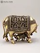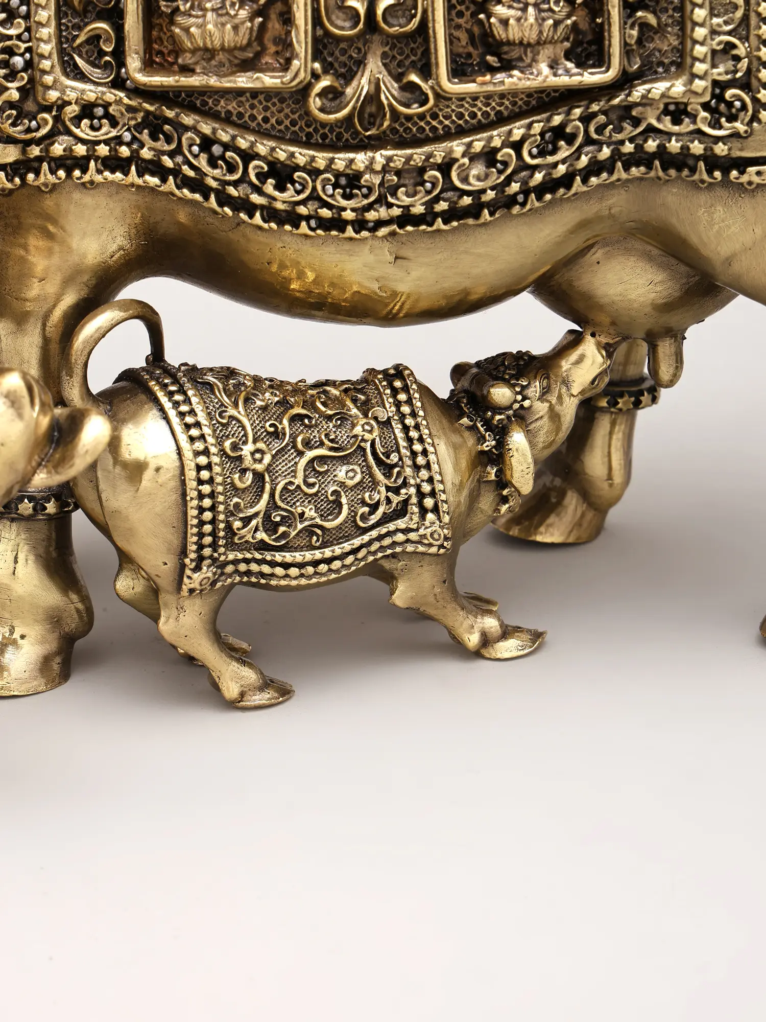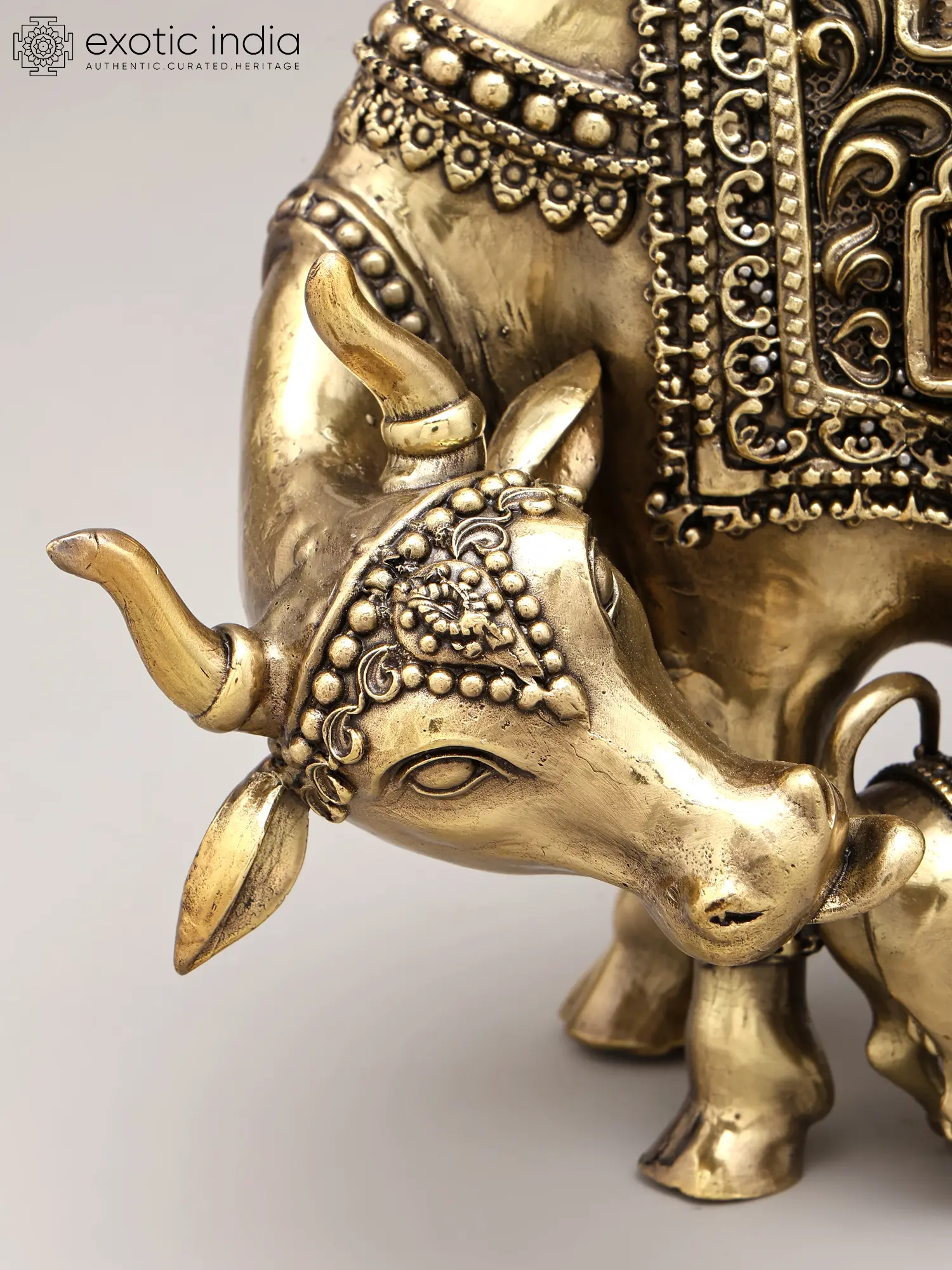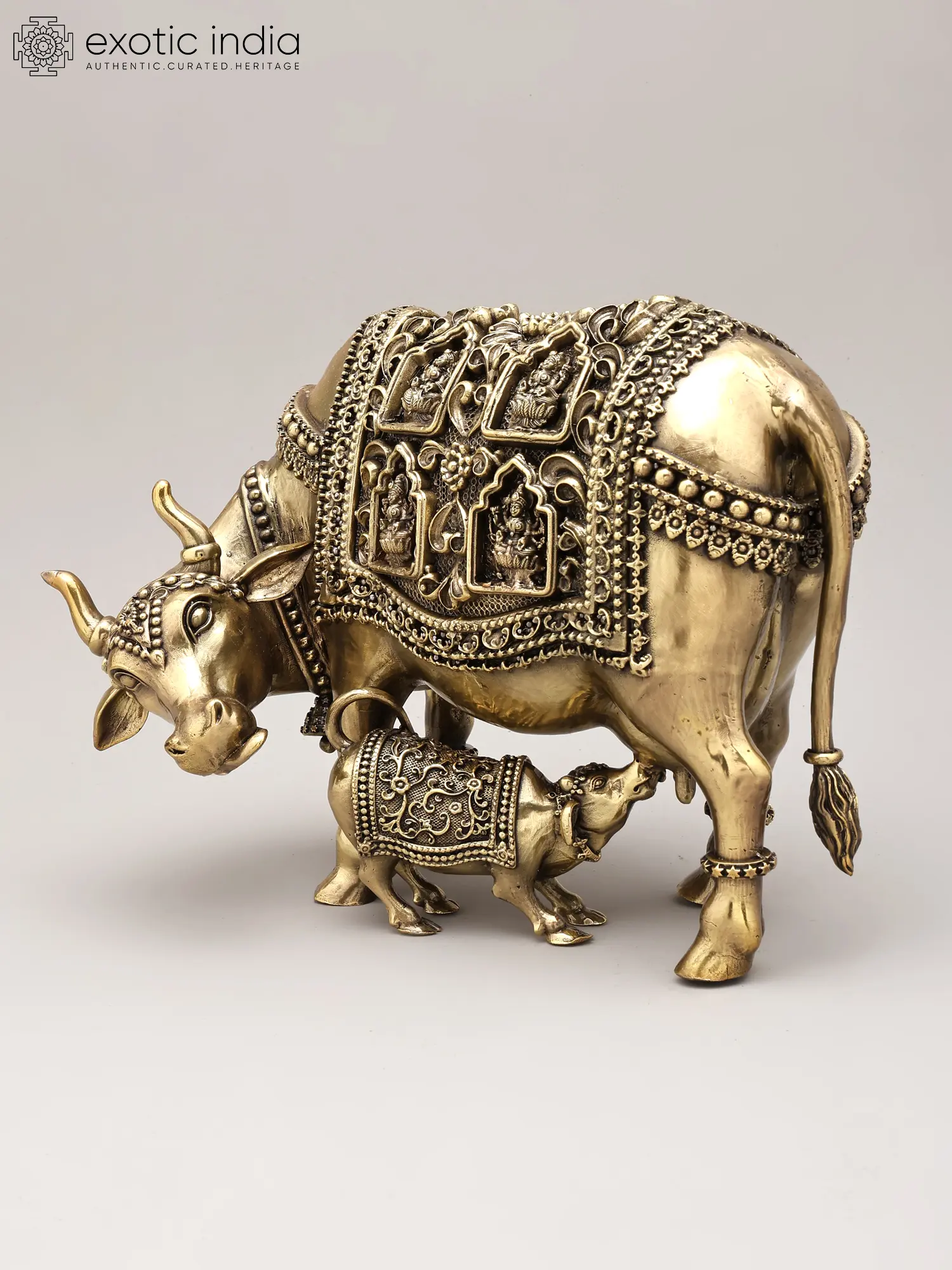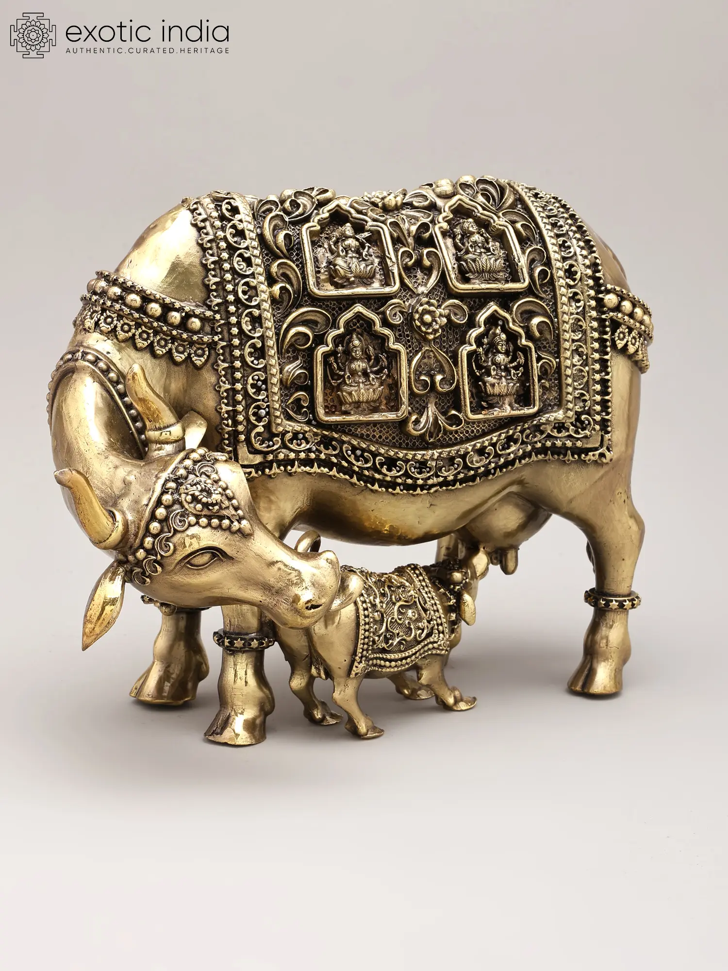 6" Small Superfine Cow and Calf with Ganesha Lakshmi Carving | Brass Statue with Inlay Work