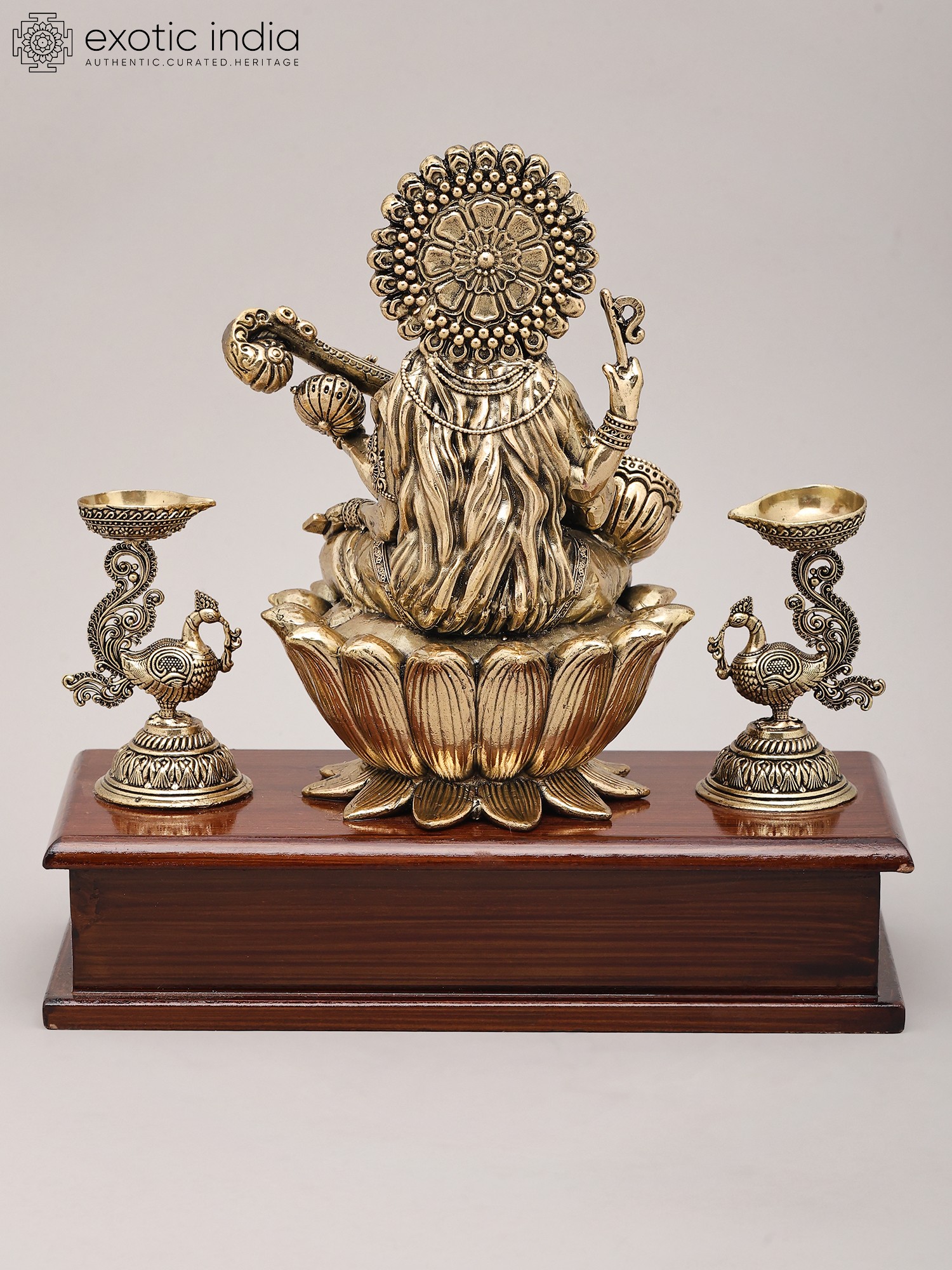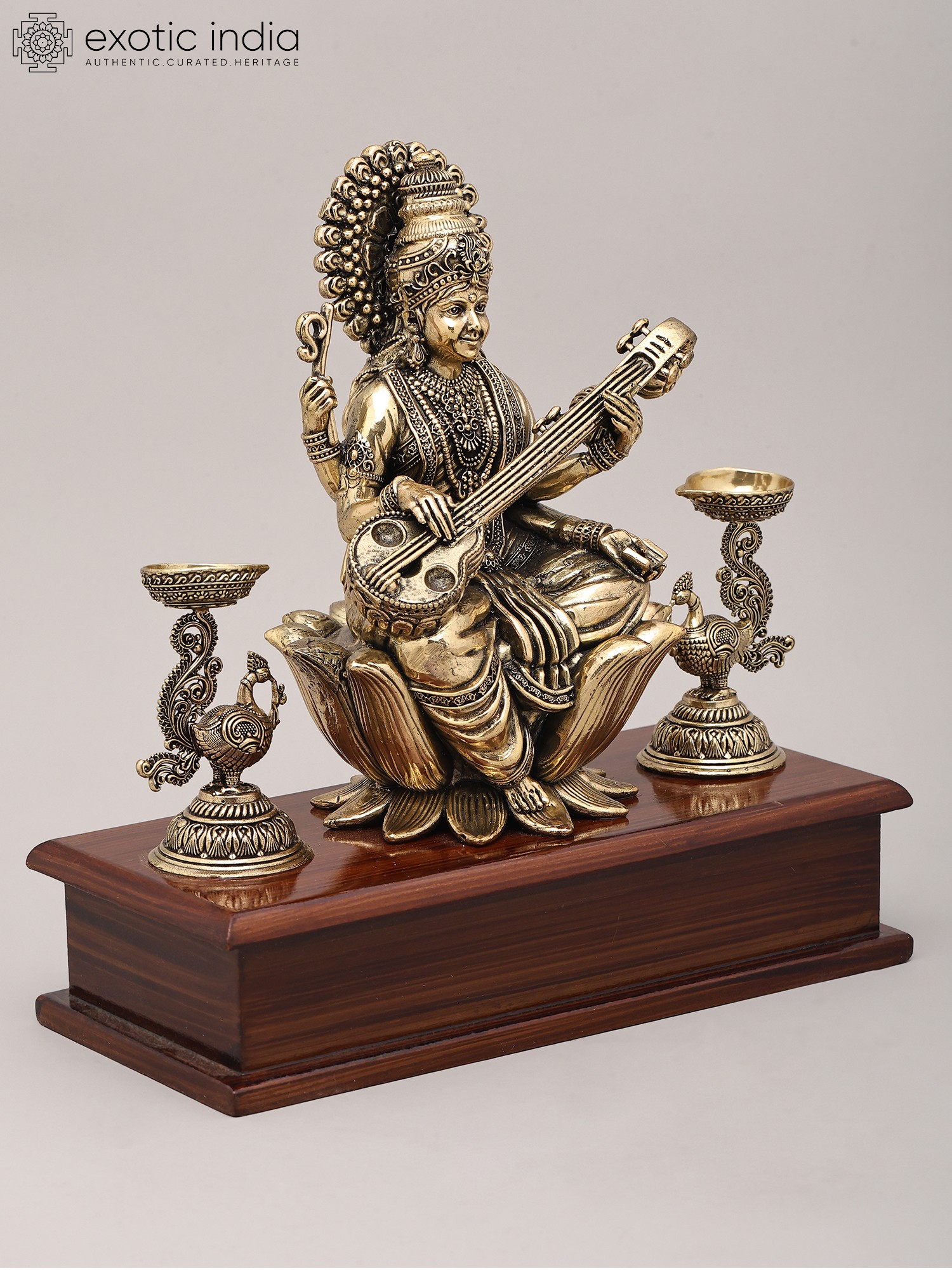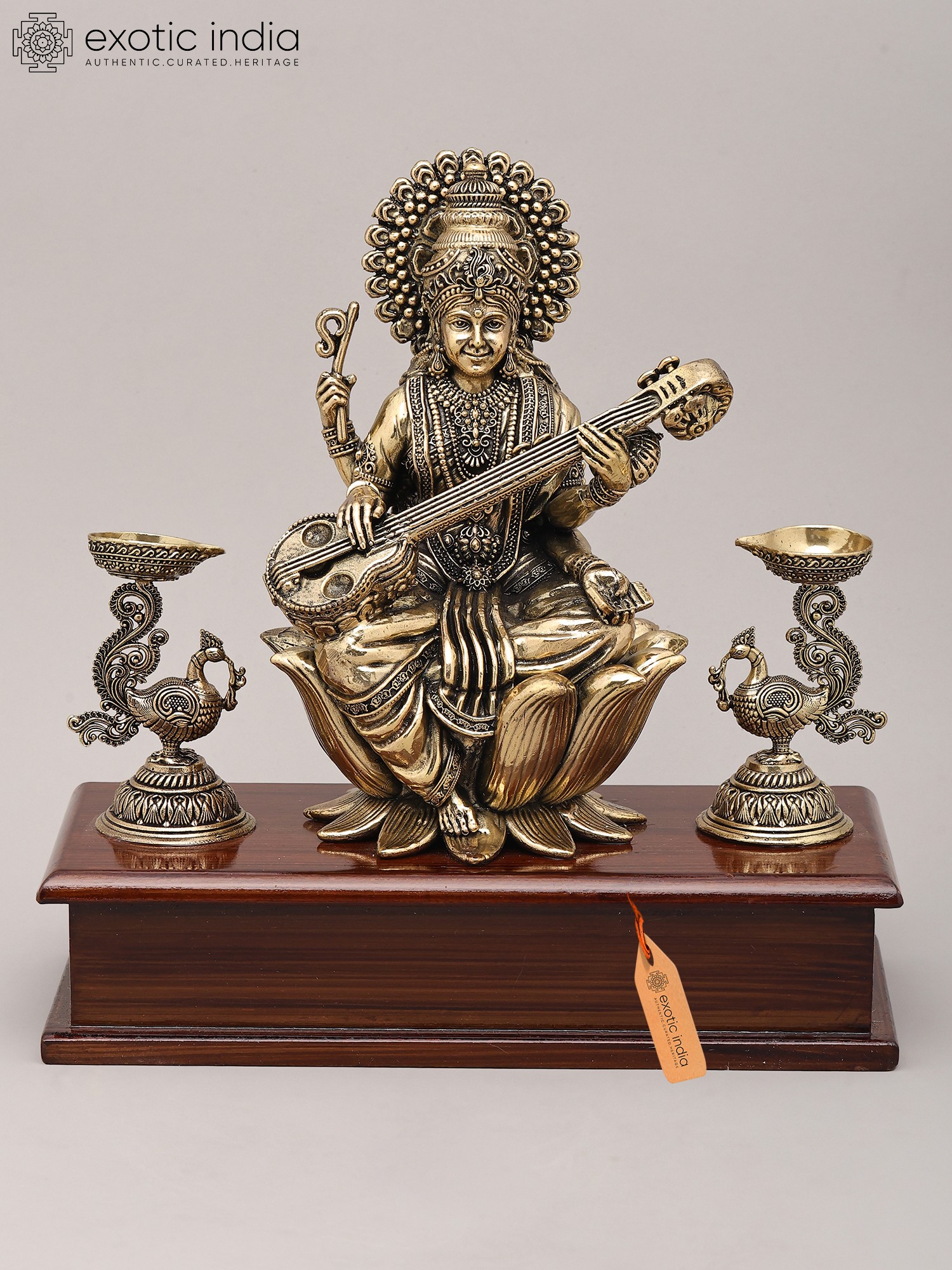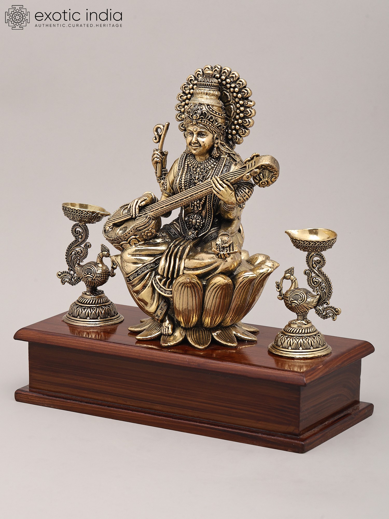 This superfine brass statue is a testament to the enduring legacy of Indian craftsmanship. Each intricate detail, from the delicate ornaments adorning the goddess to the ornate patterns on the peacock lamps, is rendered with remarkable precision. The choice of brass, a metal known for its durability and lustrous sheen, ensures that this piece will retain its beauty and significance for generations to come. The rich patina achieved through skilled craftsmanship gives the statue an antique charm, making it a captivating centerpiece for any home, temple, or study. The smooth, polished wooden base anchors the divine figures, adding a touch of natural warmth and elegance. This statue is more than just a decorative item; it is a powerful symbol of enlightenment, creativity, and the pursuit of excellence, bringing the blessings of Goddess Saraswati into your life.