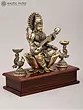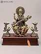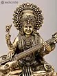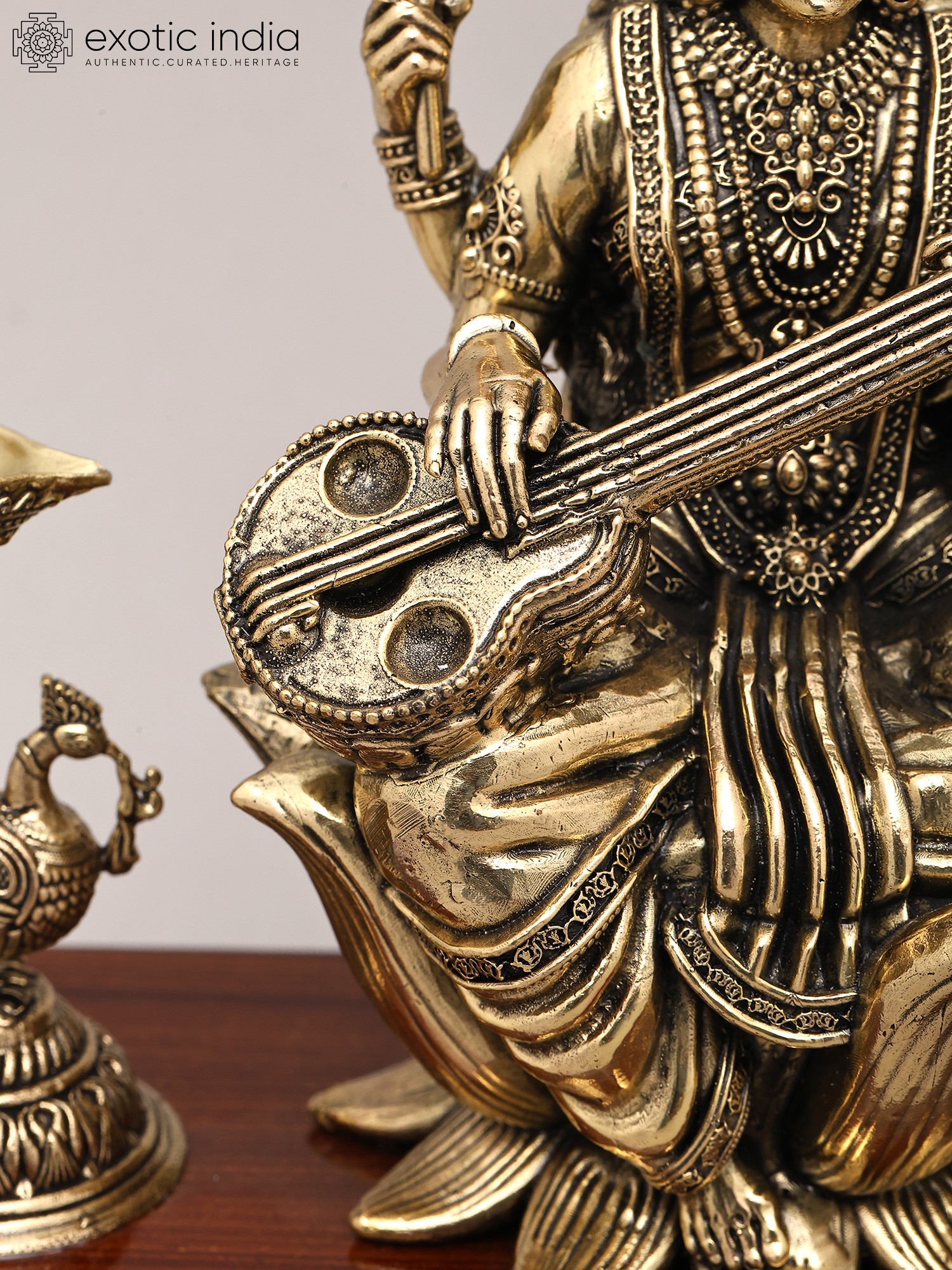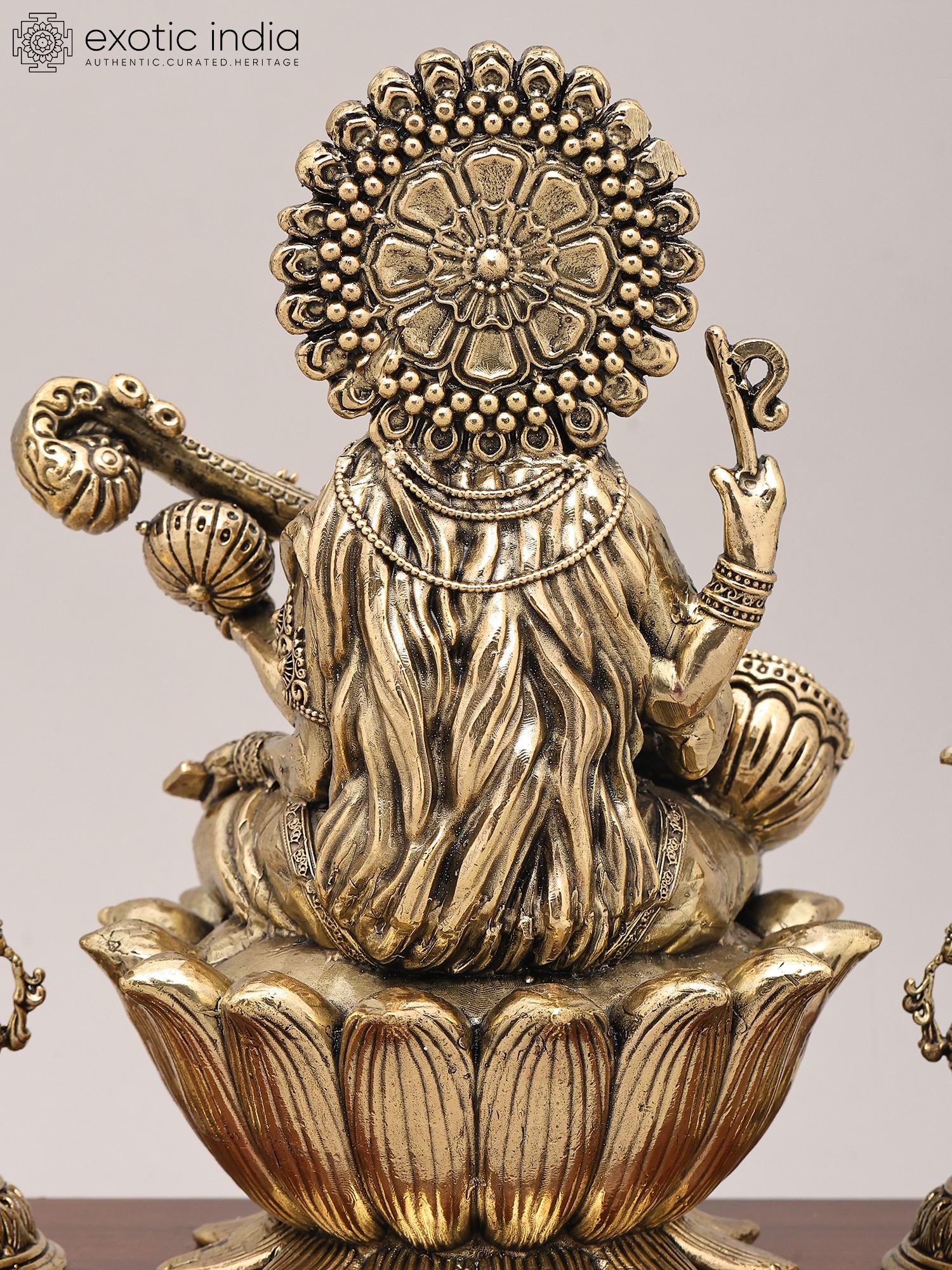This exquisite brass statue captures the divine essence of Goddess Saraswati, the embodiment of knowledge, music, arts, wisdom, and learning in Hindu mythology. Seated serenely on a blooming lotus, a symbol of purity and spiritual awakening, she exudes an aura of profound grace and tranquility. Her form is meticulously crafted from superfine brass, showcasing an exceptional level of detail that speaks to the artisan's mastery and devotion. The goddess is depicted in the act of playing the sitar, an instrument often associated with celestial music and the harmonious vibrations of the universe. Her fingers delicately poised on the strings, she seems to conjure melodies that resonate with the very fabric of creation, echoing the divine hymns sung in praise of her attributes.
