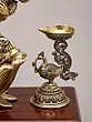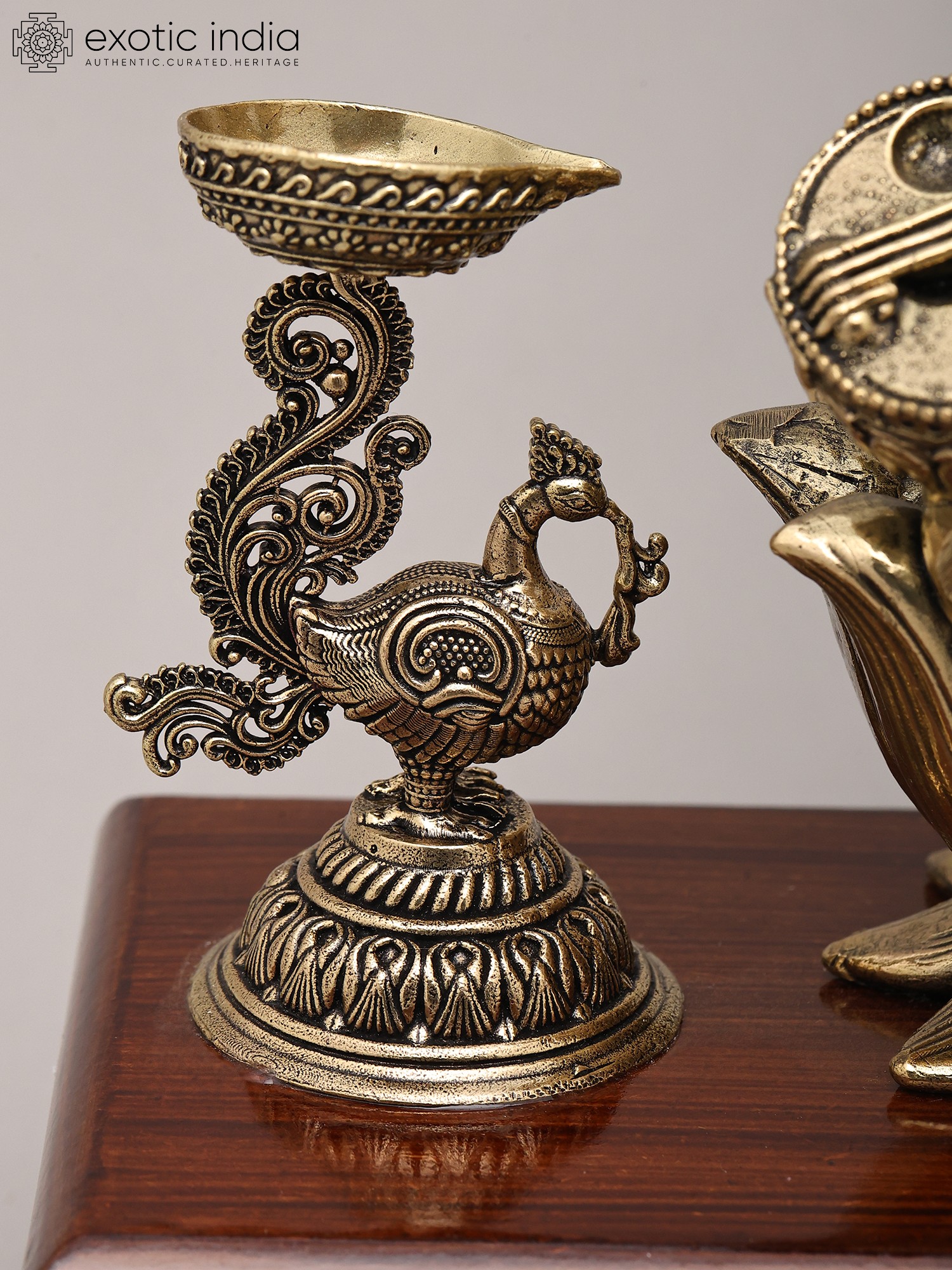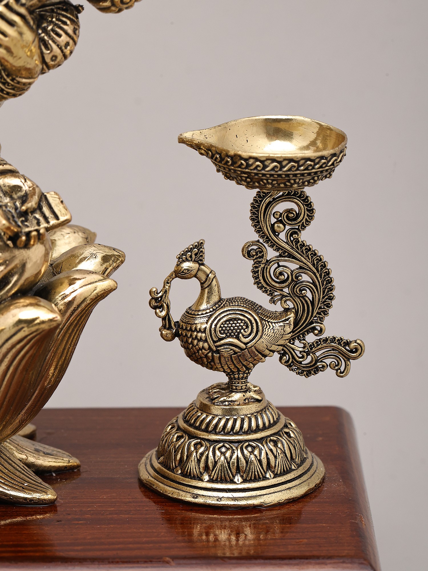 The presence of the peacock, her beloved vahanam or mount, flanking her on either side, adds another layer of symbolic richness. In Indian lore, the peacock is a creature of beauty, royalty, and pride, often associated with the divine, and its vibrant plumage is believed to ward off evil. Here, the peacocks are transformed into elegant oil lamps, their forms gracefully twirling upwards, ready to illuminate the surroundings with a soft, ethereal glow. This detail not only enhances the aesthetic appeal but also signifies the dispelling of ignorance with the light of knowledge, a central tenet of Saraswati's blessings. The entire tableau is mounted on a polished wooden base, providing a sturdy and elegant foundation that complements the radiant brass, creating a harmonious blend of natural materials and divine artistry.