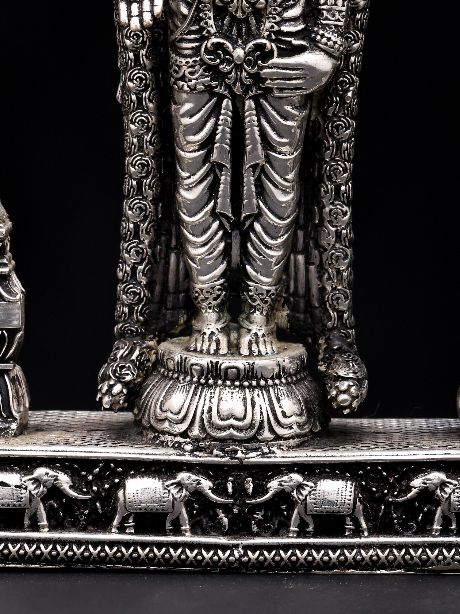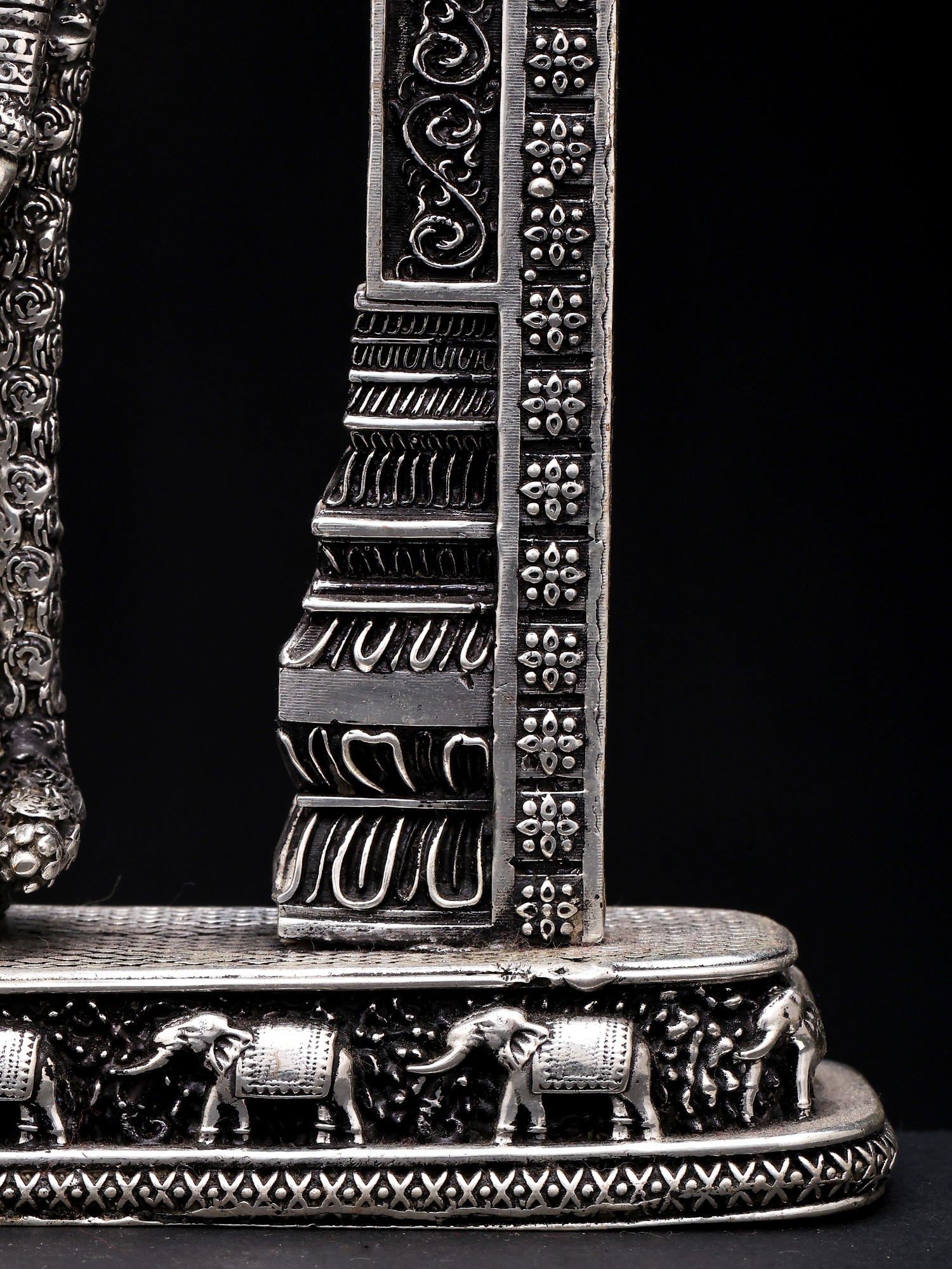 Lord Venkateshwara is one of the most revered deities in Hinduism, particularly in South India, where his temple at Tirumala is a pilgrimage site drawing millions of devotees annually. He is considered a manifestation of Lord Vishnu, the preserver and protector of the cosmos. Tales of his divine intervention and benevolent grace are abundant, inspiring profound faith and devotion. It is believed that worshipping Lord Venkateshwara brings prosperity, good fortune, and liberation from earthly troubles. This statue serves as a focal point for prayer and meditation, allowing devotees to connect with the divine energy of the Lord from the comfort of their homes. The finely detailed silver plating lends a luminous glow, accentuating the divine form and adding an element of regal splendor. The base of the sculpture is adorned with a procession of elephants, symbols of strength, royalty, and good fortune, further emphasizing the auspiciousness of this divine representation.