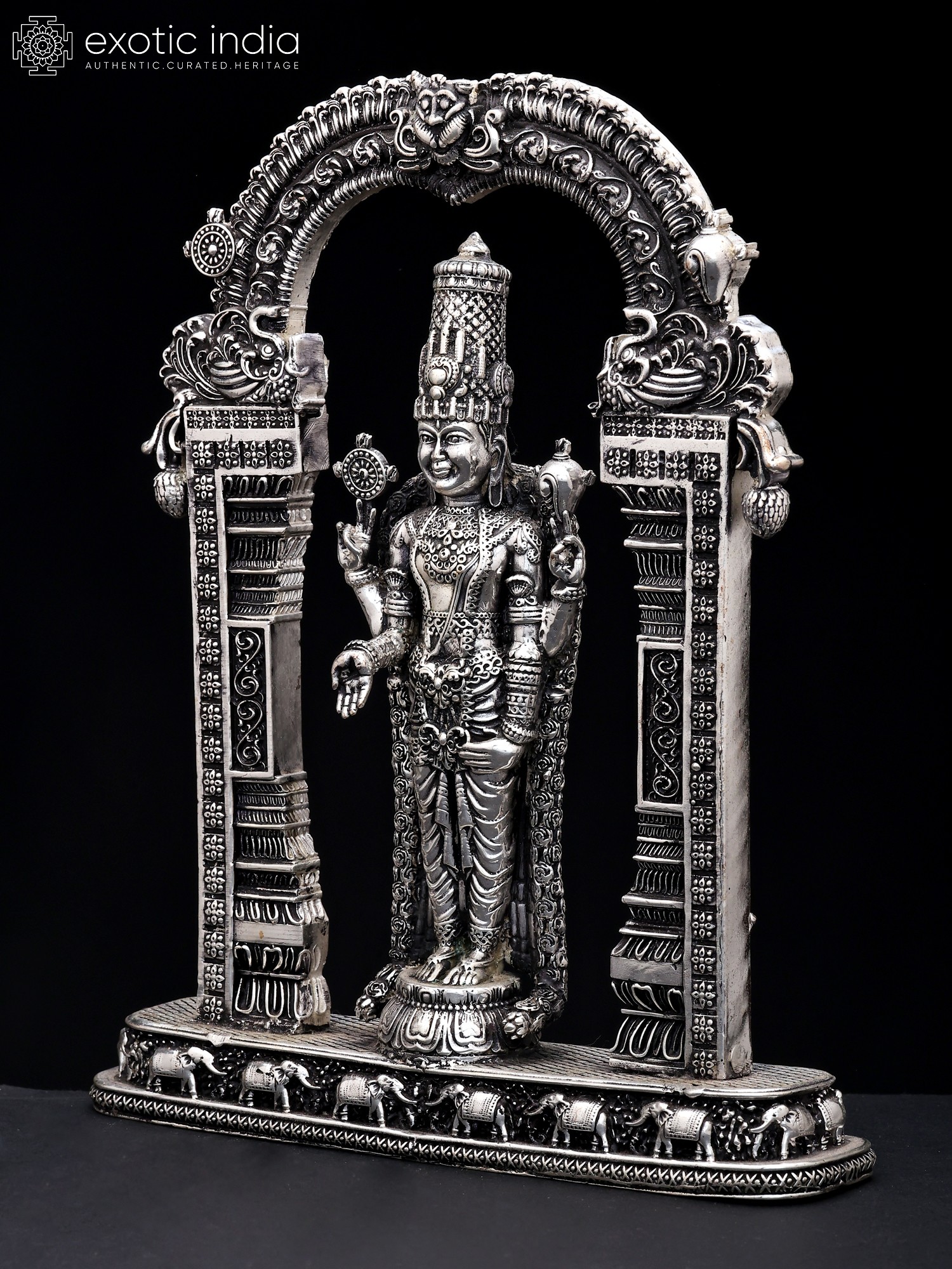 Behold this magnificent statue, an embodiment of divine grace and spiritual devotion. Crafted from high-quality brass and meticulously silver-plated, this exquisite piece captures the benevolent form of Lord Venkateshwara, also known as Balaji or Srinivasa. He stands tall and serene, adorned in intricate celestial garments and ornate jewelry, exuding an aura of peace and prosperity. His four hands are depicted in auspicious postures, each holding symbolic objects: a discus (Sudarshana Chakra) in the upper right, representing cosmic order; a conch shell (Panchajanya) in the upper left, signifying the sound of creation; and the lower right hand is raised in the Abhaya Mudra, offering protection and assurance to devotees. The lower left hand rests on his thigh, a gesture of calm stability.