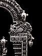 The divine figure is majestically seated upon the Kirtimukha throne, a powerful symbol in Vedic iconography. The Kirtimukha, meaning "face of glory," is a fierce, mask-like face with fangs and bulging eyes, often depicted devouring itself. In its spiritual context, it represents the power of divine will that overcomes all obstacles and illusions. Its presence here signifies Lord Venkateshwara's supreme dominion over the universe, a protector who vanquishes negativity and bestows blessings. The throne itself is a marvel of craftsmanship, featuring intricate carvings and architectural details that elevate the divine presence. The surrounding archway, reminiscent of temple gateways, further enhances the sacred ambiance, framing the Lord in a sanctuary of devotion.