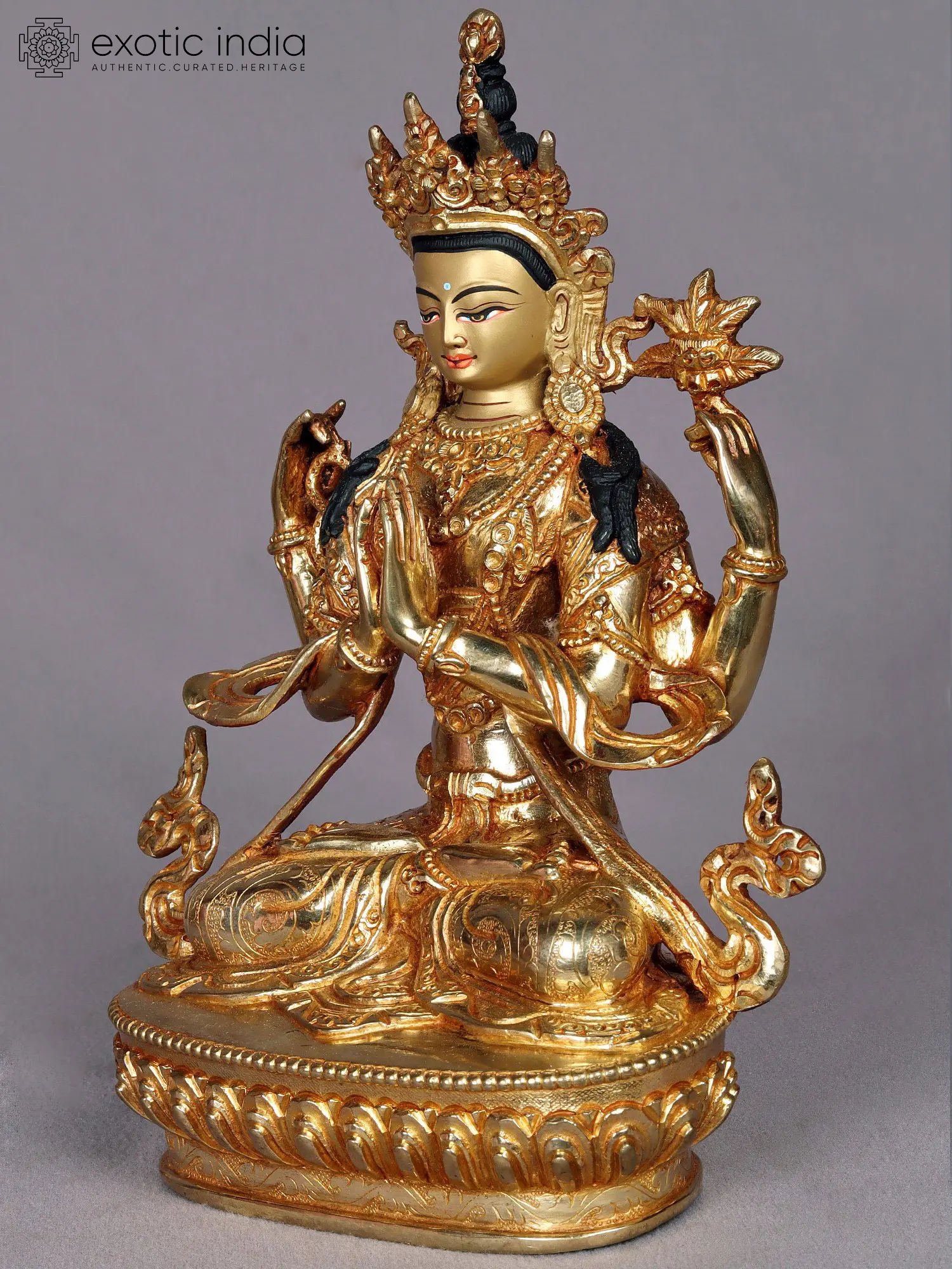 In his left hand, he cradles a lotus, representing liberation from suffering and the journey to enlightenment. Draped in silk attire, he sits in the meditative posture, atop a row of lotus petals, offering solace and compassion to all beings.