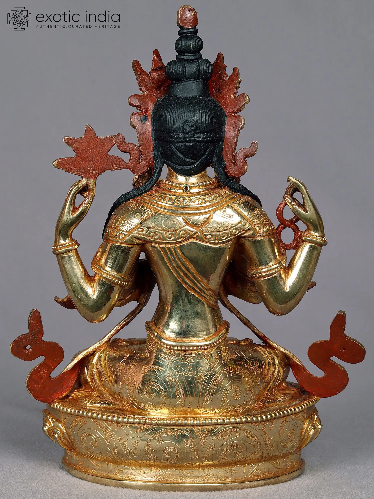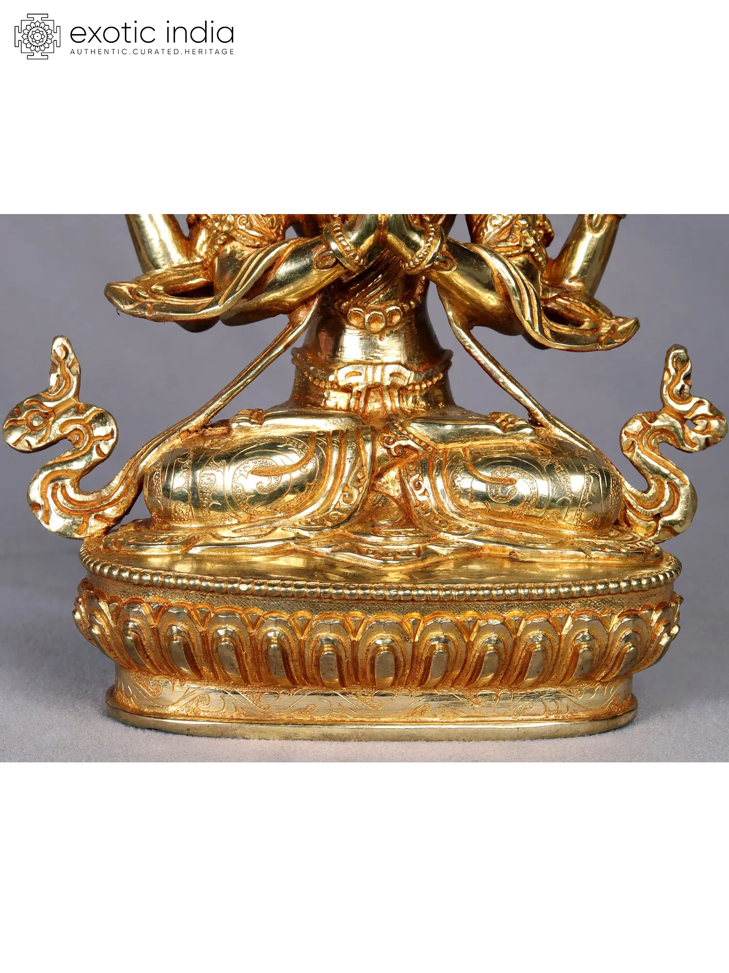 Chenrezig, the embodiment of compassion and purity, holds a sacred place among Buddhist deities. Despite being fully enlightened, he chooses to remain on Earth to aid its inhabitants. With his two front hands clasped in devotion at his heart adorned with jewels, he carries a crystal akshamala or rosary in his upper right hand, symbolizing the endless cycle.