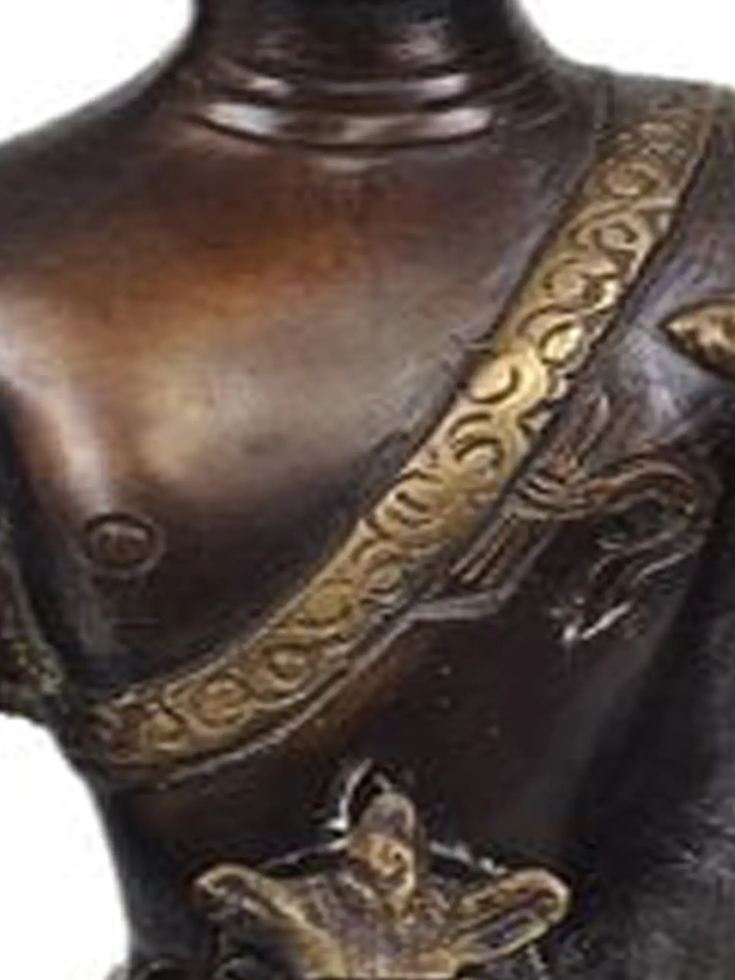 Find solace and healing energy with this handmade Brass Tibetan Buddhist Deity Medicine Buddha. This sacred statue, crafted in India, represents the compassionate and healing aspect of Buddhism. In Tibetan Buddhism, the Medicine Buddha is revered for his ability to heal physical and spiritual ailments. His serene expression and the aura of tranquility he exudes embody the belief in the interconnectedness of the mind, body, and spirit. The intricate craftsmanship on this brass idol reflects the beauty of the Buddhist philosophy of inner peace. Having the Medicine Buddha in your home encourages the path to holistic well-being and reminds you of the healing power within us all.