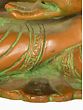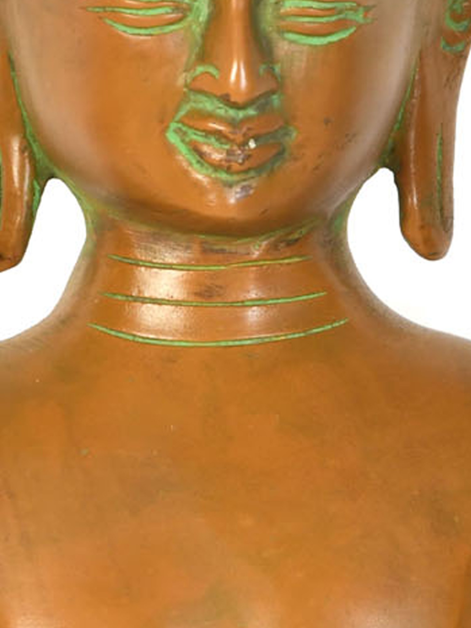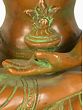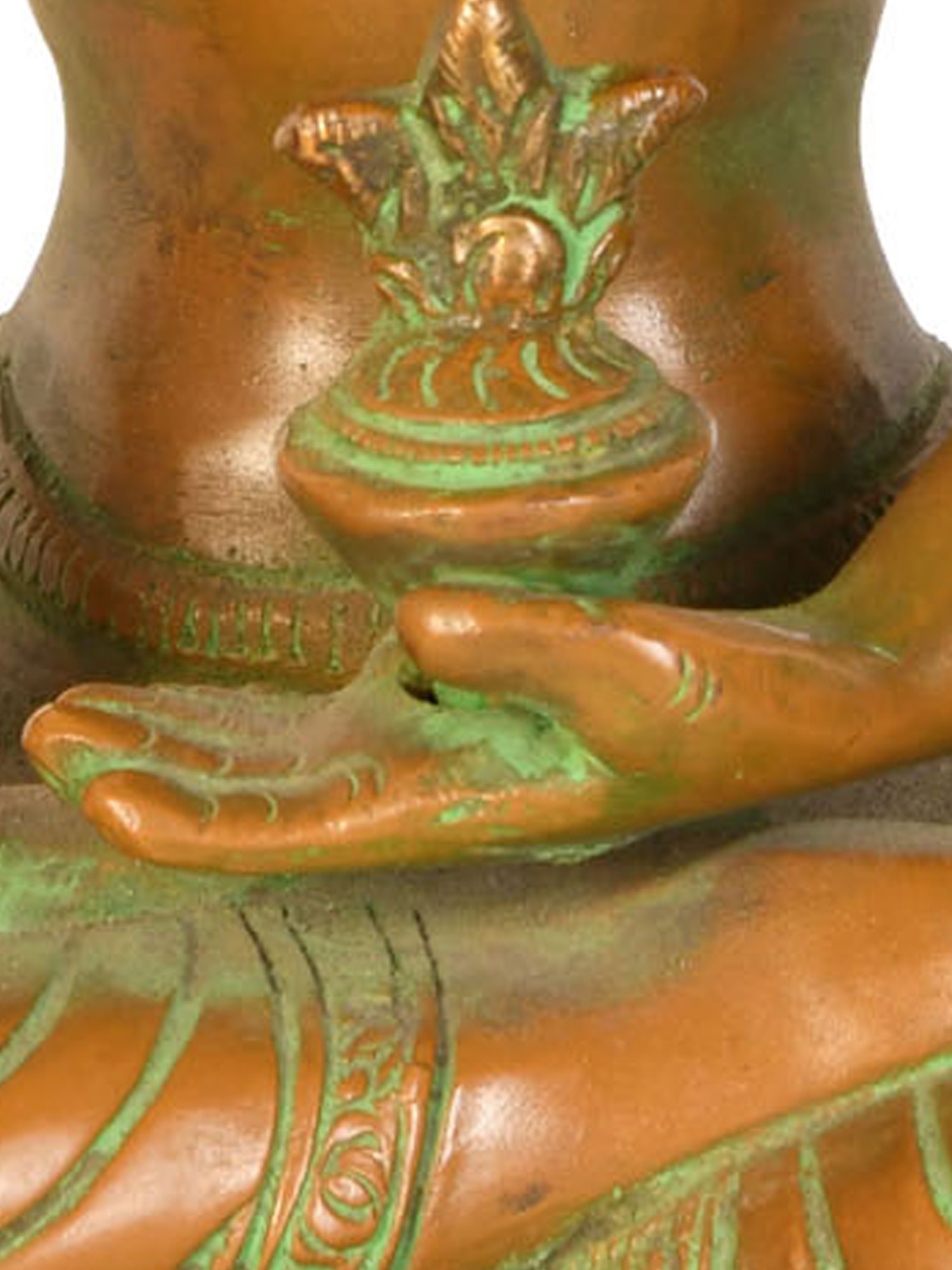 This exquisite brass statue captures the serene presence of the Medicine Buddha, also known as Bhaisajyaguru. Seated in a meditative posture, this divine figure radiates an aura of peace, healing, and profound compassion. The intricate craftsmanship of this 9-inch sculpture speaks to the rich artistic traditions of Tibetan Buddhism, where such representations are not mere decorations but potent symbols of spiritual aspiration and refuge. The Medicine Buddha is a central figure in Mahayana Buddhism, revered as the master of healing arts and the dispeller of suffering. According to Buddhist lore, he made twelve great vows to heal all beings from sickness, mental anguish, and the cycle of rebirth. His form is often depicted holding a medicine bowl filled with medicinal herbs, symbolizing his power to cure all ailments. In this statue, his right hand rests in the *vitarka mudra* or gesture of teaching, while his left hand is in *dhyana mudra* or meditation, cradling a small vessel from which delicate, stylized herbs emerge. This posture underscores his dual role as a source of wisdom and a healer. ––––––––––