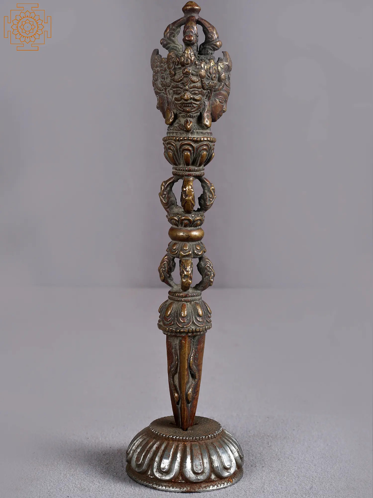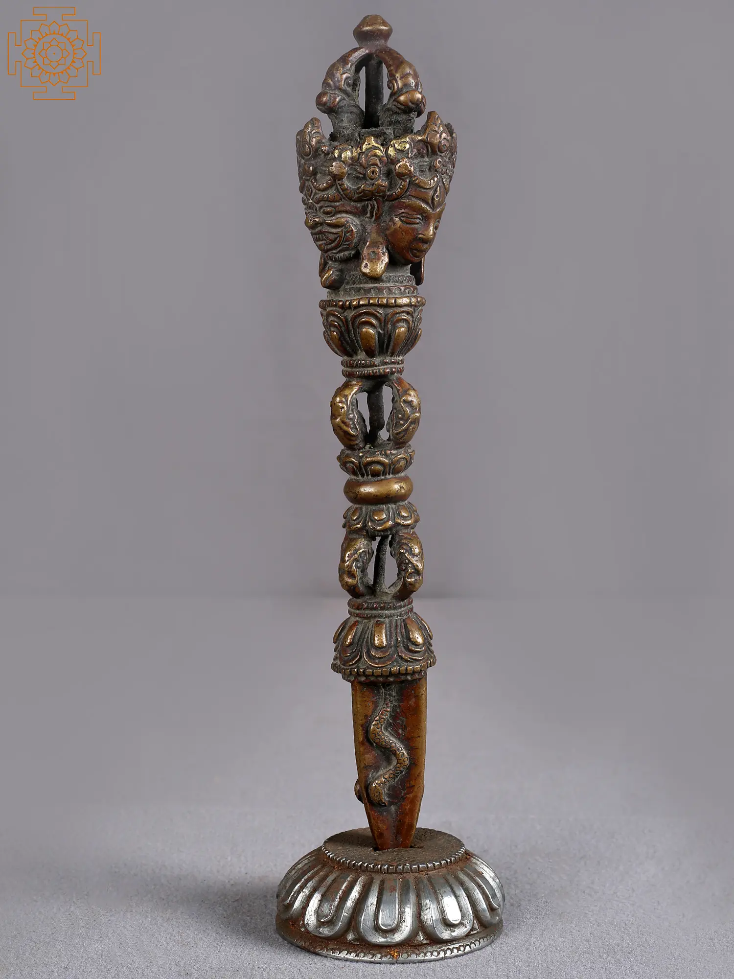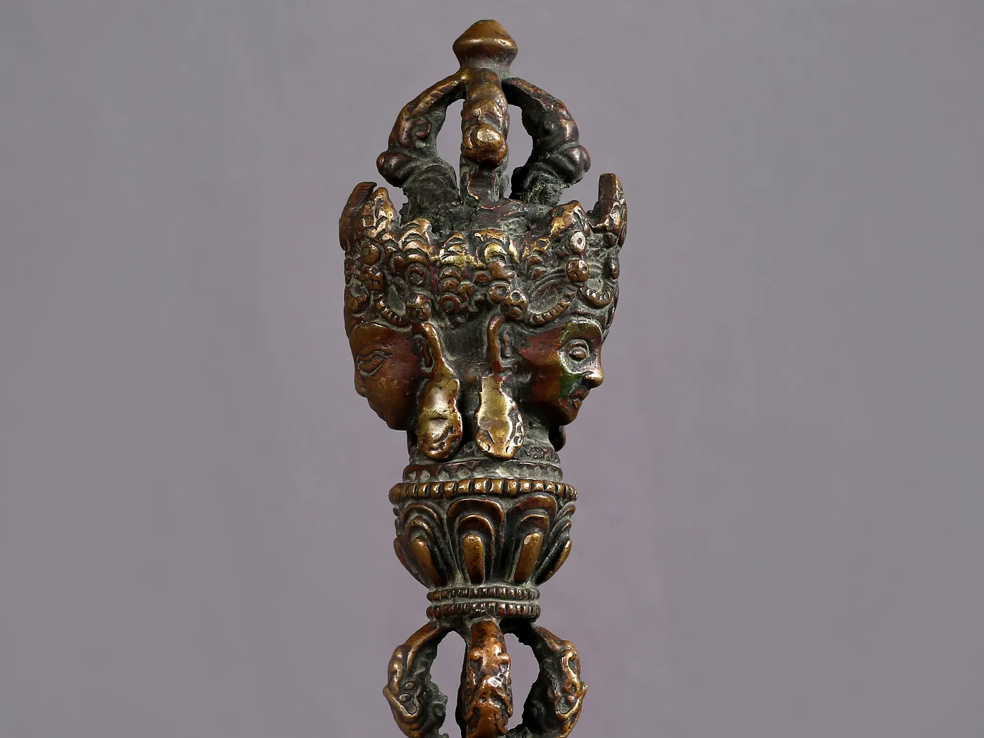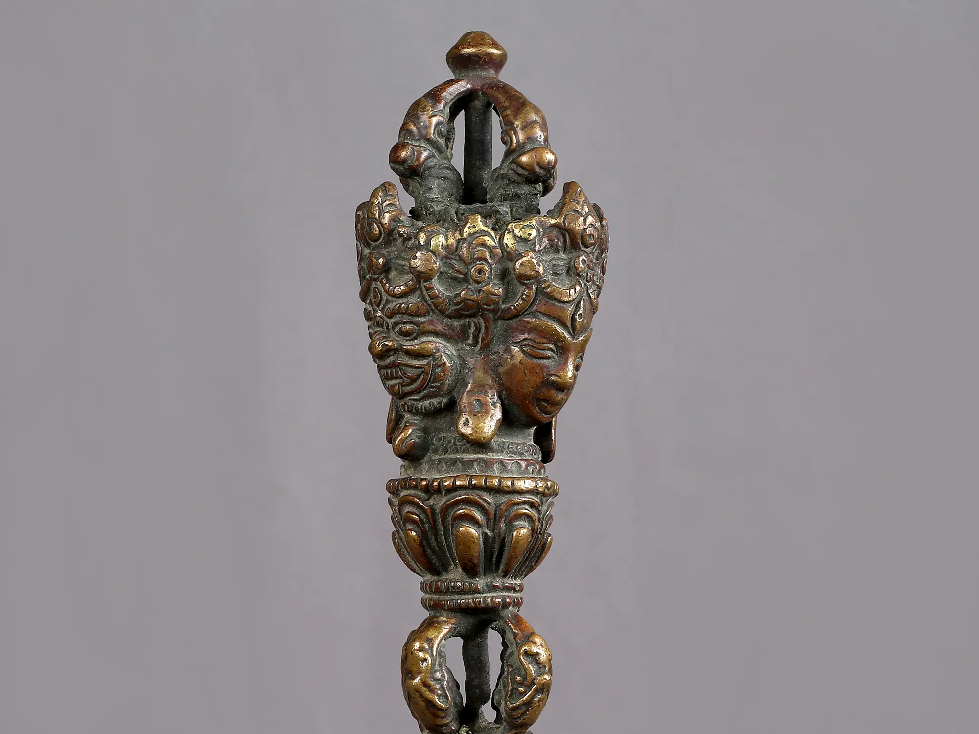 The Ritual Dagger with the triple-bladed dagger, nail, or spike known as ‘Kila’ in Sanskrit and ‘Phurpa’ in Tibetan Buddhism, originated from Vedic India as the stake or post to which domestic animals, or those intended for ritual sacrifice, were tethered. It is believed that from its early Nyingma origins, the practice of Vajrakilyaya as a yidam deity with the power to cut through any obstructions was absorbed into all schools of Tibetan Buddhism. As the ultimate weapon that cuts through hatred and stabs demonic obstructions, the phurba realizes its most symbolic form as the representation of Vajrakailaya, with three heads, six arms, and his lower body forming the blazing triple-sided blade of a pointed dagger.
