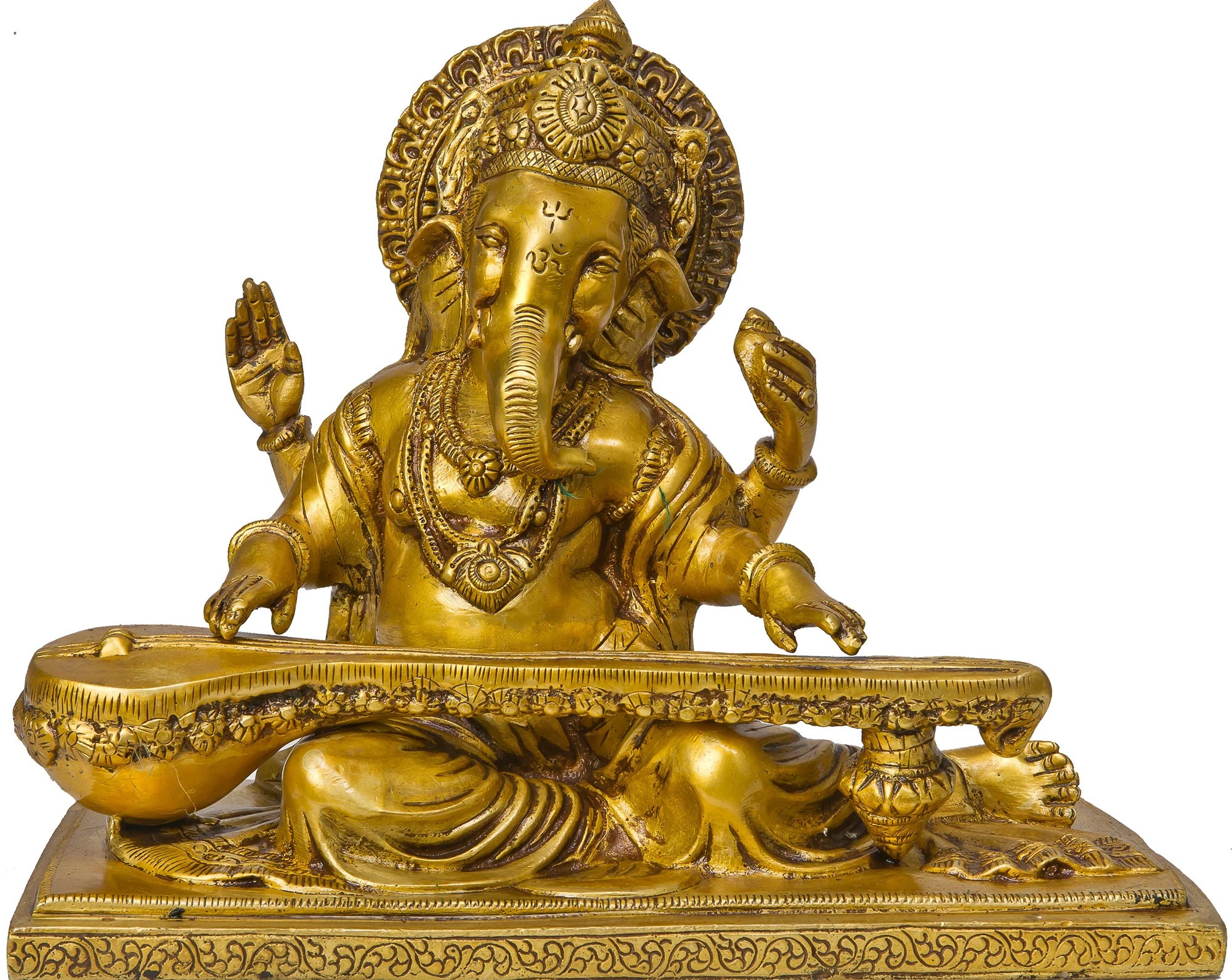 This handcrafted brass sculpture showcases Vina-vadaka Ganapati, the deity of music and art. Seated in serene grace, Ganapati holds a veena (musical instrument), symbolizing the harmony of melody and spirituality. The sculpture emanates a sense of tranquility and creativity. Ganapati's presence is an artistic reminder of the soul's connection to the rhythm of the universe, a melody that resonates through every heart and soul.