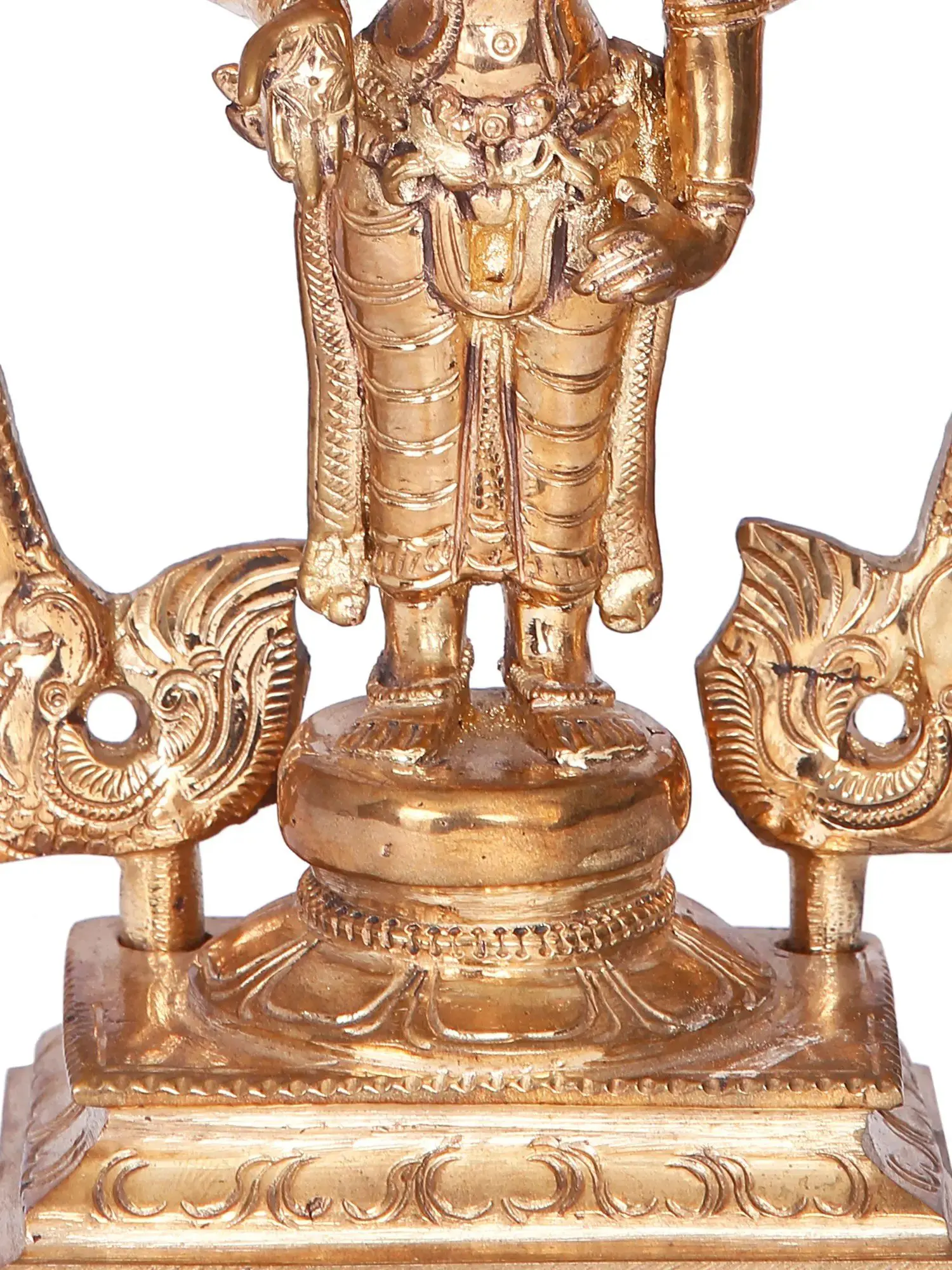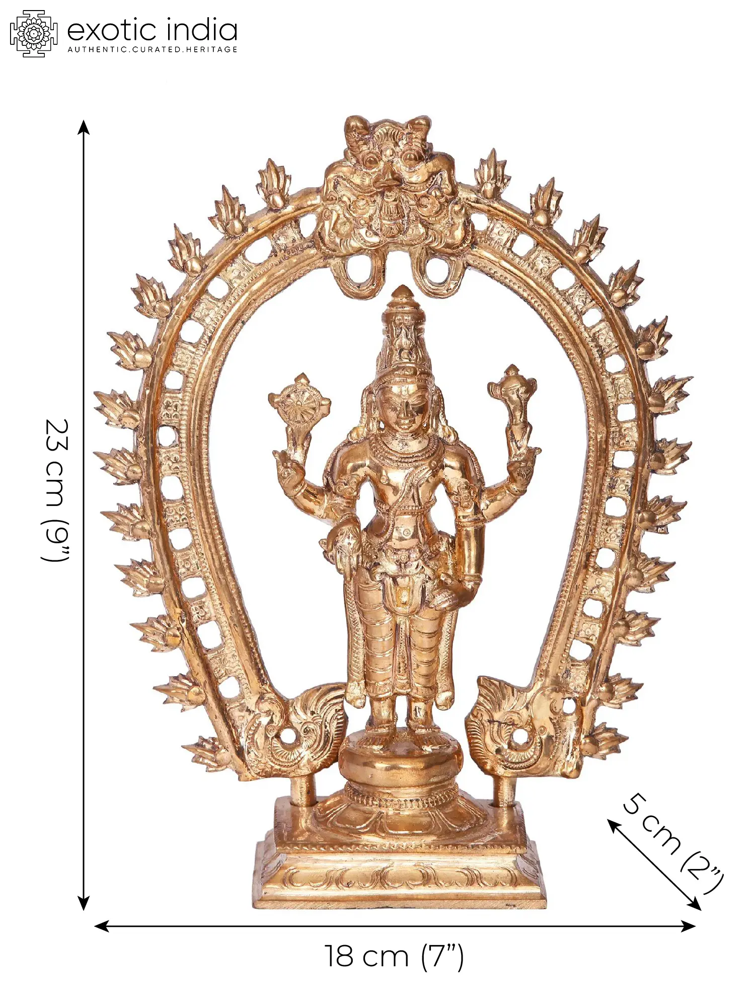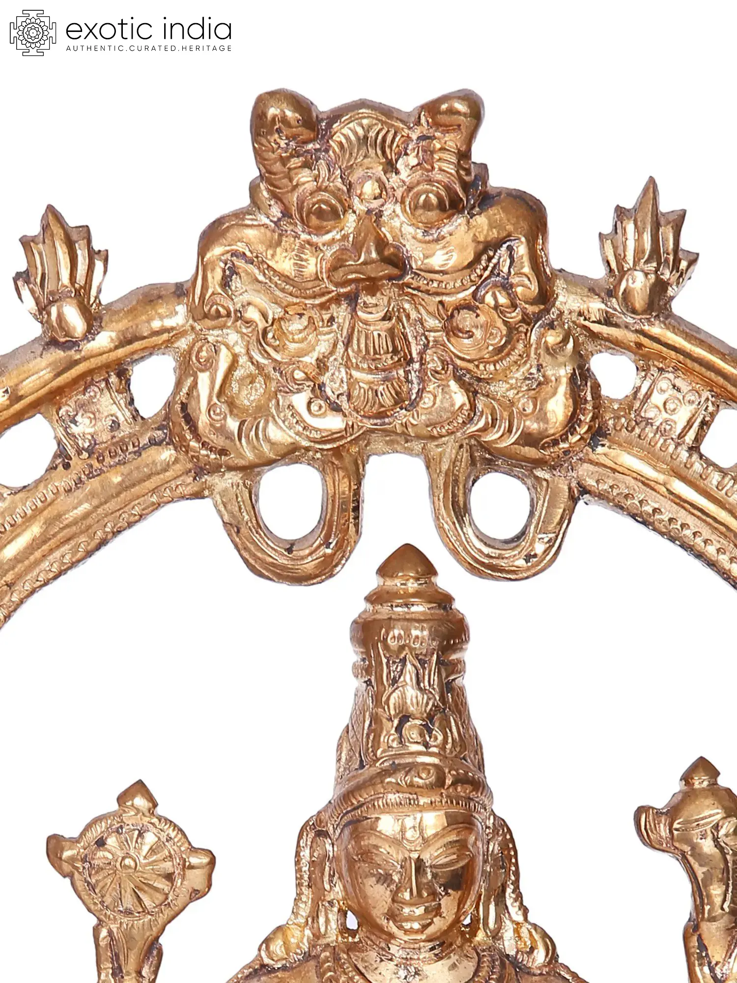 Elevate your sacred space with the Lord Venkateshwara sculpture, adorned in a Prabhavali with Kirtimukha, crafted through Madhuchista Vidhanam in Swamimalai's Panchaloha Bronze. This artistic marvel encapsulates the Hindu philosophical concept of 'Divine Protection,' symbolising Lord Venkateshwara's role as the protector of devotees. The lost-wax technique intricately details the deity within the ornate Prabhavali, evoking a sense of divine grace and sanctity. Invite the benevolent energy of Lord Venkateshwara into your surroundings, embracing the divine protection and blessings.