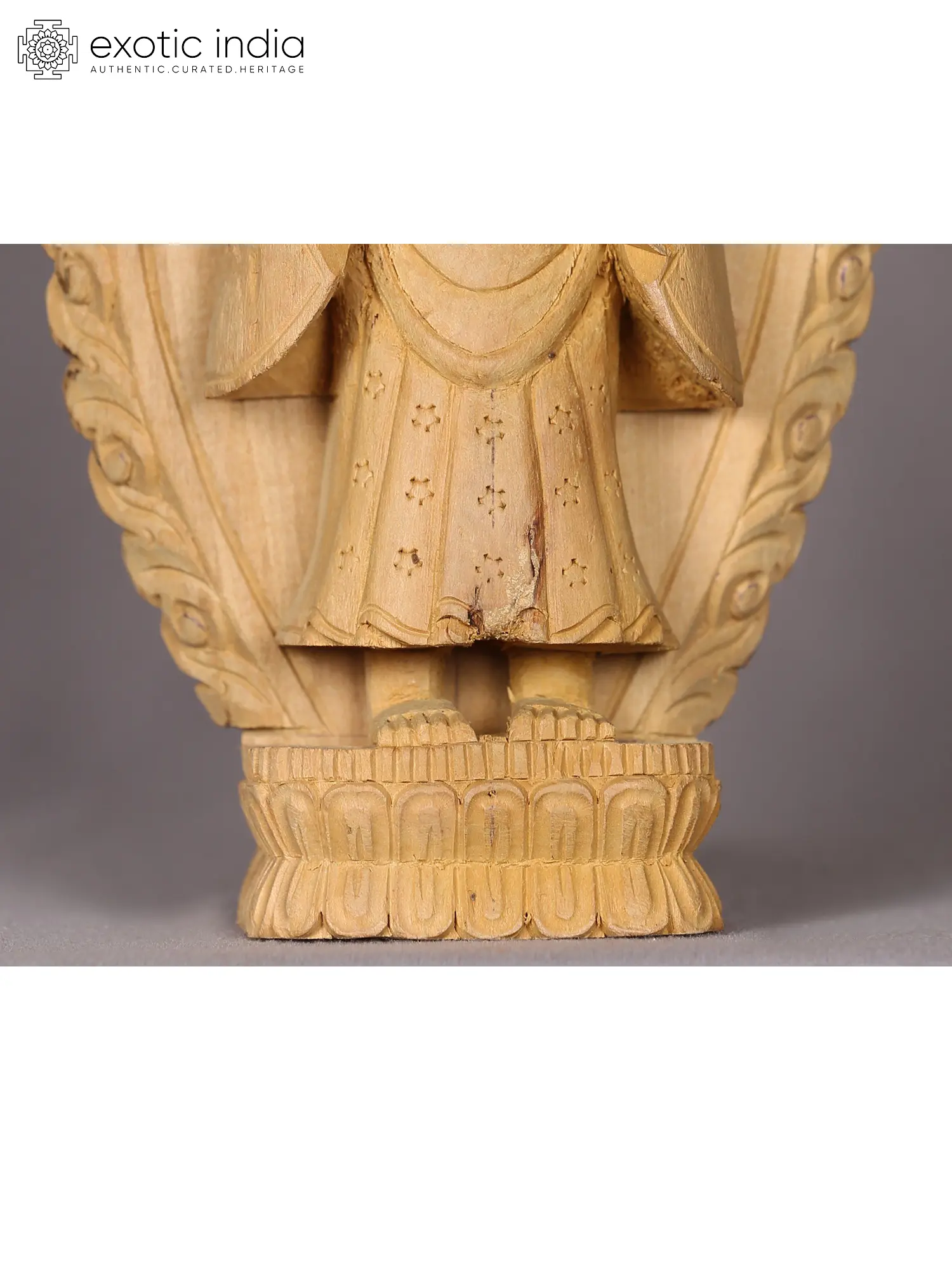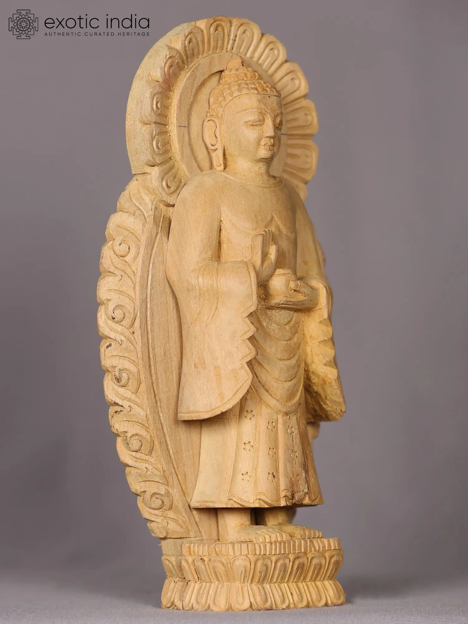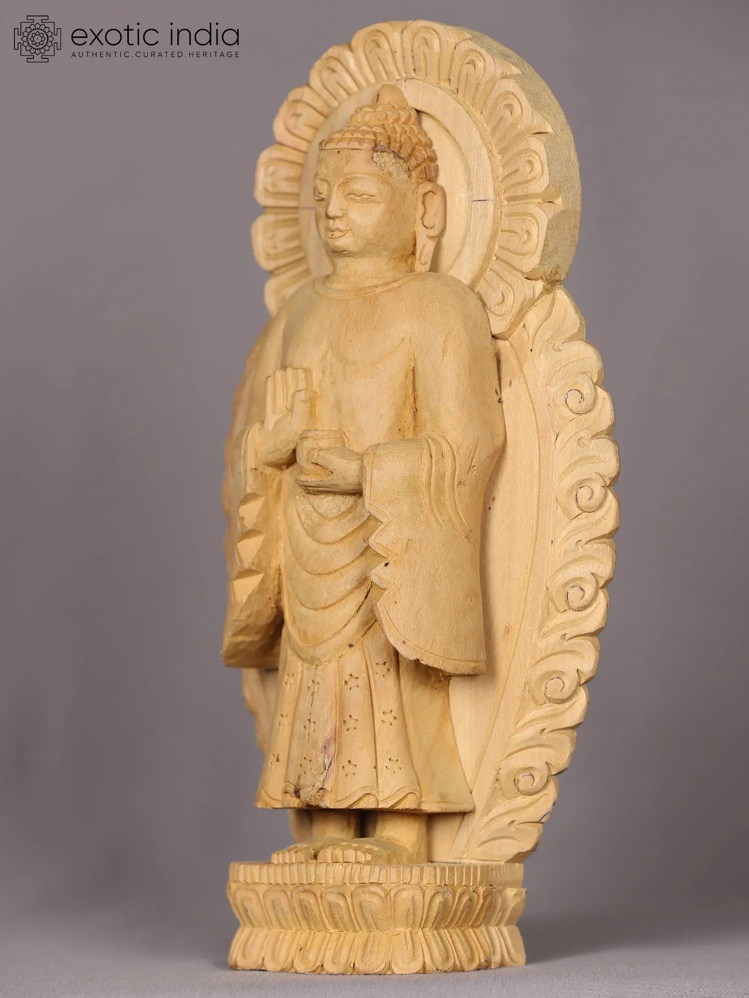Crafted with care and devotion, this Nepalese Buddha statue is a testament to the enduring artistry of wood carving traditions. Nepal, a land blessed with deep spiritual heritage and a rich Buddhist history, has long been a center for the creation of sacred objects. The subtle variations in the wood grain and the natural color of the material lend each statue its unique character. The halo-like nimbus behind the Buddha's head, often depicted as a circular flame or radiating light, symbolizes the Buddha's omniscient consciousness and the brilliant illumination of his teachings that dispels the darkness of ignorance. The lotus base upon which the Buddha stands is another potent symbol in Buddhism, representing purity and spiritual awakening, as the lotus blooms beautifully from muddy waters. This statue is more than just an object of art; it is a tangible link to centuries of spiritual pursuit and a reminder of the profound potential for inner peace and enlightenment that resides within each of us.