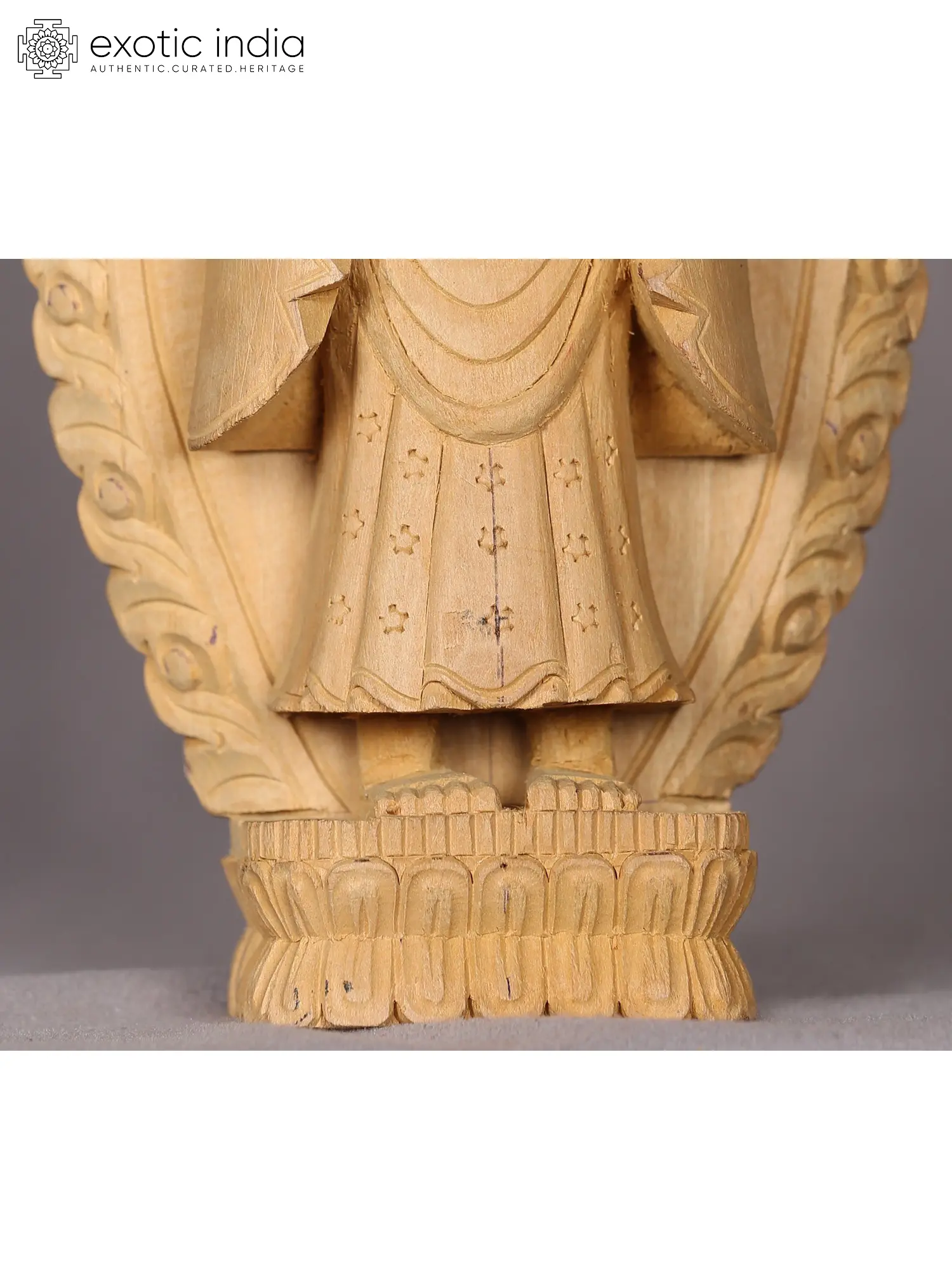 This exquisite wooden sculpture embodies the tranquil essence of Lord Buddha, a figure revered across the globe for his teachings of compassion, wisdom, and enlightenment. Carved with meticulous detail, the statue captures a moment of profound peace, inviting contemplation and inner calm into any space it graces. The natural grain of the wood lends a warm, organic texture to the representation, making it a tactile and visually appealing piece. The form of the Buddha is depicted standing, radiating an aura of quiet strength and serenity. His robes are rendered with soft, flowing lines, suggesting movement and grace. The delicate carving of his facial features – the serene eyes, the gentle curve of his lips, and the subtle hint of a smile – convey a sense of profound understanding and equanimity. His hands are held together in a gesture that often signifies meditation, teaching, or the reception of offerings, depending on its precise articulation. This particular mudra, with palms cupped and fingers touching, evokes a sense of stillness and inner focus, mirroring the state of deep meditative absorption that characterized the Buddha's path to awakening.