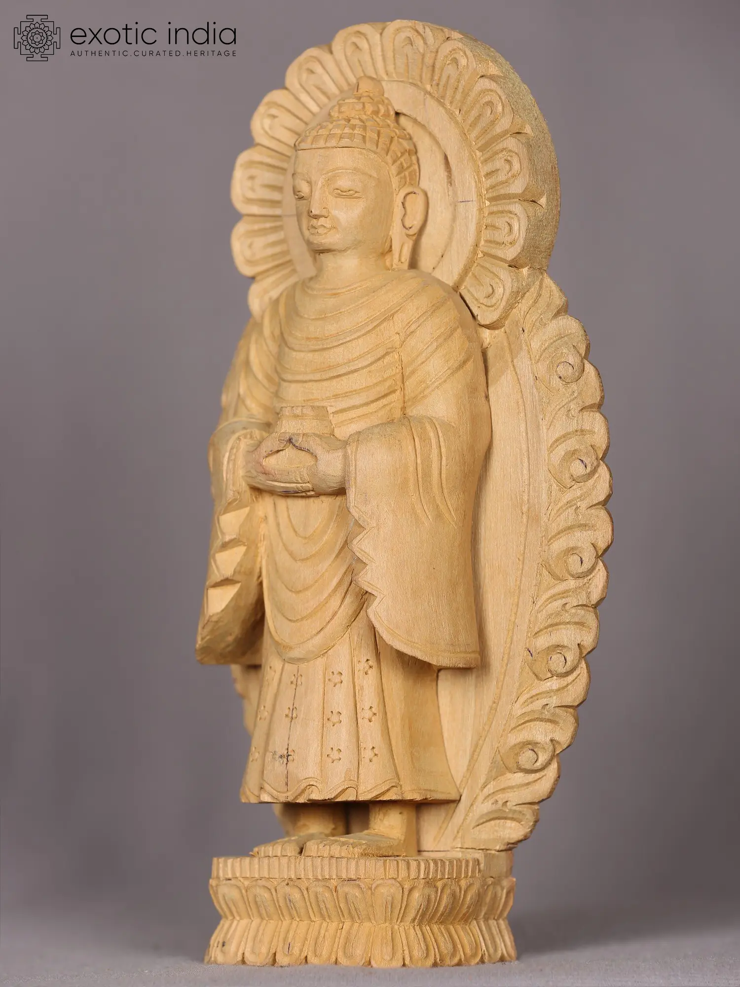 The artistic style of this sculpture hints at the rich heritage of Nepalese Buddhist art, a tradition that has flourished for centuries, drawing inspiration from both Indian roots and the unique cultural landscape of the Himalayas. Nepalese craftsmanship is renowned for its fine detailing, particularly in the carving of religious icons. The lotus base upon which the Buddha stands is a potent symbol in Buddhism, representing purity, spiritual awakening, and the unfolding of consciousness, much like a lotus flower emerges unstained from muddy waters. The halo behind the Buddha's head, with its radiating patterns, signifies his divine wisdom and illumination, separating him from the mundane world and highlighting his enlightened status. The wood itself, likely a light-colored hardwood, allows the delicate chisel work to stand out, creating subtle play of light and shadow that accentuates the three-dimensional form. This piece is more than just a decorative object; it is a conduit for spiritual reflection, a tangible reminder of the Buddhist path towards peace and understanding. It can serve as a focal point for meditation practice or simply as a source of calming energy in a home or office.