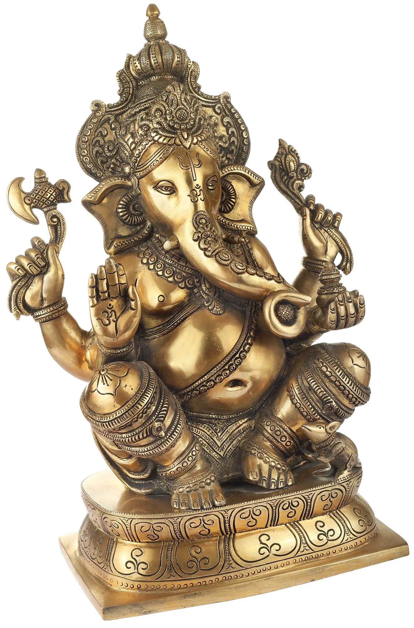 Elevate your sacred space with this magnificent brass statue of Lord Ganesha, exuding an aura of divine majesty and profound wisdom. Crafted with meticulous attention to detail, this piece captures the beloved deity in a posture of serene contemplation, adorned with a resplendent, kingly crown. The intricate carvings that adorn the crown speak of Ganesha's supreme authority as the remover of obstacles and the bestower of good fortune. His visage, a perfect blend of gentle kindness and powerful presence, is further enhanced by the traditional 'Om' symbol etched on his forehead, a universal representation of the primordial sound and the essence of all existence. The statue portrays Ganesha seated regally on an elaborately decorated pedestal. His multiple arms are adorned with various divine instruments, each holding symbolic significance. In one hand, he gracefully holds an axe, representing his power to sever attachments and illusions. In another, a delicate lotus, symbolizing purity, spiritual awakening, and self-realization. His raised hand offers a gesture of blessing and protection, showering devotees with abundance and well-being. The presence of his divine vehicle, the tiny mouse, at his feet signifies his mastery over desires and the ability to overcome even the most cunning of obstacles.