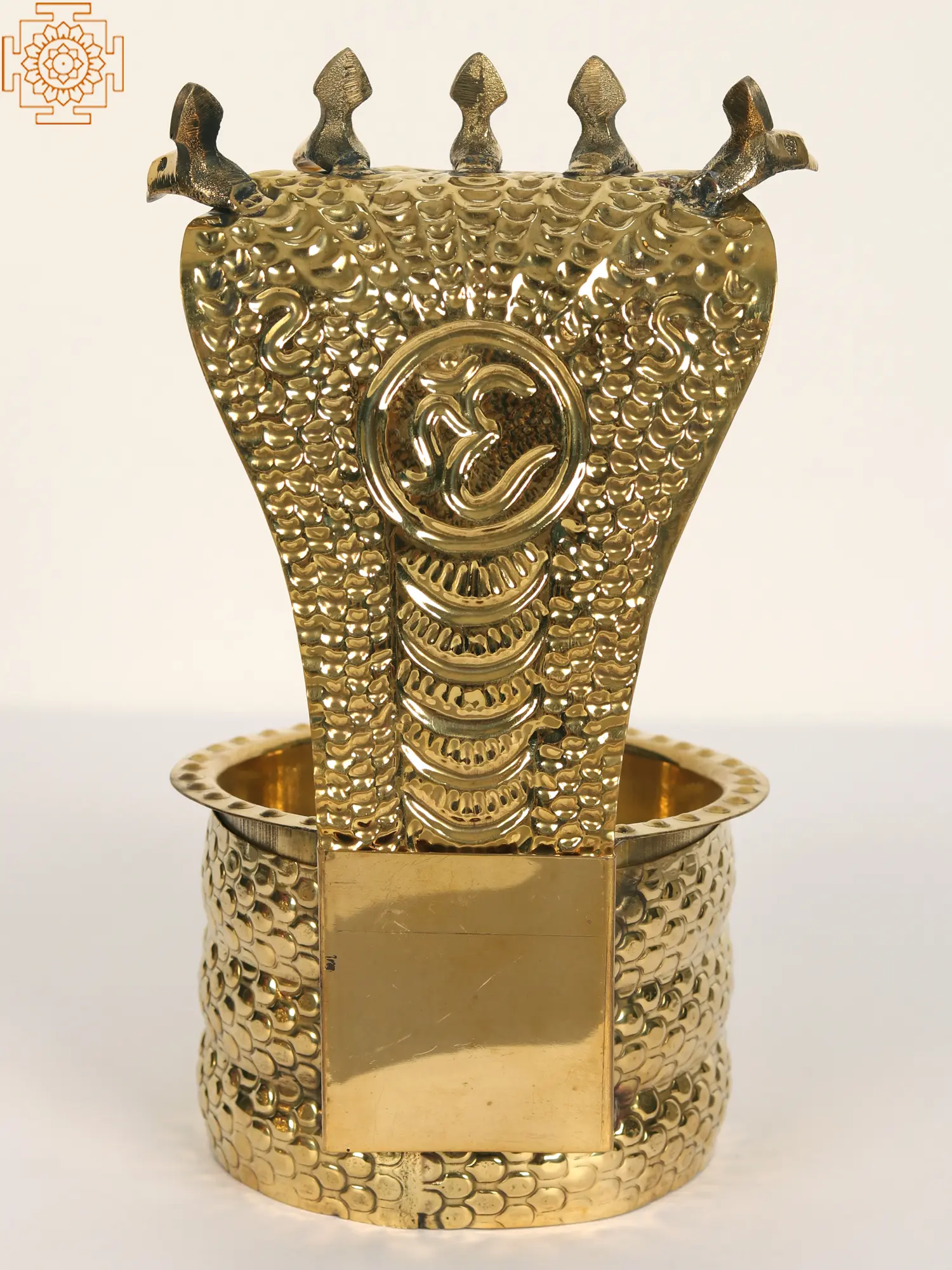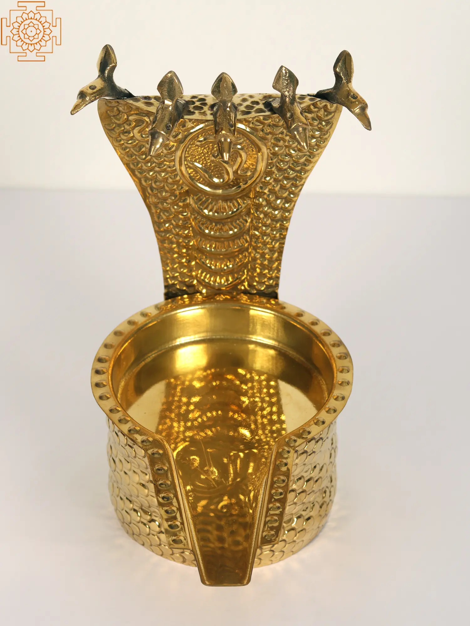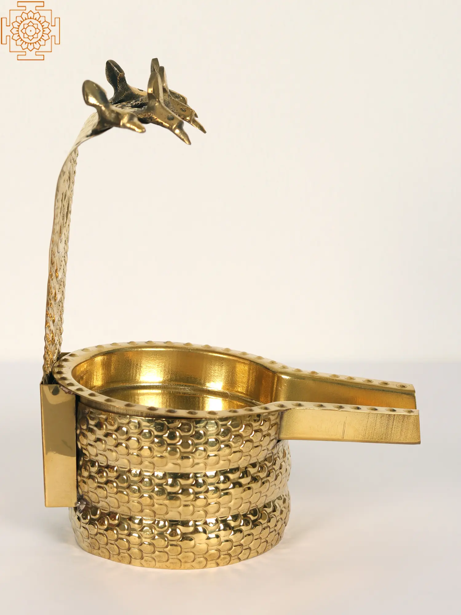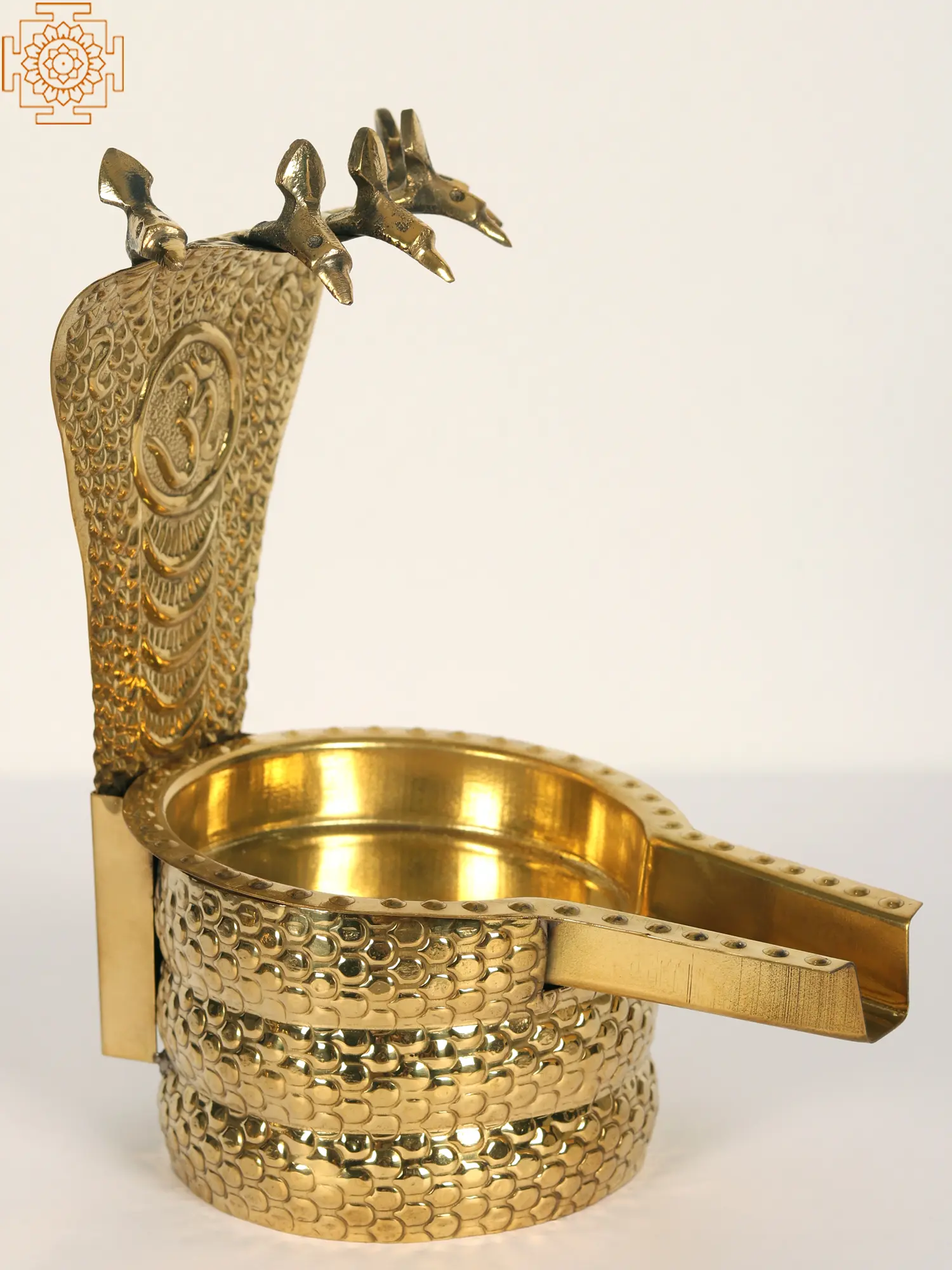 This Abhishek Patra, featuring Lord Shiva and the sacred serpent, weaves a tale of cosmic significance. Lord Shiva, the divine yogi, cradles the Patra symbolizing the cosmic ocean of consciousness. The serpent coiled around his neck represents the untamed energy of creation. As the bearer of the Ganga, Shiva's matted locks channel the river's purity and power. The crescent moon adorning his head signifies time's cyclical nature. This sculpture invites us to witness the serene union of the divine and the elemental reminder that within chaos, there exists a tranquil center.
