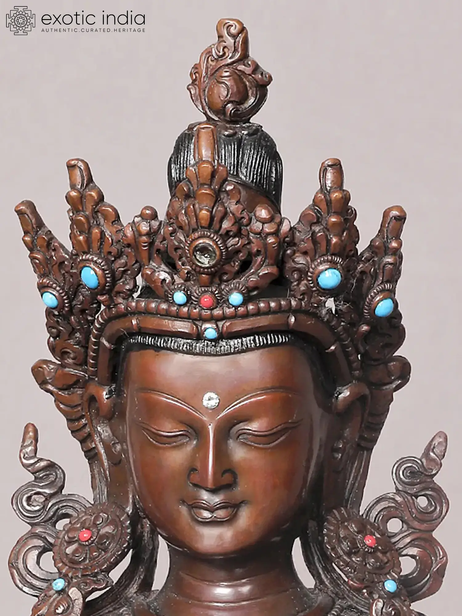 This masterpiece is a testament to the skilled craftsmanship of Nepalese artisans, who have preserved and perfected the art of Buddhist sculpture for centuries. The use of high-quality copper ensures the durability and aesthetic appeal of the statue, while the intricate carving and the precise placement of precious stones showcase the dedication and spiritual devotion of the creators. Each element, from the lotus base to the uppermost ornament of the crown, is imbued with symbolic meaning and artistic brilliance, making this sculpture a profound object of veneration and a stunning work of art. It is an ideal centerpiece for any altar, meditation space, or collection dedicated to Buddhist art and spirituality.