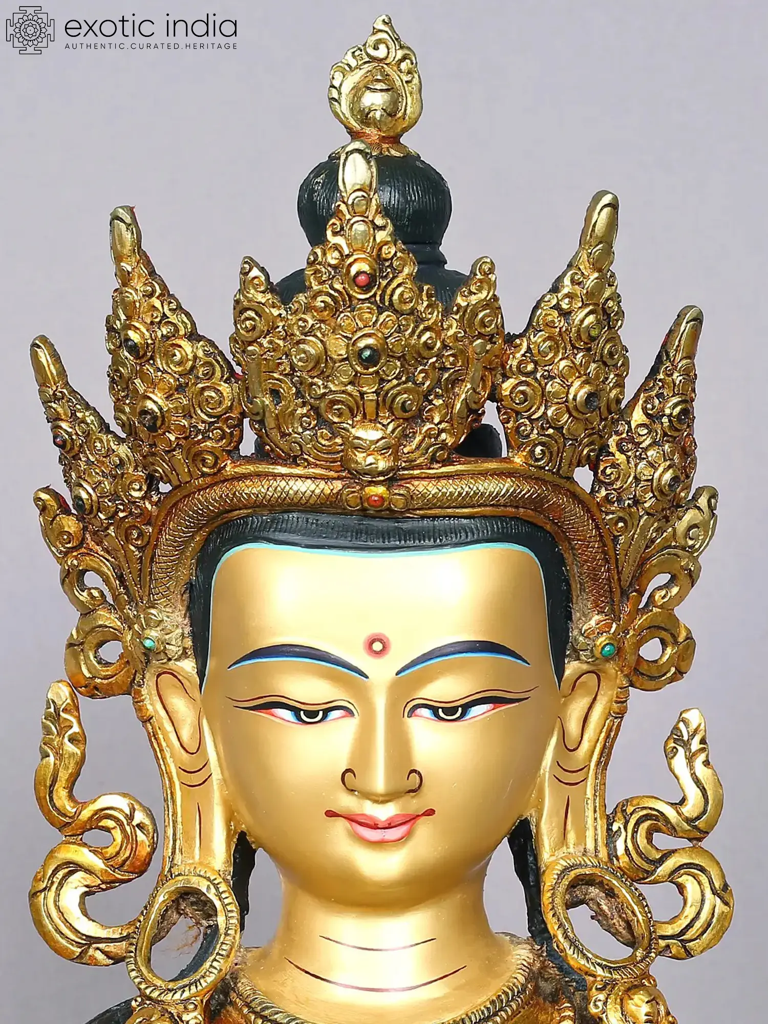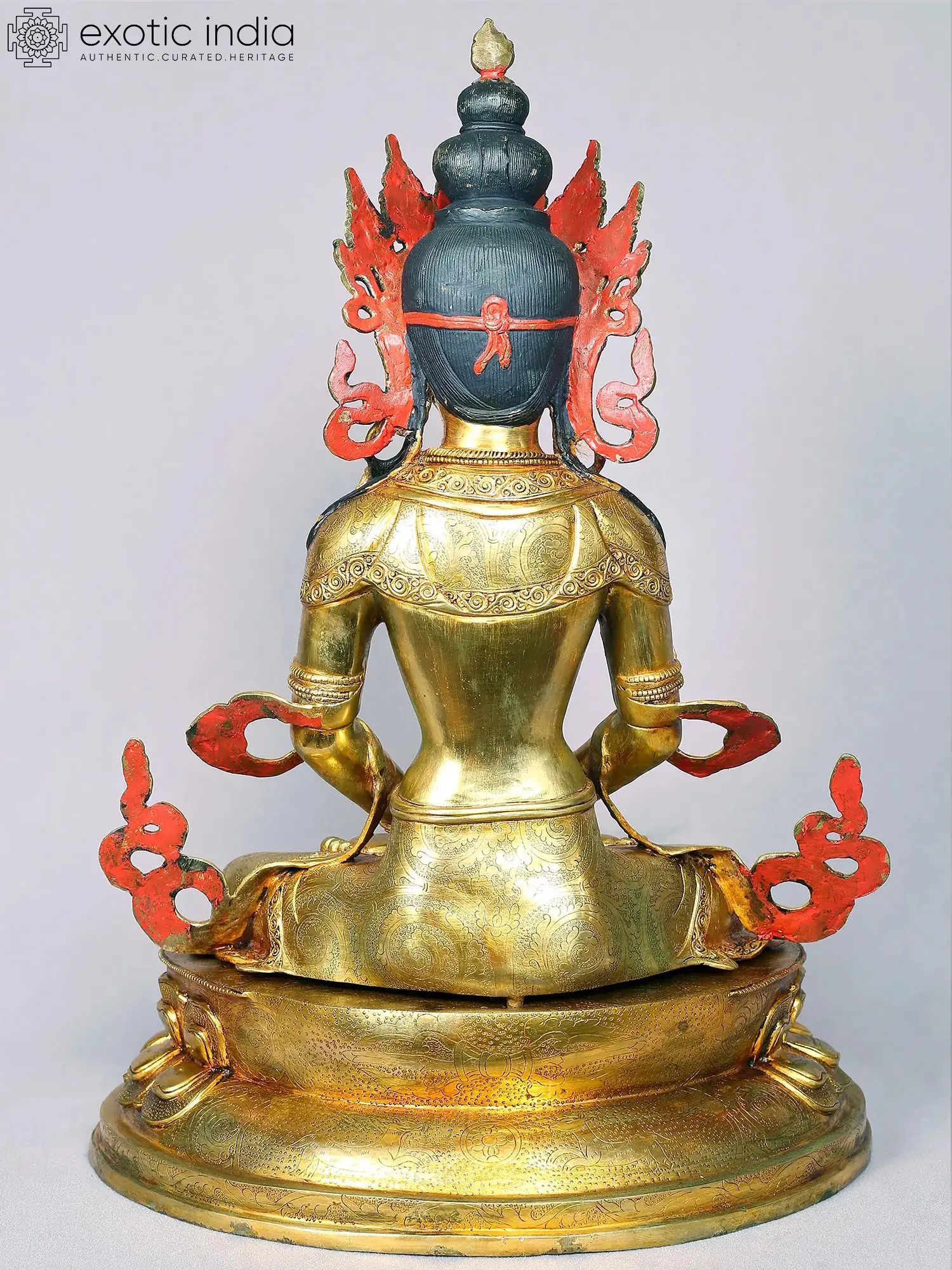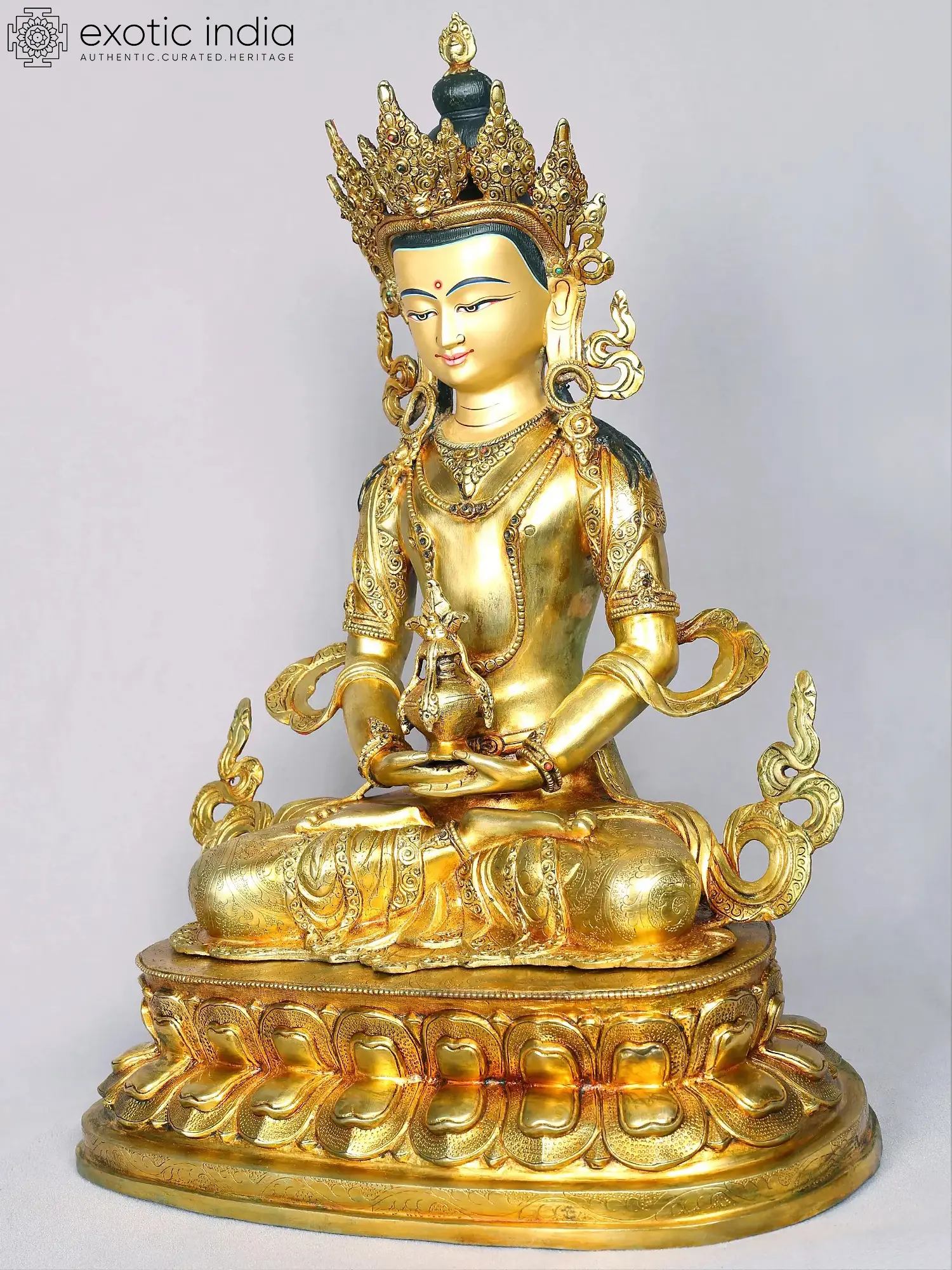 Envisioned as an immensely youthful celestial being, with a slender form, Amitayus, the Lord of Eternal Life in Buddhism is depicted in this gilded copper Nepalese statue, holding a pot of ambrosia in his hands placed in the mudra or gesture of meditation. Life-affirming waters overflowing from the pot, mystically swaying frills of the crown, curls formed by the scarf, and the heavenliness in Amitayus’s eyes bring an awe-inspiring richness to the statue. With a masterful use of incised lines, motifs such as Vajra, dhamma chakra, and deer, are added to the reverse of the golden throne of Amitayus.