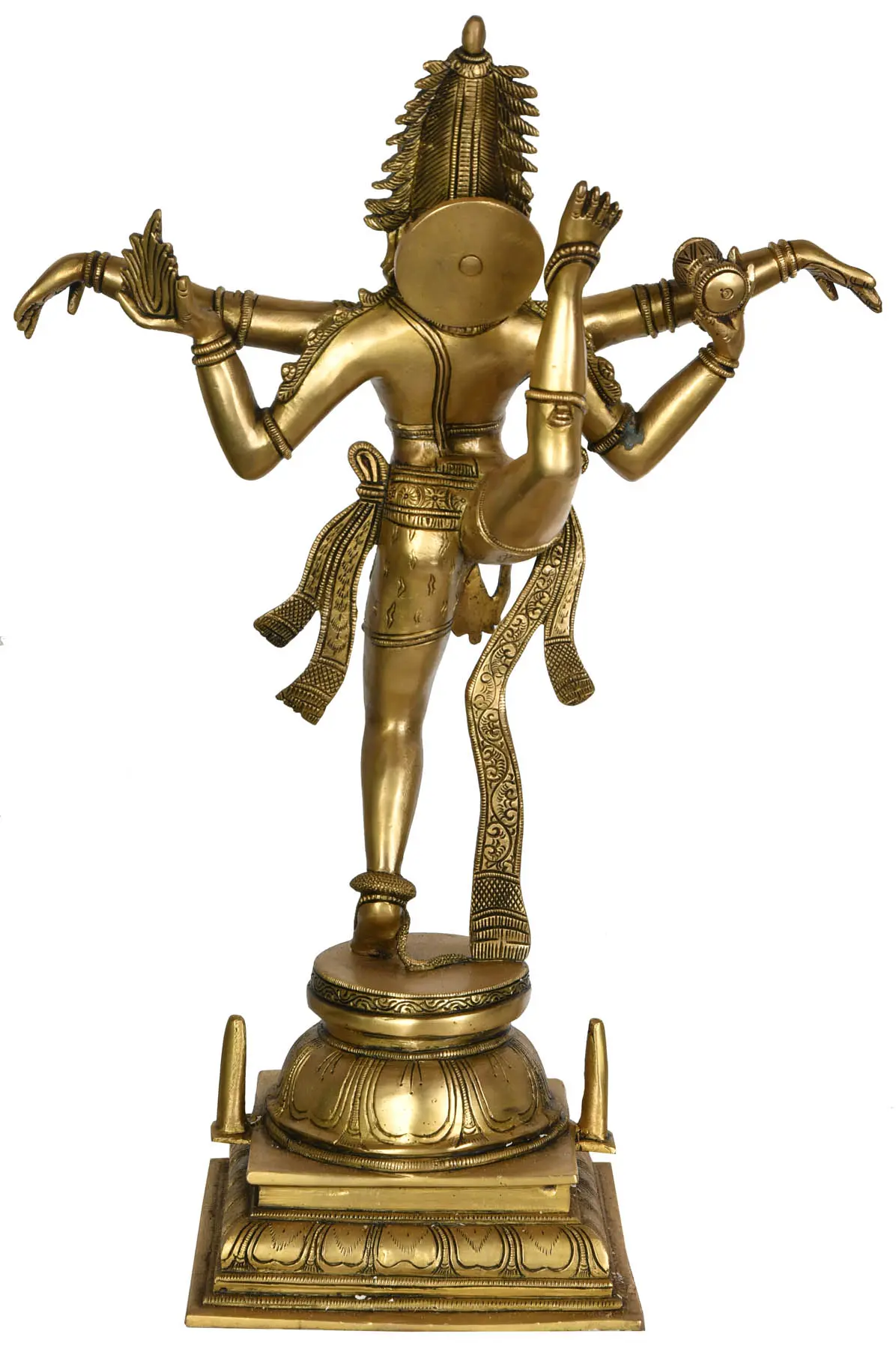 This magnificent brass statue of Shiva in his Ananda Tandava form is a powerful focal point for any home or meditation space. It serves as a constant reminder of the cyclical nature of life, the transformative power of change, and the ultimate dance of existence. The presence of such a divine representation is believed to bestow peace, protection, and spiritual growth. Whether you are a devotee of Shiva or an admirer of masterful craftsmanship and profound symbolism, this statue is a truly captivating piece that will enrich your environment and inspire contemplation. Its substantial presence makes it a commanding piece that commands reverence and admiration.