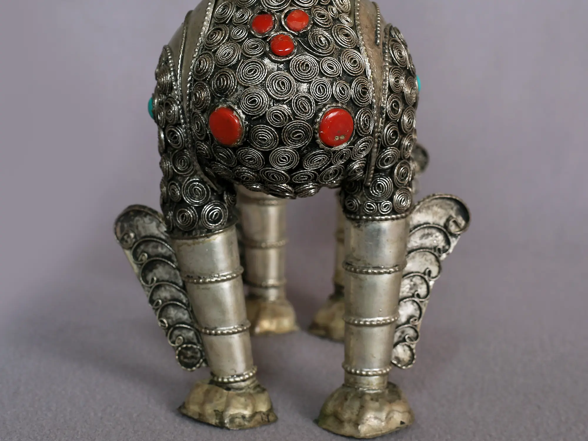 Each of these impressive pieces is a testament to skilled artistry. The body of each guardian is intricately adorned with delicate, swirling filigree, creating a textured and visually captivating surface. This detailed metalwork is further enhanced by the vibrant embellishments of striking turquoise and warm coral-colored stones, along with deep blue lapis lazuli. These precious stones are not only beautiful but also hold significant symbolic meaning in various ancient traditions. Turquoise is often associated with healing and protection, while coral is believed to bring good luck and ward off the evil eye. Lapis lazuli, known for its celestial blue hue, has long been linked to wisdom and spiritual enlightenment. The thoughtful placement of these gemstones draws the eye and adds a layer of profound meaning to the overall design.