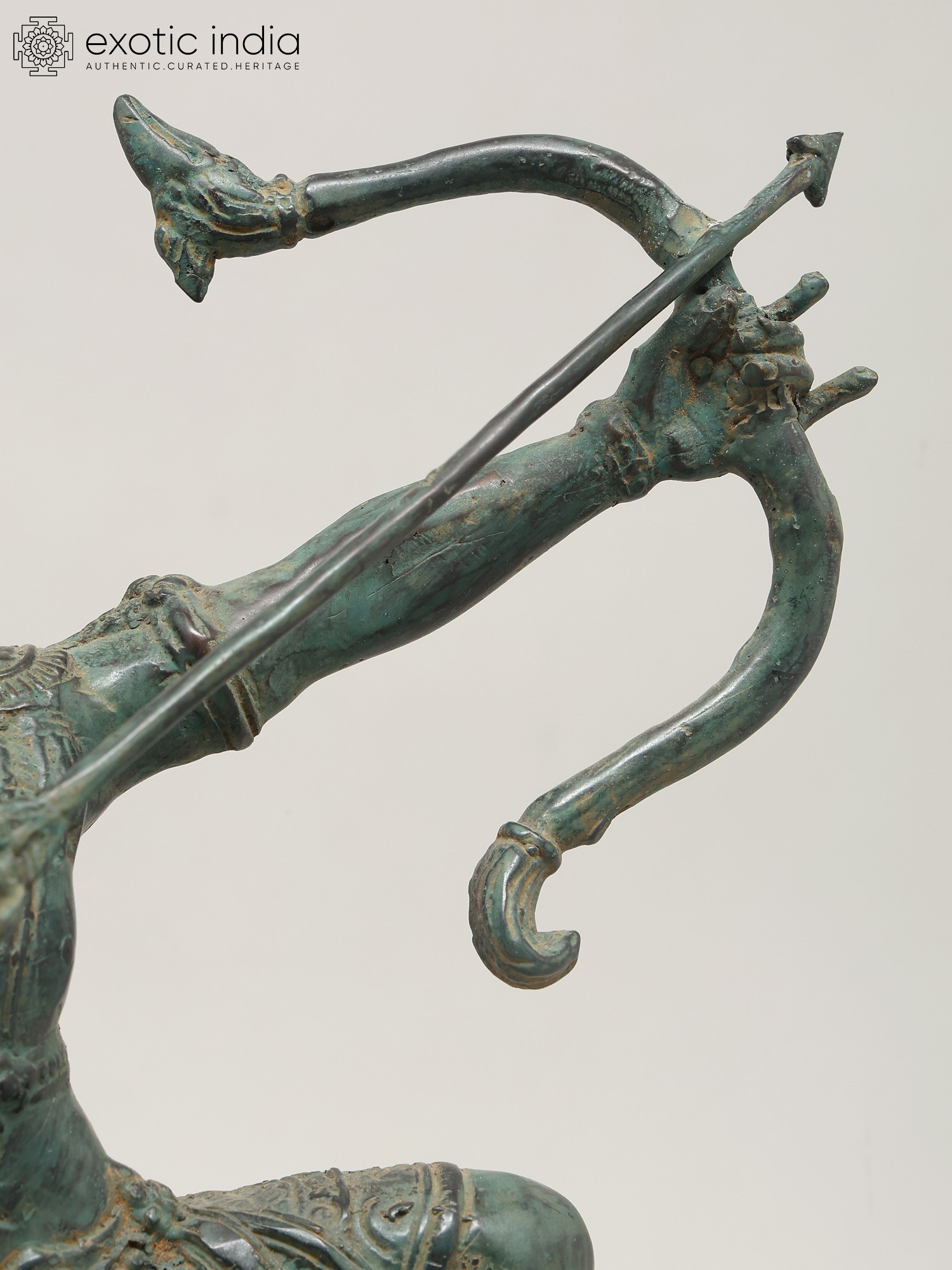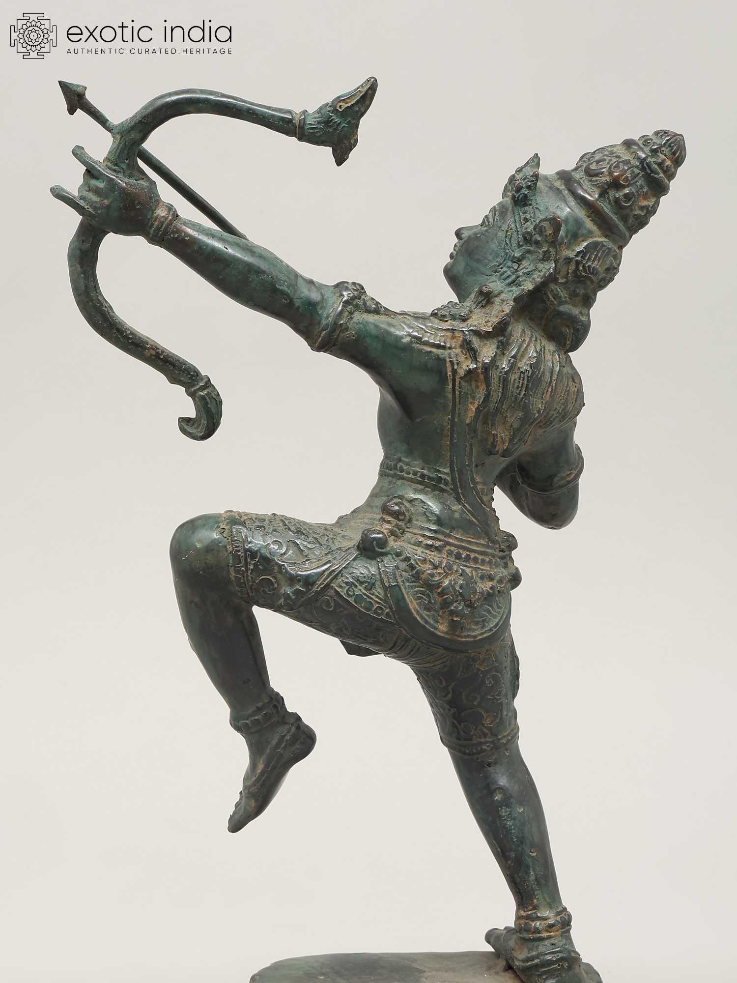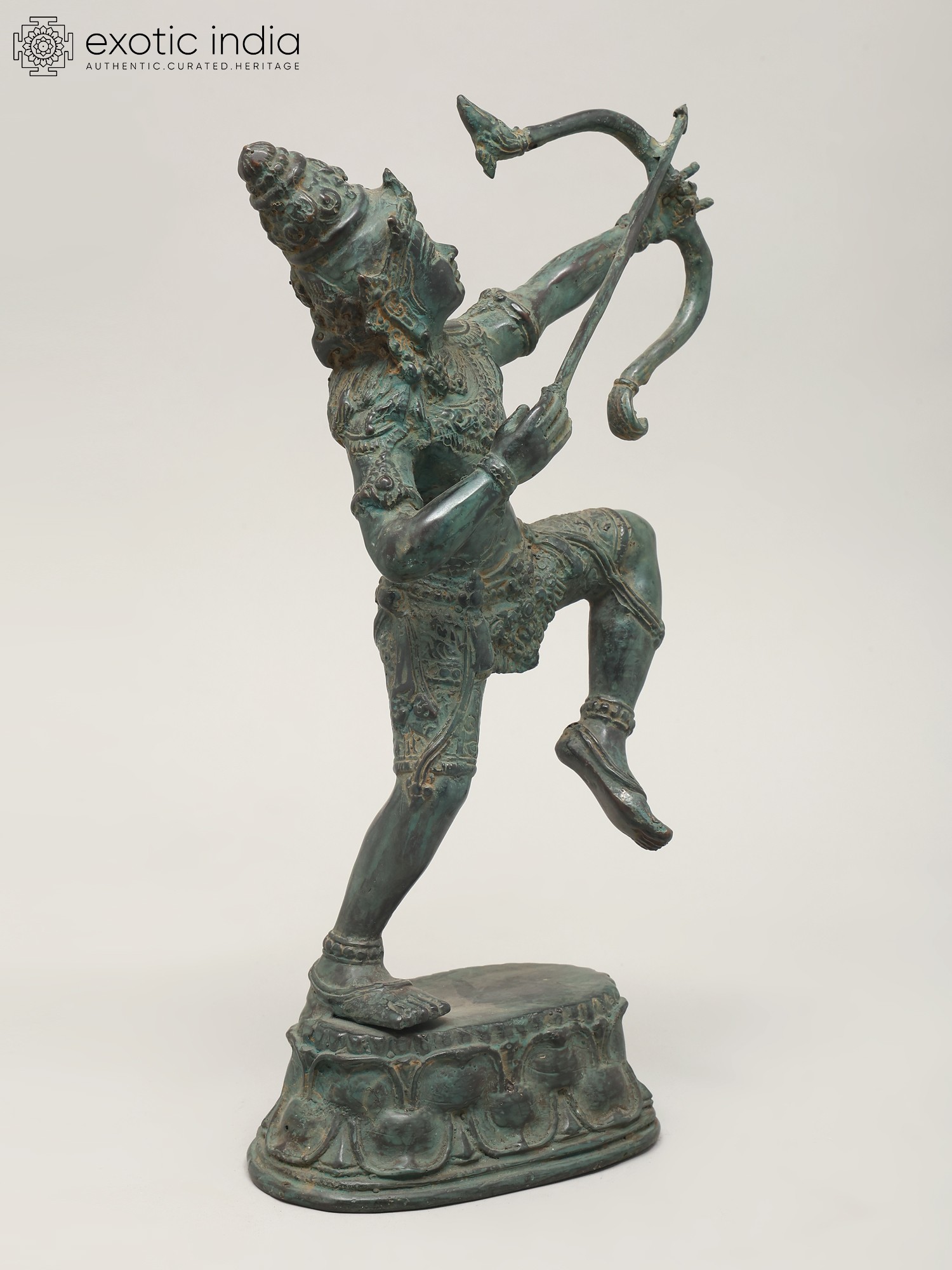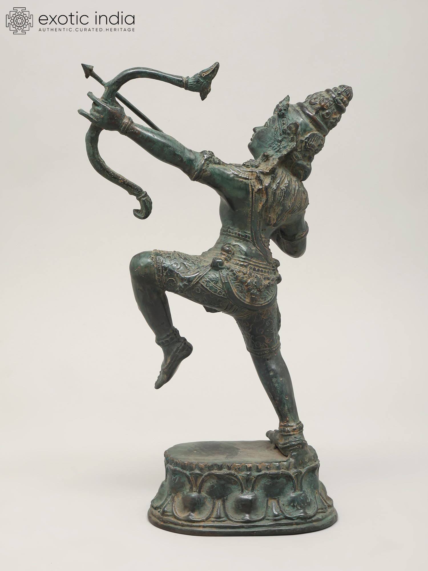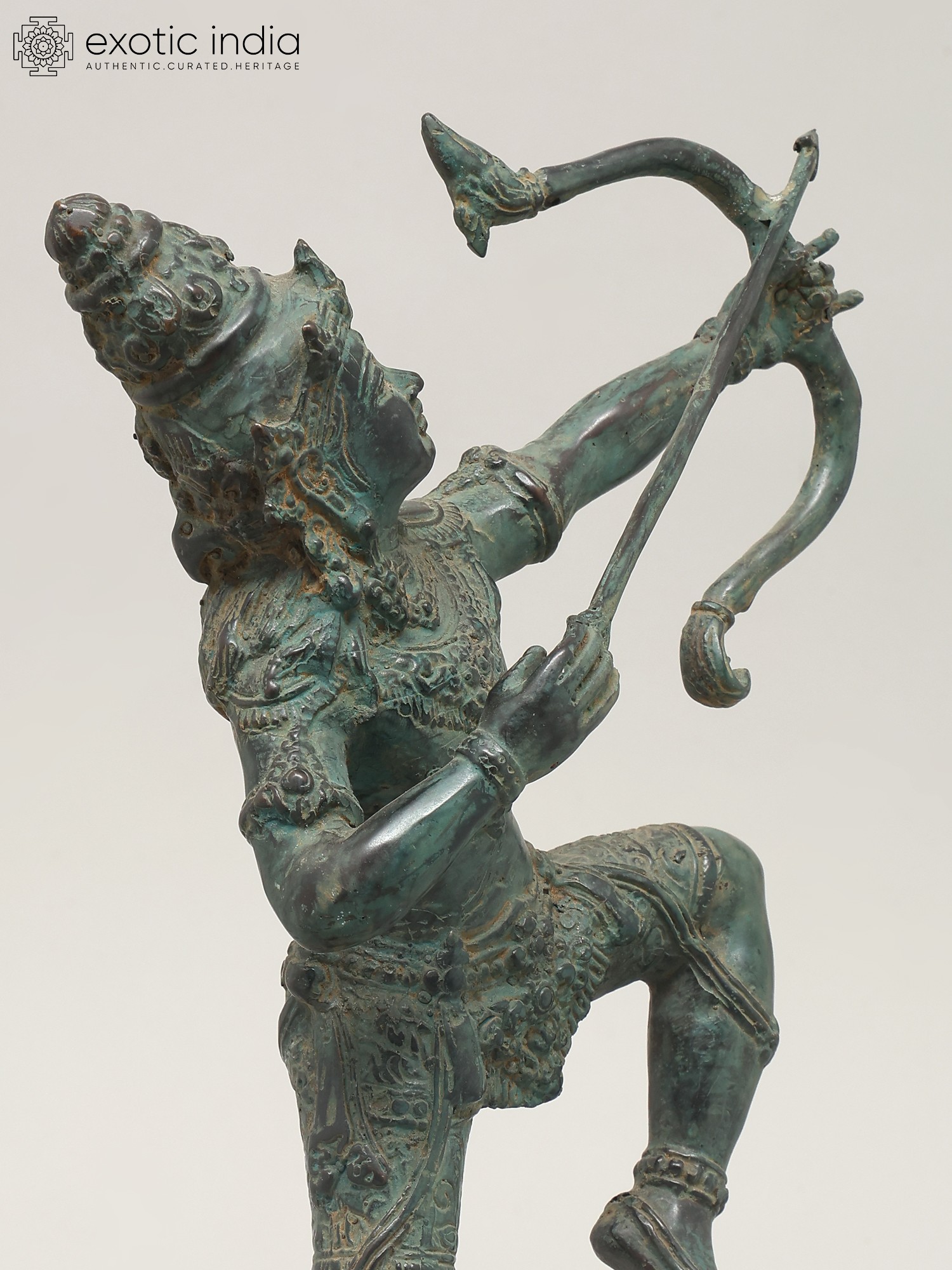 Behold a captivating representation of martial prowess, rendered in the ancient and revered tradition of Balinese artistry. This striking piece depicts a legendary warrior, poised in a dynamic stance, bow drawn, ready to unleash his formidable skill. The intricate details of his attire, from the elaborate headgear to the decorative bands adorning his limbs, speak to a figure of great importance and nobility. Note the carefully etched patterns on his garments, each a testament to the artisan's dedication and mastery. The verdigris finish lends an aged, timeless quality to the sculpture, evoking the feeling of a treasured artifact unearthed from centuries past.