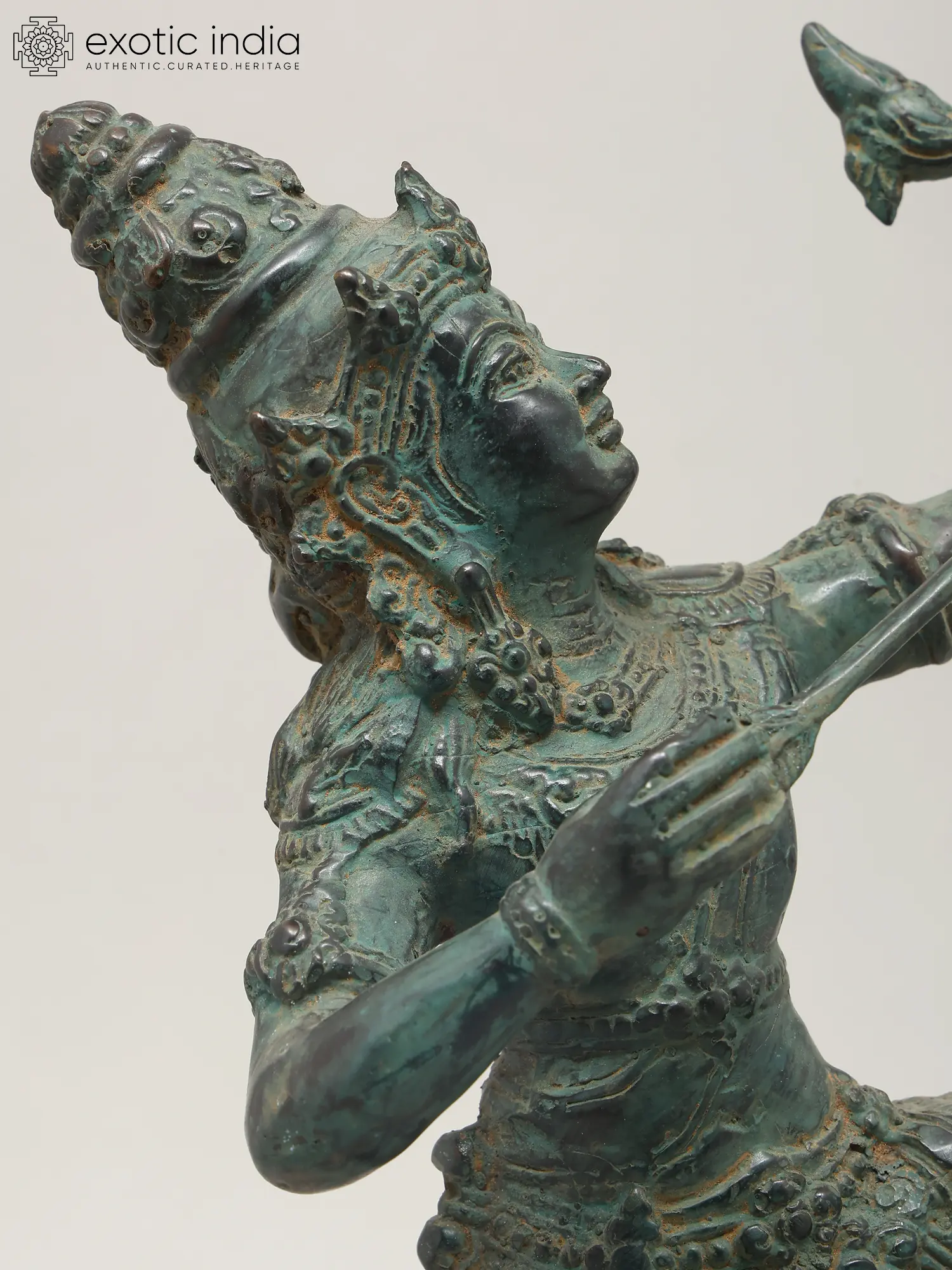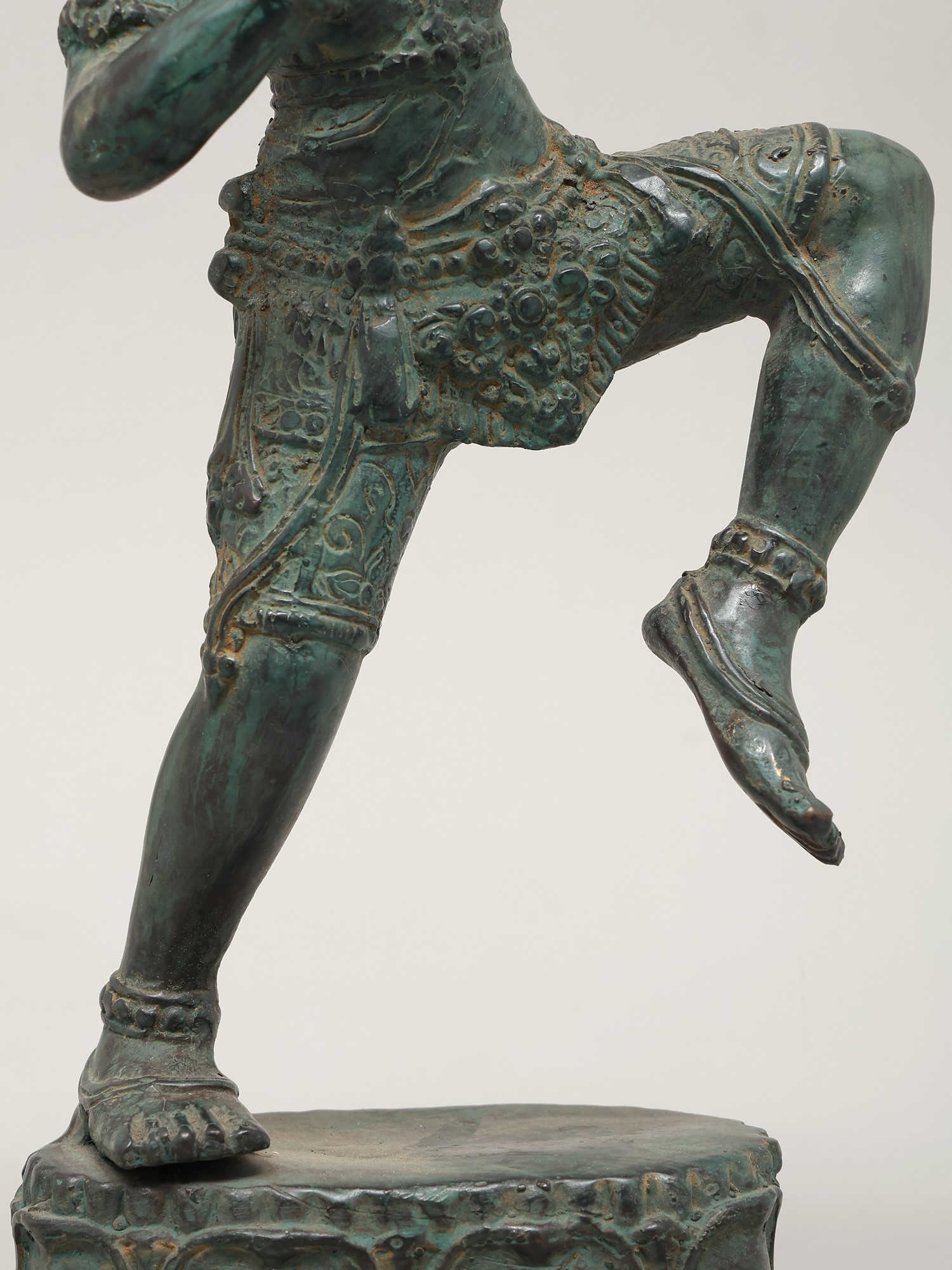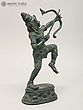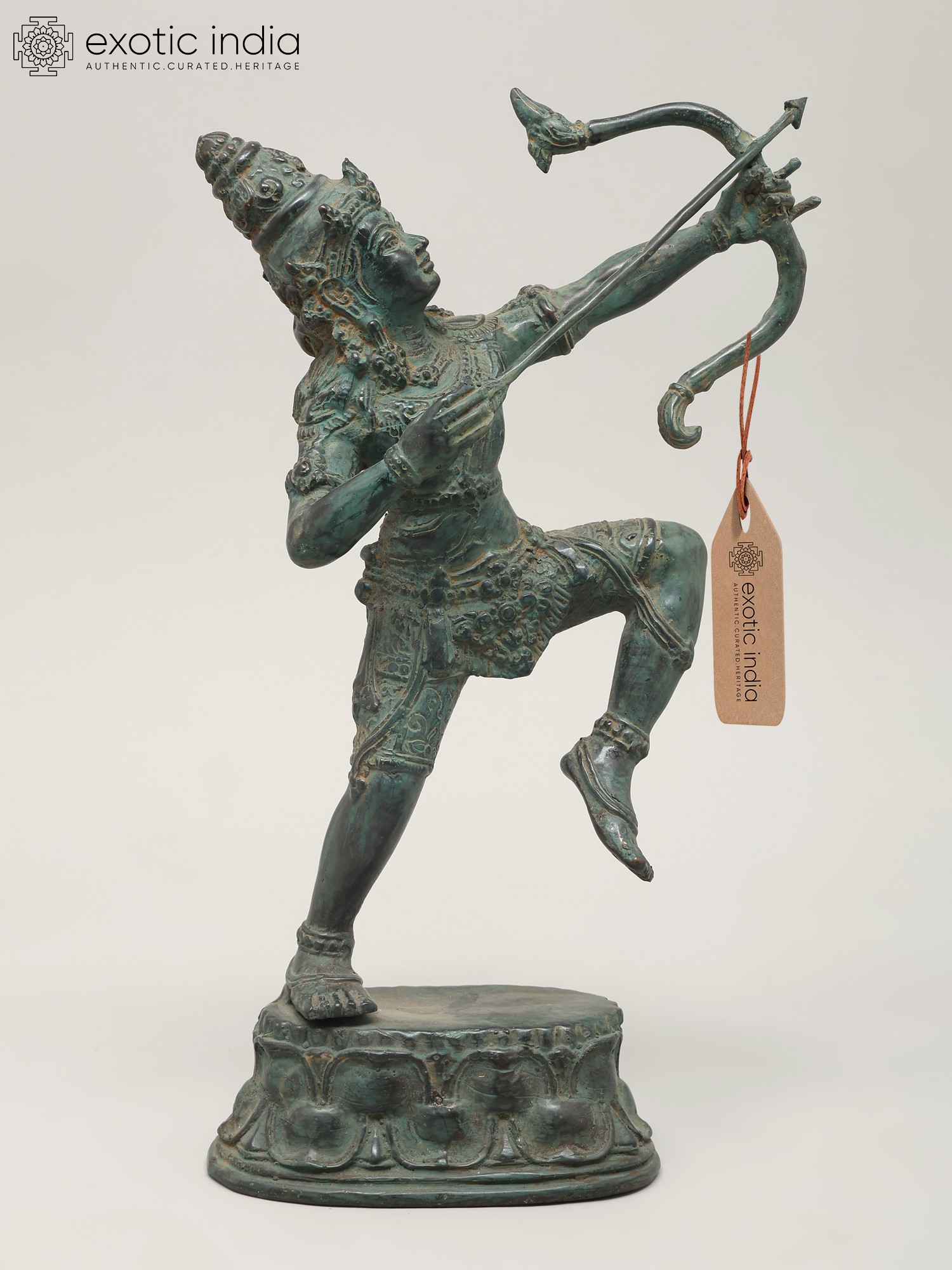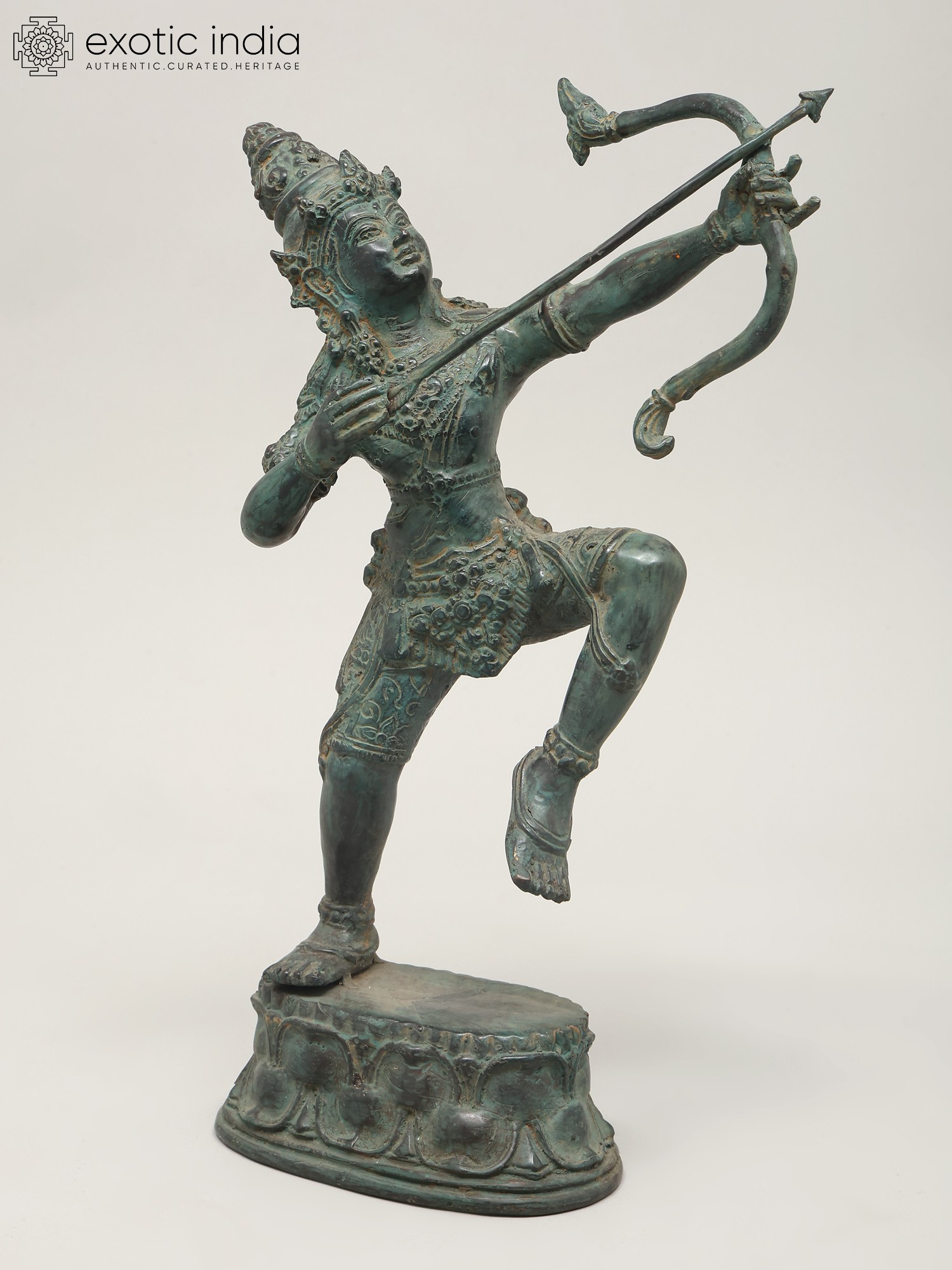 Behold a captivating representation of martial prowess, rendered in the ancient and revered tradition of Balinese artistry. This striking piece depicts a legendary warrior, poised in a dynamic stance, bow drawn, ready to unleash his formidable skill. The intricate details of his attire, from the elaborate headgear to the decorative bands adorning his limbs, speak to a figure of great importance and nobility. Note the carefully etched patterns on his garments, each a testament to the artisan's dedication and mastery. The verdigris finish lends an aged, timeless quality to the sculpture, evoking the feeling of a treasured artifact unearthed from centuries past.