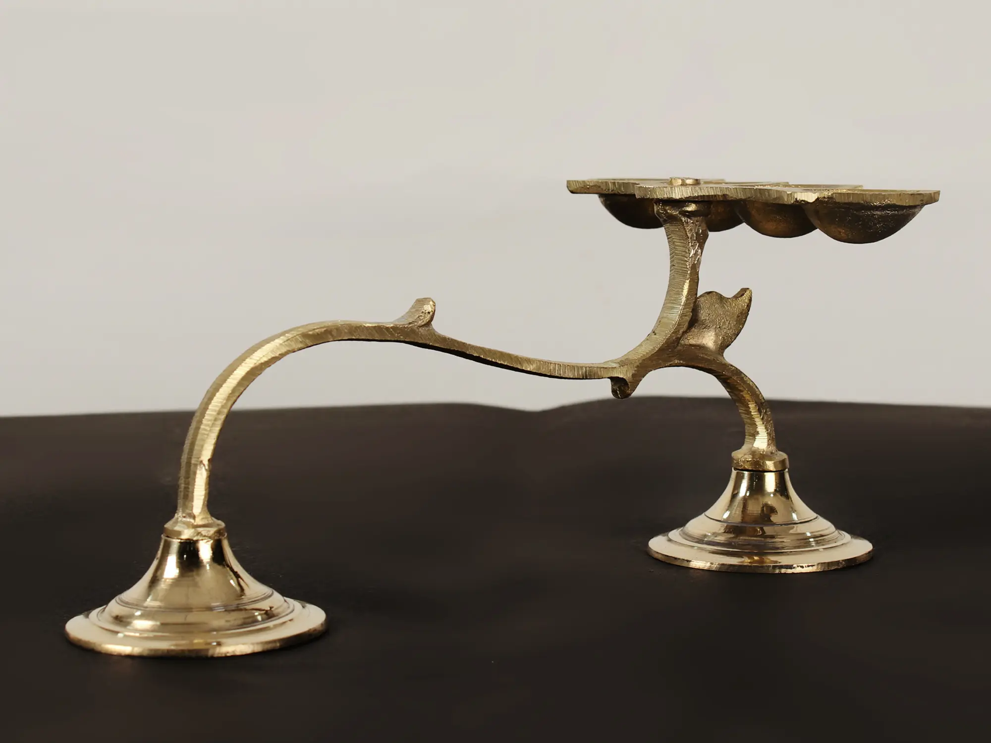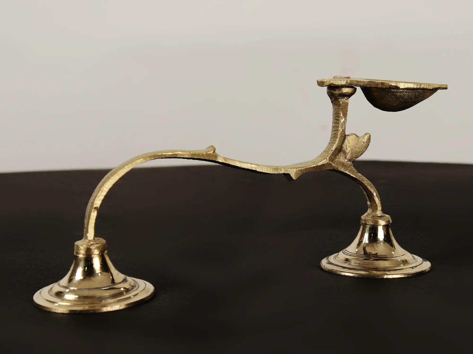 This single-wick handheld lamp is a simple yet stunning brass Diya symbolizing the road from darkness to light. The lamp, with its basic body and solitary wick, is the most traditional type and is the best way to start daily devotional practice. It comes with a handle and an elevated stand with two legs, atypical for Aarti Diya’s. It contains a shallow oil basin and can be used for Camphor Aarti as well. Adding this Diya to the daily rituals of offering fire to the deities will bring their blessings.