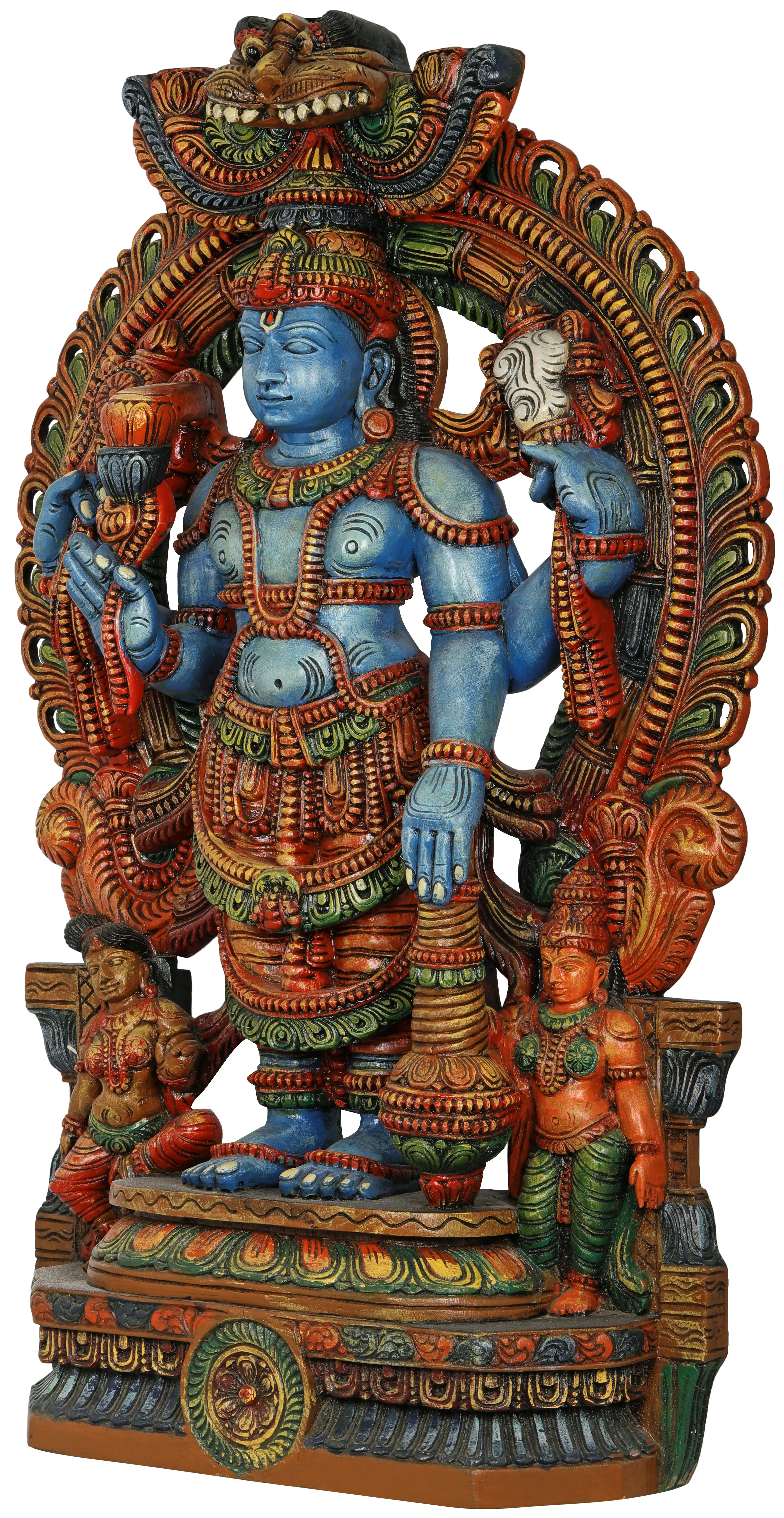 This exquisite wooden carving depicts Lord Vishnu in his awe-inspiring standing posture, a symbol of cosmic order and unwavering protection. His serene, azure-hued form emanates divine grace, representing the vastness of the sky and the infinite nature of existence. Lord Vishnu, the preserver of the universe in Hindu tradition, is shown with his iconic four arms, each carrying symbols of his power and divine attributes. In his hands, he holds a conch shell, representing the primal sound of creation; a discus, the wheel of time and righteousness; a mace, a symbol of authority and strength; and a lotus, signifying purity and spiritual growth. The intricate detailing of his garments and ornaments speaks to the opulence and grandeur associated with this supreme deity. ––––––––––
