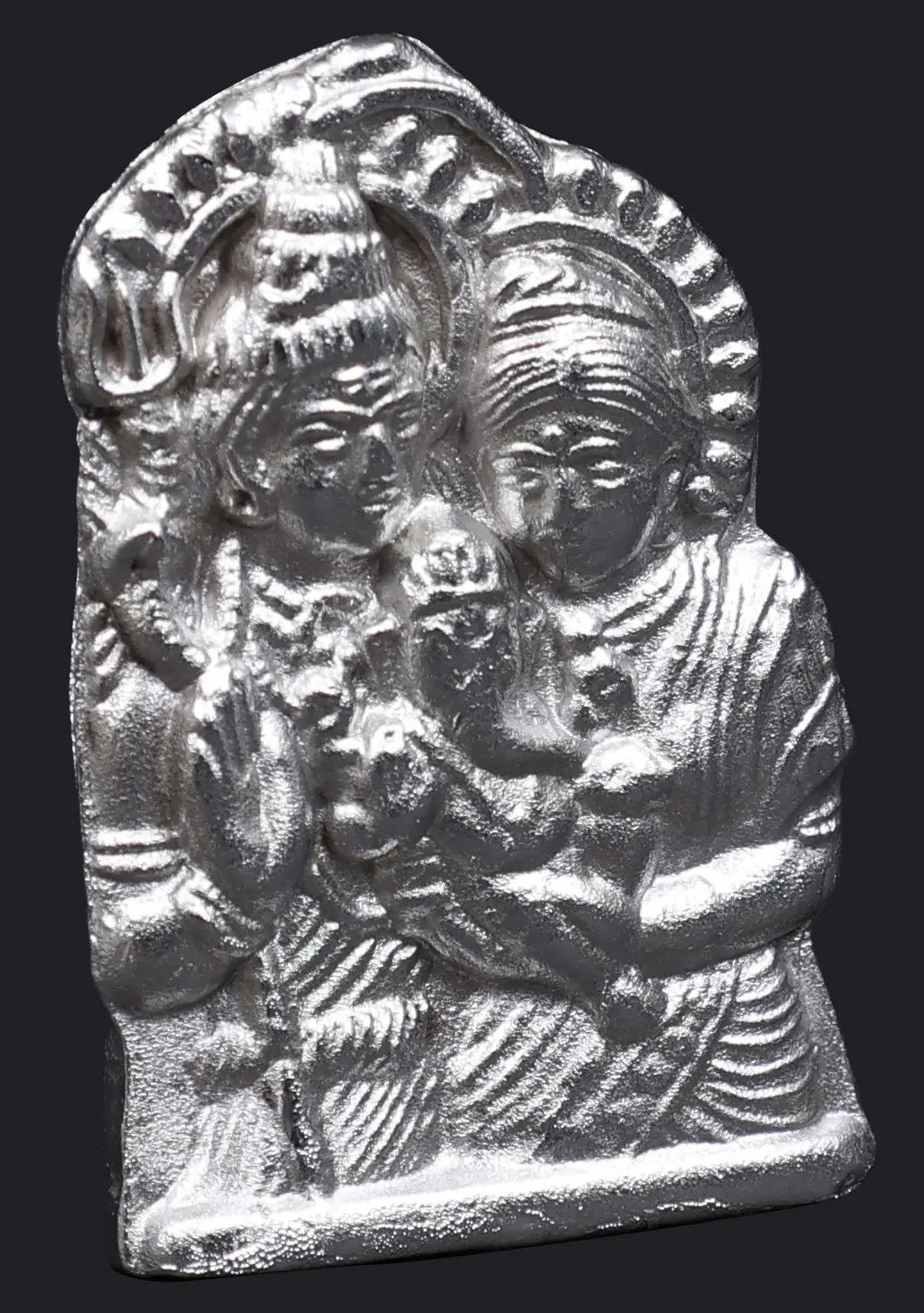 Behold a truly sacred depiction of the divine family, capturing a moment of profound love and protection. This exquisite metallic effigy portrays the beloved elephant-headed deity, Lord Ganesha, cradled tenderly in the loving arms of his divine parents, Lord Shiva and Goddess Parvati. Each detail is rendered with meticulous care, reflecting the spiritual significance and revered status of these celestial beings within Hindu tradition.