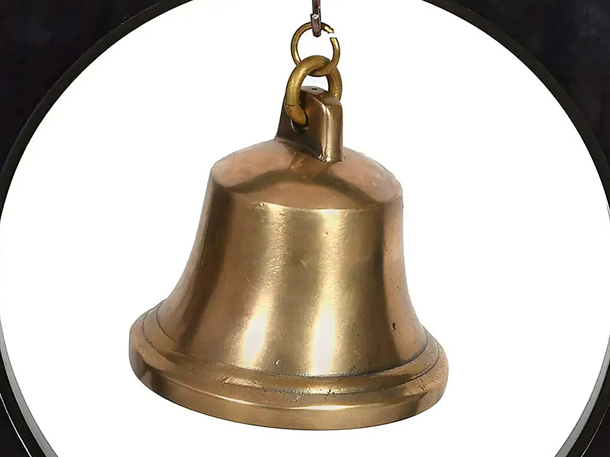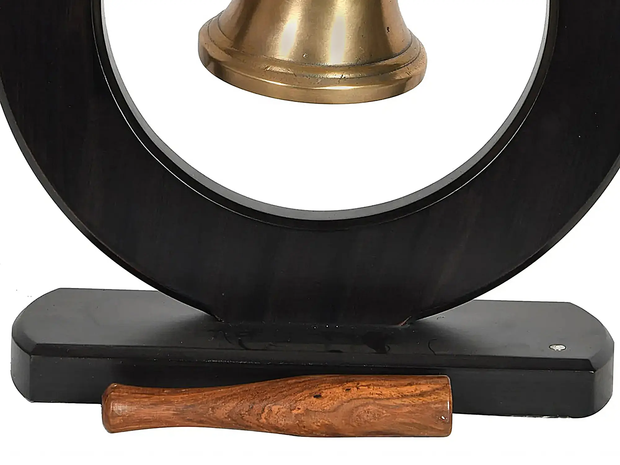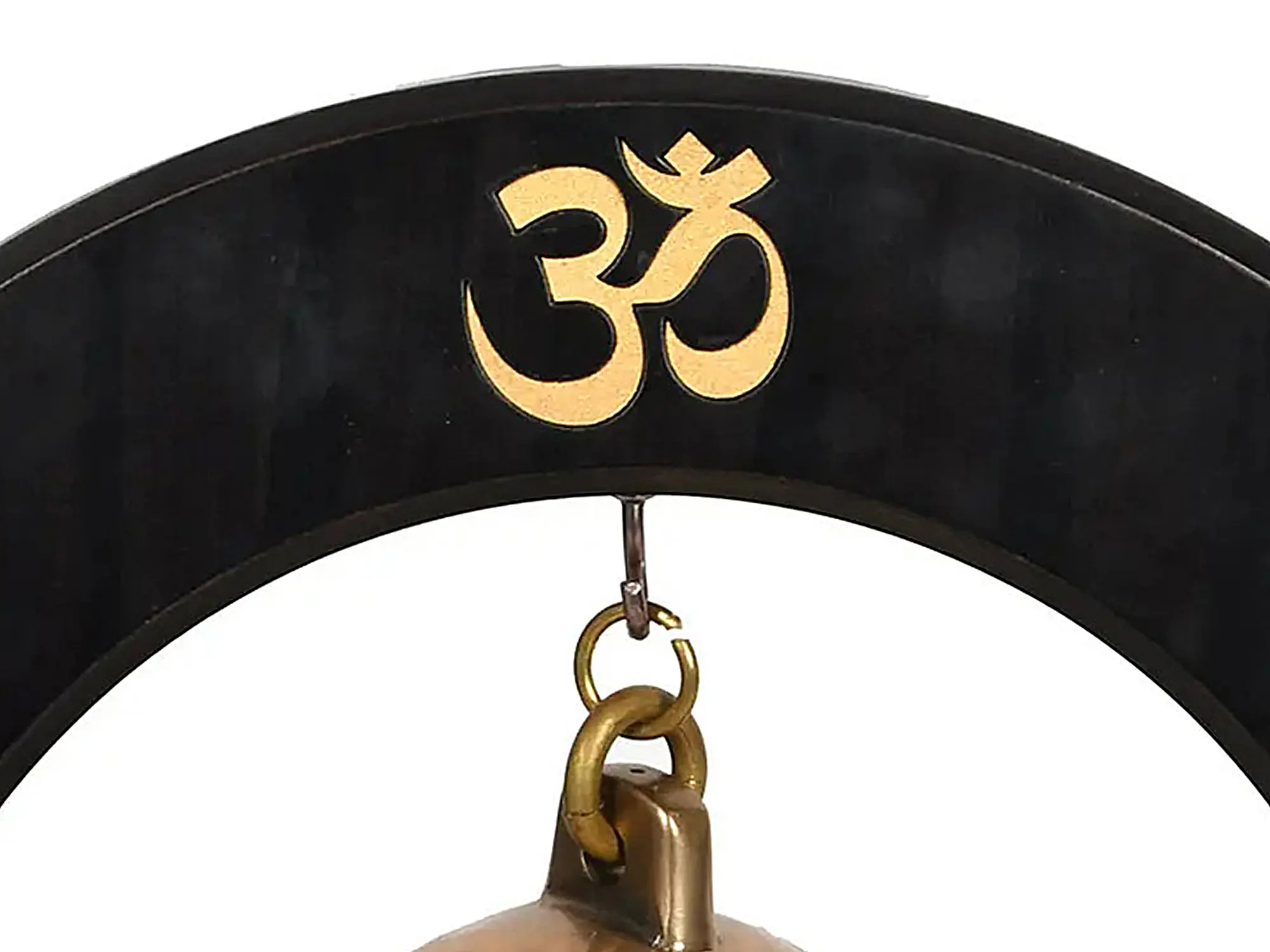 The symbol of Om, a bell, and the color black are all uniquely related. Om is the primordial sound and the sound of creation; a bell produces sacred sounds that can travel to any cosmos without getting destroyed, and the color black is endless and absorbs all colors. This statue of a brass bell placed inside a circular aureole made of black wood and blessed with the symbol of Om is a ritual object that mixes all the sacred symbolism and presents it in the form of this magnificent bell structure with a mallet.