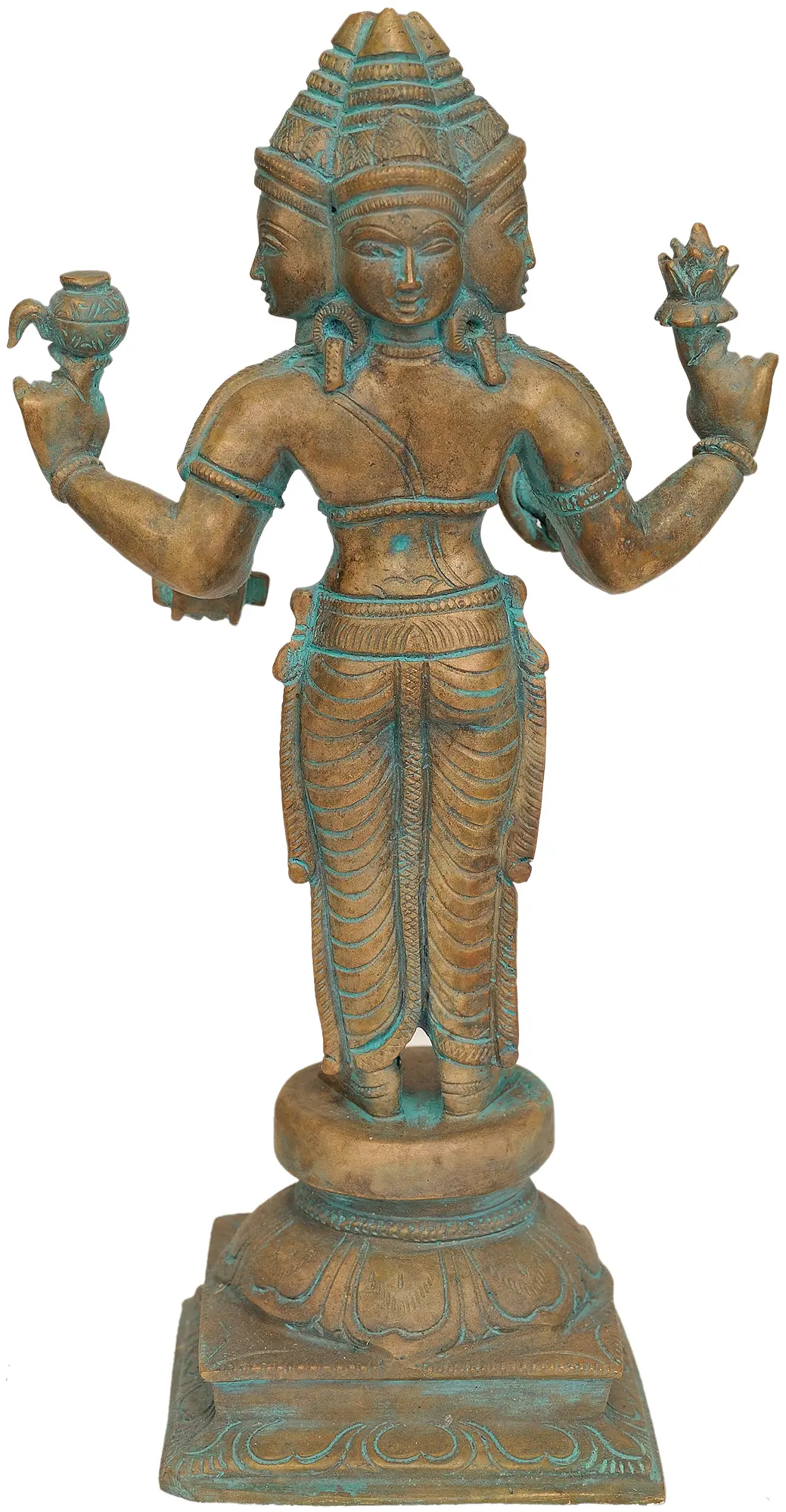 This exquisite bronze statue depicts Bhagawan Brahma, the revered Hindu deity credited with the creation of the universe. As one of the Trimurti, alongside Vishnu the preserver and Shiva the destroyer, Brahma stands as the primordial creator, the source from which all existence flows. His four heads, a prominent feature of this magnificent sculpture, are said to represent the four Vedas, the ancient scriptures of Hinduism, and also symbolize his omnipresence, allowing him to perceive all directions. The artistic mastery evident in this bronze piece transports us to the hallowed workshops of Swamimalai, a region renowned for its centuries-old tradition of bronze casting. The artisans here, inheritors of a rich lineage, employ the lost-wax technique, a method that has been perfected over generations, to bring divine forms to life. Each intricate detail, from the serene expressions on the four faces to the graceful drape of the dhoti, speaks volumes of the skill and devotion infused into its creation. The patina, a subtle verdigris finish, lends an aura of antiquity and sacredness, suggesting a lineage that stretches back through time.