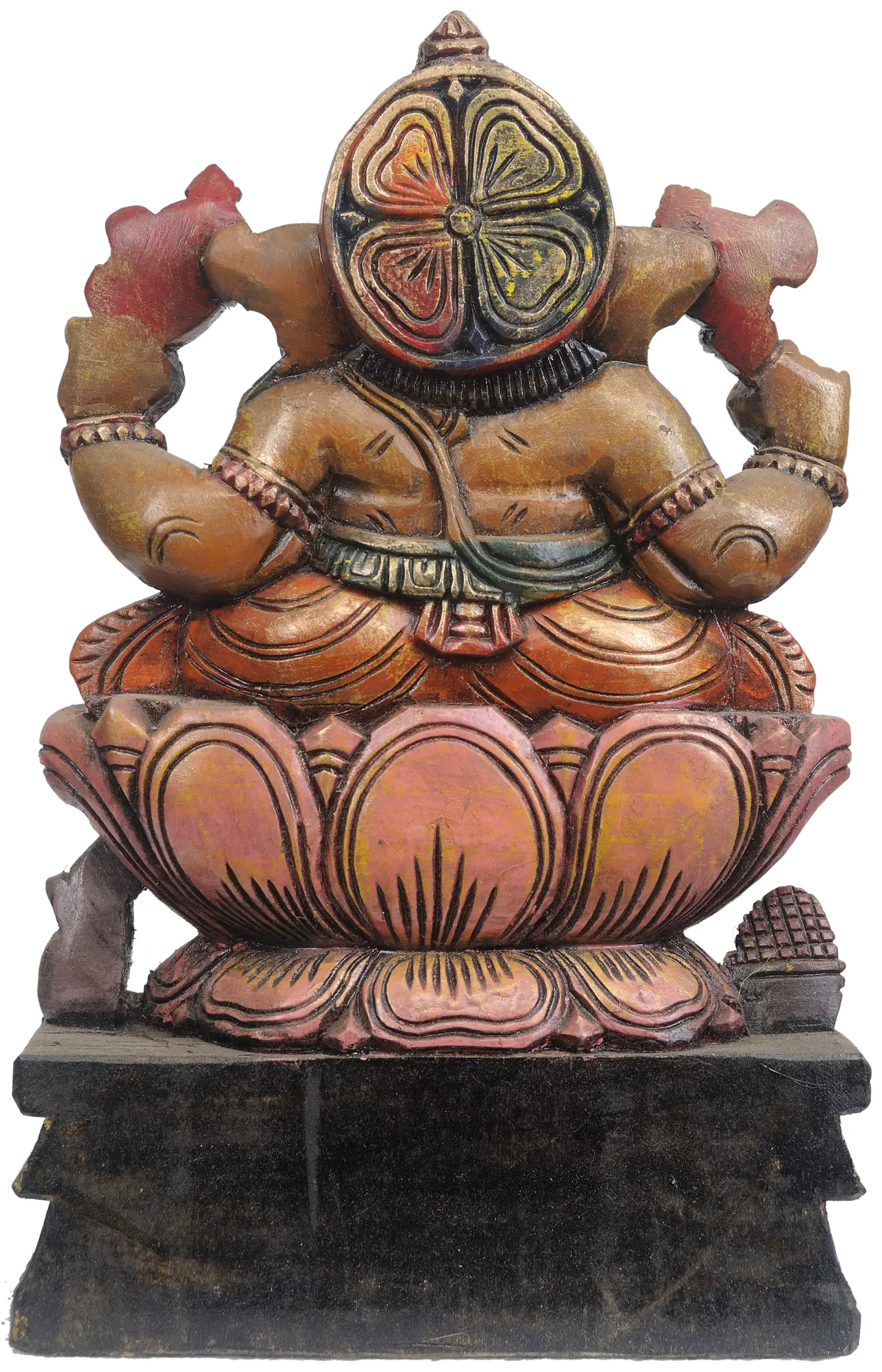 Behold a handcrafted wooden statue that embodies the auspicious presence of Ganesha, the beloved elephant-headed deity revered throughout the Hindu pantheon. This exquisite carving captures the essence of Ganesha, known as the remover of obstacles, the patron of arts and sciences, and the deva of intellect and wisdom. His image is invoked at the beginning of rituals and ceremonies, signifying a fresh start and the promise of success. Ganesha's unique form, with his elephant head and human body, is rich in symbolism. His large head represents wisdom and intellect, while his large ears signify his ability to listen to the pleas of his devotees. His trunk, capable of uprooting trees, symbolizes adaptability and efficiency. The single tusk represents the ability to overcome duality and retain what is good, discarding the bad.