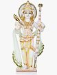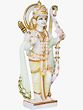 Here Lord Rama is depicted as standing on a rectangular pedestal; left hand holds a dhanush (bow), his weapon, very uniquely designed with a tiger face at the top and paw at the base symbolizing the power and force as that of a tiger; right hand is in a gesture of blessing. A yellow colored dhoti and a green colored stole hanging on his arms complements with the true and pure white color of the body. He wears a beautiful flower garland and also graced with awe struck ornaments. A bag of bana (arrow) is hung across his body and can be seen behind the right shoulder. Short and dense hair resting on his neck at the back, half covered by an astounding crown; nimbus glowing, is an additional attribute of his supreme divinity.