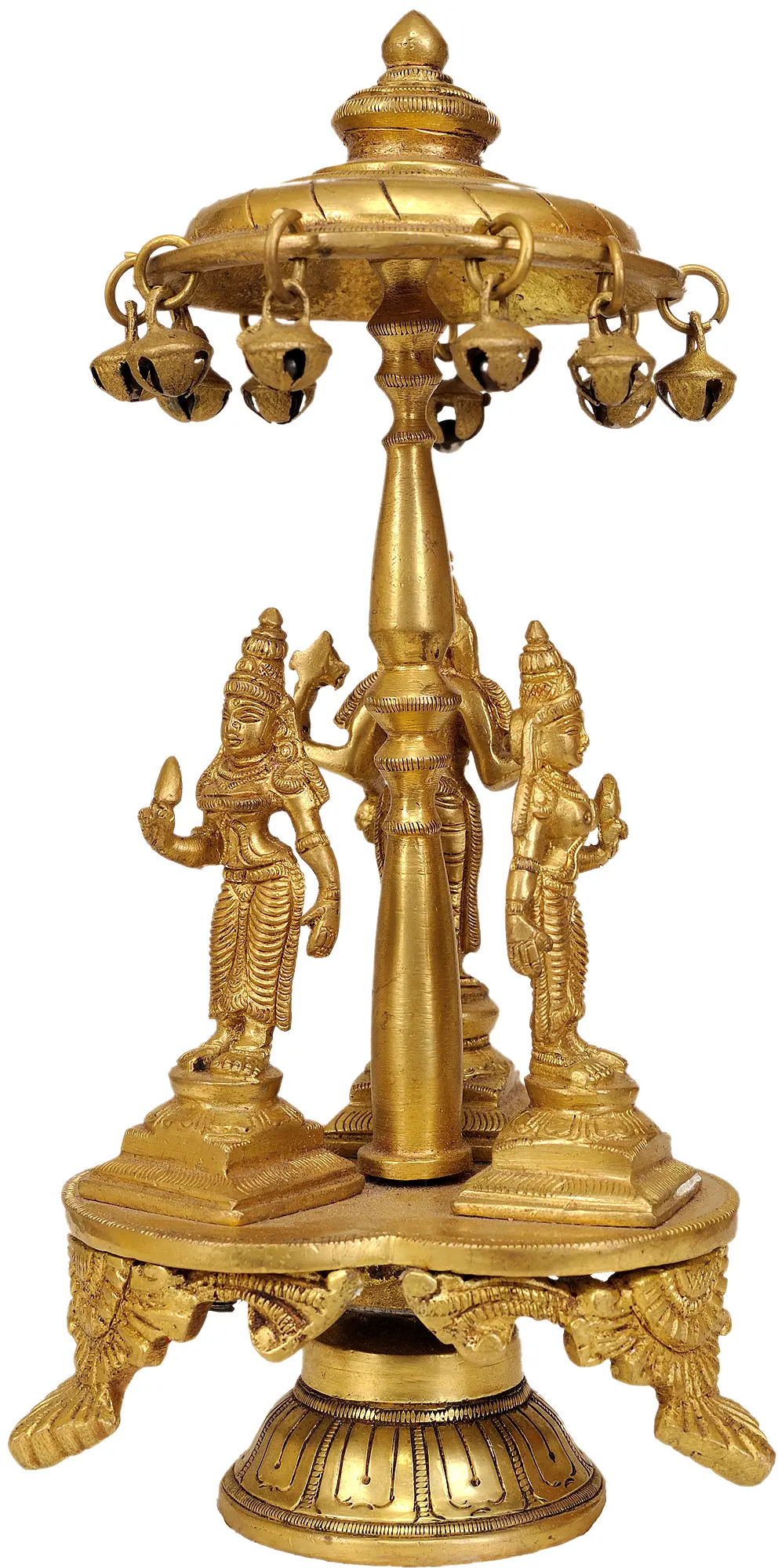 The canopy above the deities, adorned with small, jingling bells, adds another layer of symbolic meaning. These bells are often associated with auspicious sounds that ward off negative energies and invite positive vibrations. In many Hindu traditions, the sound of bells is believed to awaken deities and symbolize the unfolding of divine consciousness. The intricate carvings on the base further enhance the aesthetic appeal and spiritual significance of the sculpture, showcasing the artistry and devotion poured into its creation. The brass material itself holds cultural importance, revered for its purity and durability. It is believed to amplify divine energies and radiate positive auras. This statue is more than just an artistic representation; it is a conduit for divine blessings, a reminder of the eternal principles of creation, sustenance, and prosperity.
